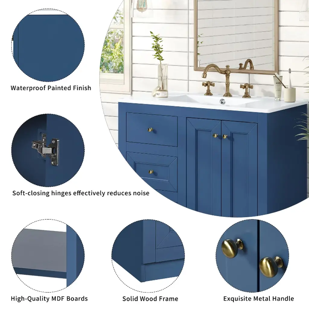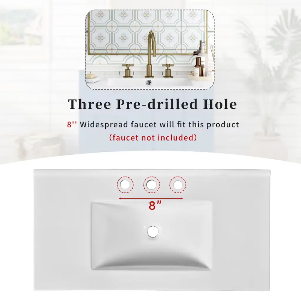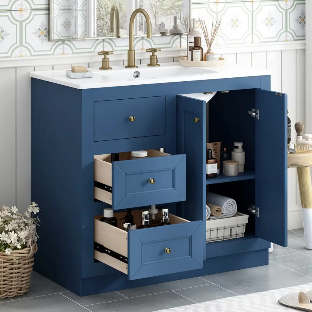 36inch Bathroom Vanity with Ceramic Sink, Bathroom Storage Cabinet with 2 Drawers This 36-inch blue ceramic basin bathroom cabinet is carefully designed to combine modernity and practicality, adding a touch of bright color to your bathroom. The high-quality ceramic basin is matched with smooth lines, and the smooth surface is easy to clean, durable and stain-resistant. The cabinet body is made of high-density environmentally friendly board, which is stable and durable, moisture-proof and waterproof, ensuring stability for long-term use. The cabinet design includes two drawers and a storage cabinet, providing abundant storage space to help you easily store bath towels, toiletries and other daily necessities. The drawer adopts a silent slide design, which opens and closes smoothly, greatly improving the user experience. Whether it is a simple modern or classic style bathroom, this bathroom cabinet can be perfectly integrated, bringing a refreshing and tidy visual effect, making your bathroom both practical and beautiful. Amber Storage The cabinet design includes two drawers and a storage cabinet, providing abundant storage space to help you easily store bath towels, toiletries and other daily necessities. The drawer adopts a silent slide design, which opens and closes smoothly, greatly improving the user experience. Sturdy and Durable The high-quality ceramic basin is matched with smooth lines, and the smooth surface is easy to clean, durable and stain-resistant. The cabinet body is made of high-density environmentally friendly board, which is stable and durable and waterproof, ensuring the stability of long-term use Ceramic Sink Please note that 8-inch center faucets are compatible with this sink (faucet not included).
