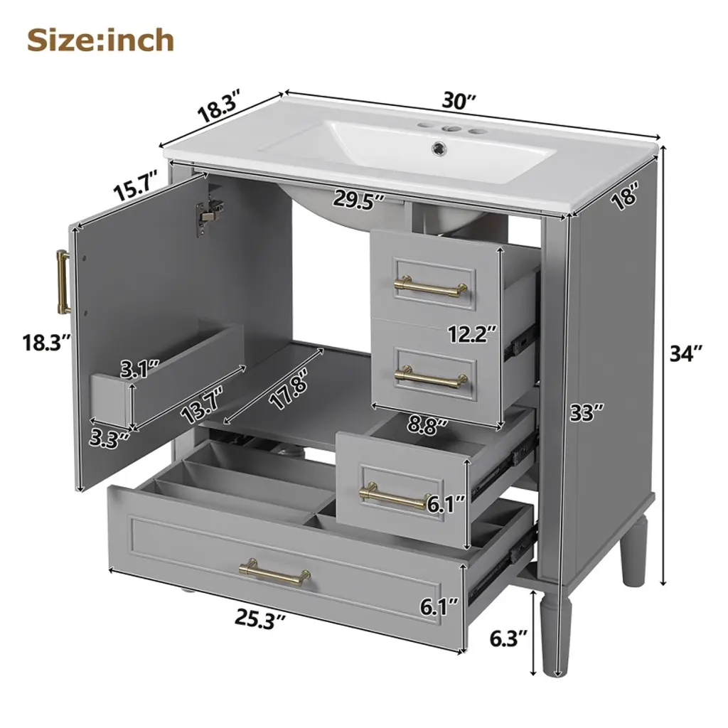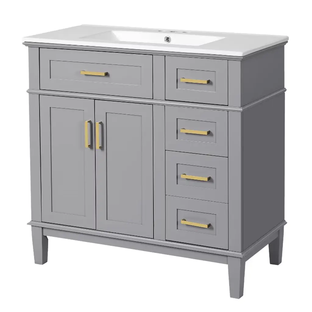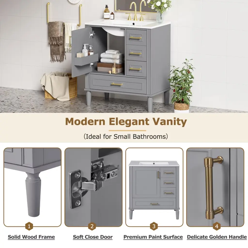 30" Gray Bathroom Vanity Set, Floor Standing, with Three Drawers, Soft Close Door Transform Your Bathroom into a Sanctuary With a perfect size of 30" * 18.3" * 34", this elegant cabinet is the ideal companion for compact bathrooms, effortlessly enhancing your space. The easy-to-clean ceramic basin, with its thoughtful overflow drain, ensures a dry and serene environment. Its sturdy construction, blending solid wood and premium MDF, promises lasting quality. The soft-close door and three drawers offer generous storage, elegantly organizing your essentials. The gray exterior evokes a sense of calm, while the gold handles add a subtle touch of luxury. Assembly is a breeze with clear instructions, allowing you to create a tranquil, modern retreat in no time. Every detail is crafted to elevate your bathroom, transforming it into a space of beauty and functionality. Timeless Elegance The gray finish and delicate gold handles create a timeless style, adding a serene and elegant touch to your bathroom with simplicity and grace. Generous Storage Solution The soft-close door and three drawers offer generous storage, perfect for organizing your bathroom essentials and keeping everything neat and accessible. Durable and Long-lasting Crafted with a solid wood frame and MDF, this cabinet is built to last, remaining strong and reliable even in humid conditions.