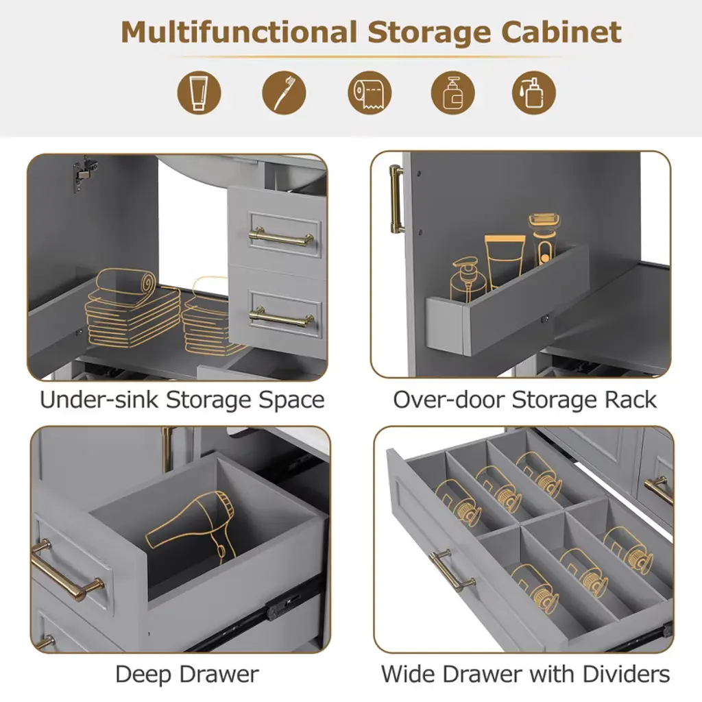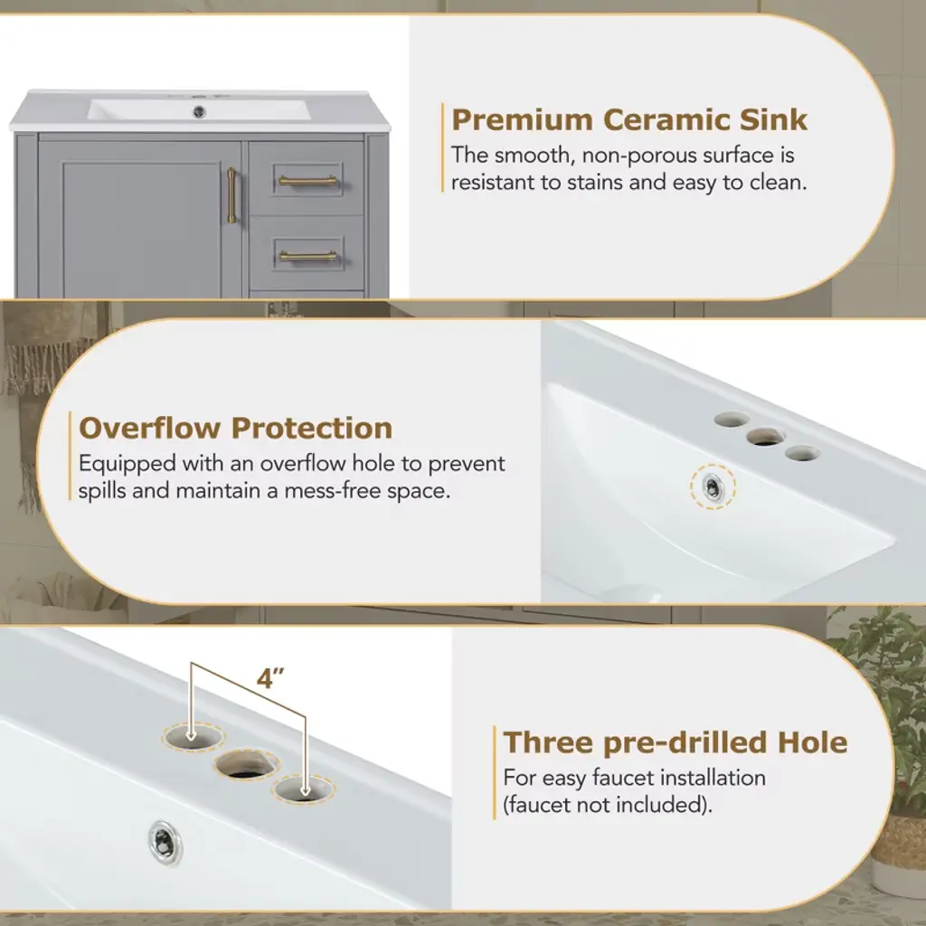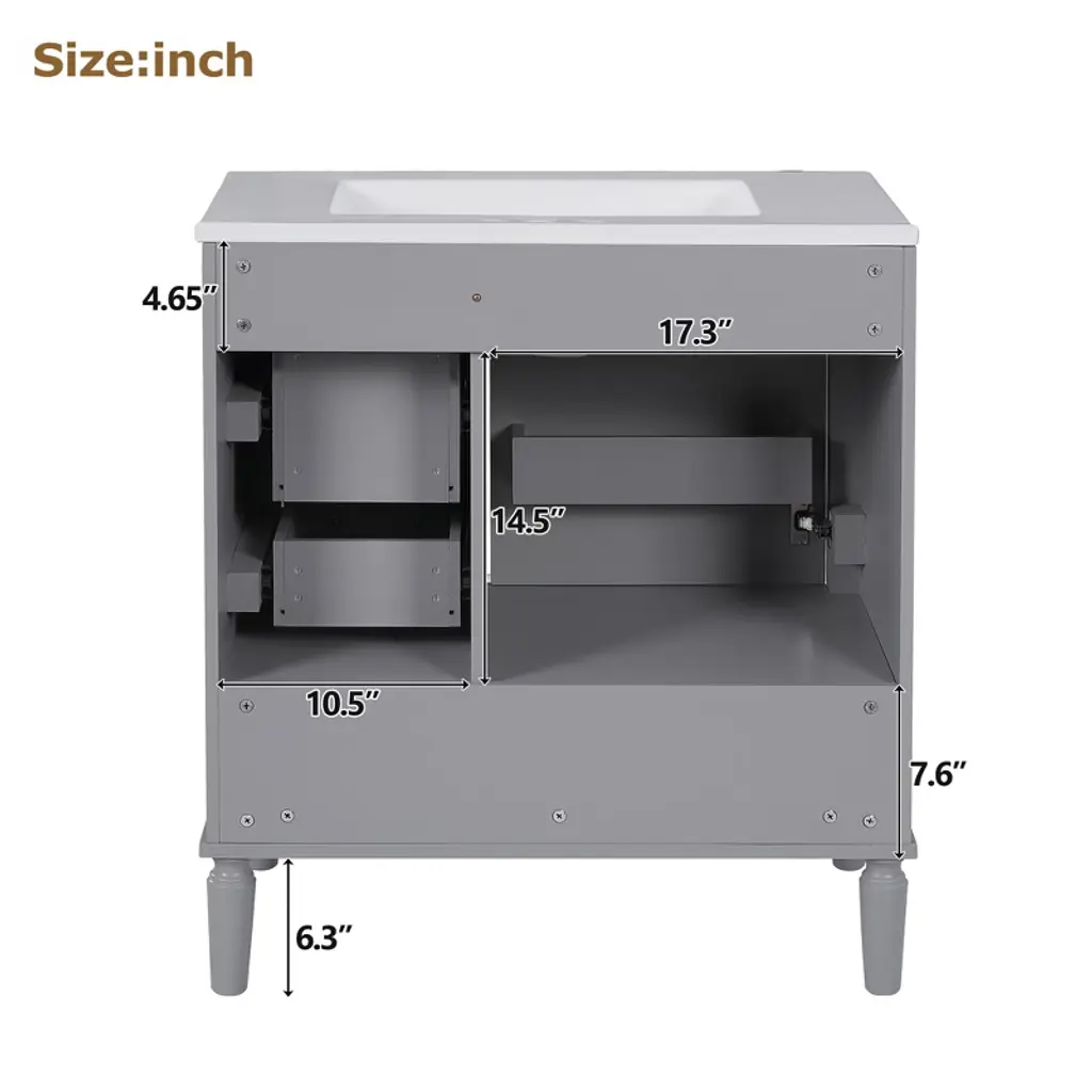 30" Gray Bathroom Vanity Set, Floor Standing, with Three Drawers, Soft Close Door Transform Your Bathroom into a Sanctuary With a perfect size of 30" * 18.3" * 34", this elegant cabinet is the ideal companion for compact bathrooms, effortlessly enhancing your space. The easy-to-clean ceramic basin, with its thoughtful overflow drain, ensures a dry and serene environment. Its sturdy construction, blending solid wood and premium MDF, promises lasting quality. The soft-close door and three drawers offer generous storage, elegantly organizing your essentials. The gray exterior evokes a sense of calm, while the gold handles add a subtle touch of luxury. Assembly is a breeze with clear instructions, allowing you to create a tranquil, modern retreat in no time. Every detail is crafted to elevate your bathroom, transforming it into a space of beauty and functionality. Timeless Elegance The gray finish and delicate gold handles create a timeless style, adding a serene and elegant touch to your bathroom with simplicity and grace. Generous Storage Solution The soft-close door and three drawers offer generous storage, perfect for organizing your bathroom essentials and keeping everything neat and accessible. Durable and Long-lasting Crafted with a solid wood frame and MDF, this cabinet is built to last, remaining strong and reliable even in humid conditions.