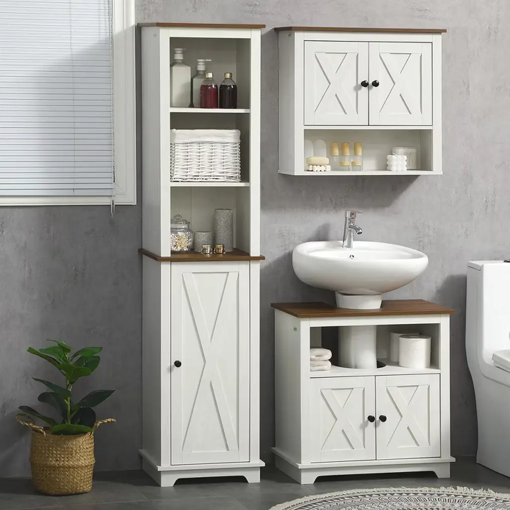 Shelving on top provides an open and conveniently accessible reach to your belongings in a triple set of cubbyholes, letting guests access toilet paper or towels, while a on bottom keeps daily hygiene products, cleaning supplies, and other bathroom necessities neatly tucked away on two shelves behind closed doors for a clean and tidy looking space.