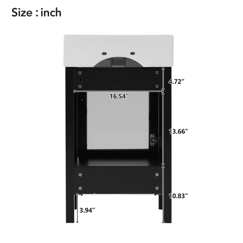 20-Inch bathroom vanity with ceramic sink and ample storage Upgrade your bathroom with our modern and compact bathroom vanities. This space-saving solution measures 20.28*15.16*34.84 inches, making it perfect for small bathrooms. Ample Storage This bathroom cabinet is made with solid wood legs and MDF cabinet to ensure durability and stability. Plenty of storage space allows you to store essential bathroom toiletries, and the drawers can protect hair dryers and other items. Premium Quality The ceramic one-piece basin is not only elegant but also easy to clean, while the pre-drilled faucet hole and overflow prevention add convenience and safety. Noise-Free Operation The soft-closing door allows for quiet and noise-free operation, adding tranquility to your daily life. The modern and minimalist design enhances the overall aesthetics of the bathroom. Upgrade your small bathroom today with this stylish and functional bathroom vanity. Functional Drawers for Organized Storage Spacious drawers help keep your bathroom essentials neatly organized and within reach. Silver Handles for Modern Style The silver handles add a sleek, refined touch, enhancing the vanity’s modern and stylish appeal. Open Back for Easy Plumbing Designed with an open back panel, this vanity allows easier access to plumbing during setup. It supports a more straightforward installation process and accommodates different bathroom layouts. A practical solution for daily use, remodels, or new fittings.