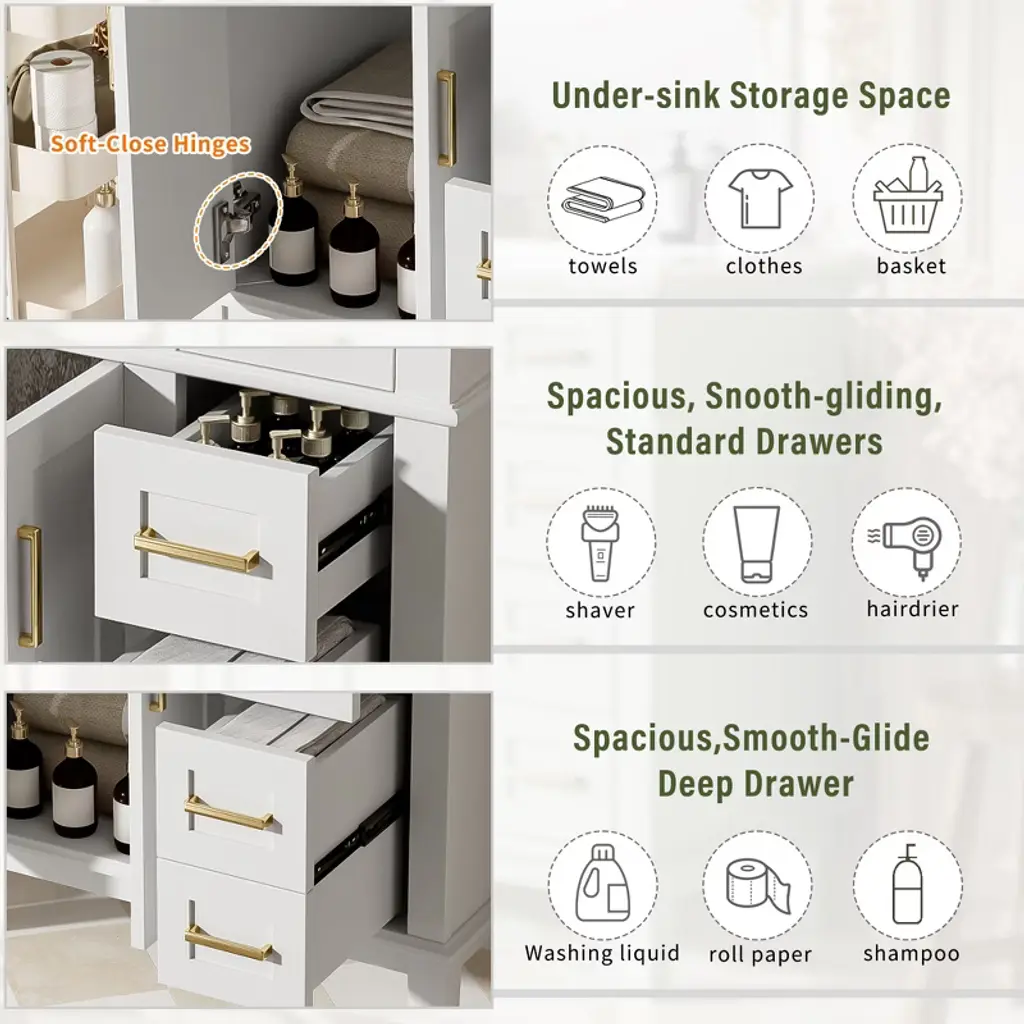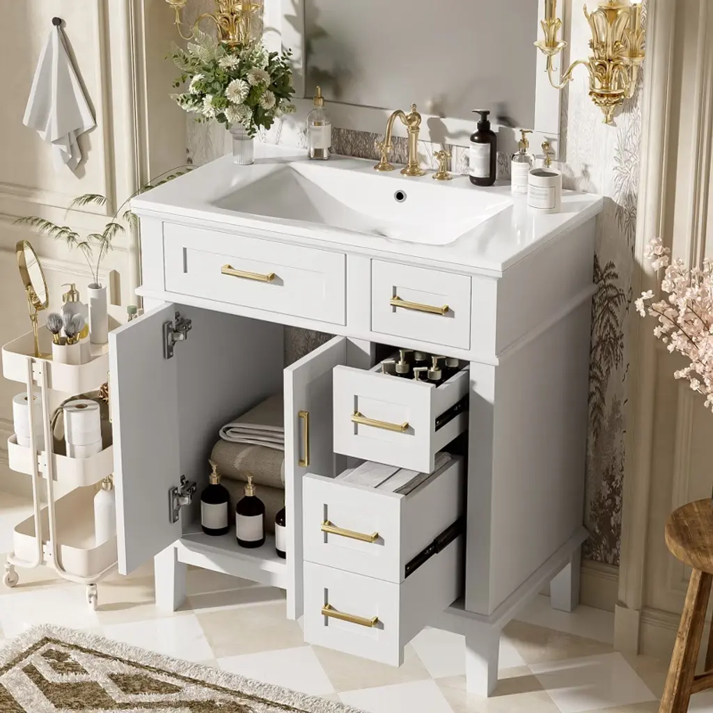 30" Bathroom Vanity with Ceramic Sink, Modern Storage Cabinet Upgrade your bathroom with this stylish and functional 30" vanity. Designed for small spaces, it maximizes storage with a deep drawer, a standard drawer, and a spacious under-sink cabinet—keeping your essentials organized and your bathroom clutter-free. The high-quality ceramic sink is easy to clean and features an overflow hole to prevent spills, ensuring a dry and tidy space. Built with a solid wood frame and premium MDF, this vanity is durable, sturdy, and long-lasting. The soft-close doors and elegant gold handles add a touch of luxury while enhancing everyday comfort. Elevate your bathroom with a perfect blend of beauty, storage, and practicality. Smart & Spacious Storage Smart & Spacious Storage – Deep drawer, standard drawer, and roomy under-sink cabinet provide ample space for toiletries, towels, hairdryers, and more. Durable & Functional Ceramic Sink Scratch-resistant and easy to clean, featuring an overflow hole and three pre-drilled faucet holes for effortless installation. Easy Plumbing Installation Open-back design allows hassle-free pipe connections, making installation quick and convenient. Thoughtful & Quiet Design Soft-close doors prevent slamming, while smooth-gliding drawers and a well-organized layout enhance everyday convenience. Elegant, Practical & Built to Last A stylish blend of beauty and function with a solid wood frame, corrosion-resistant gold handles, and soft-close doors for long-term durability.
