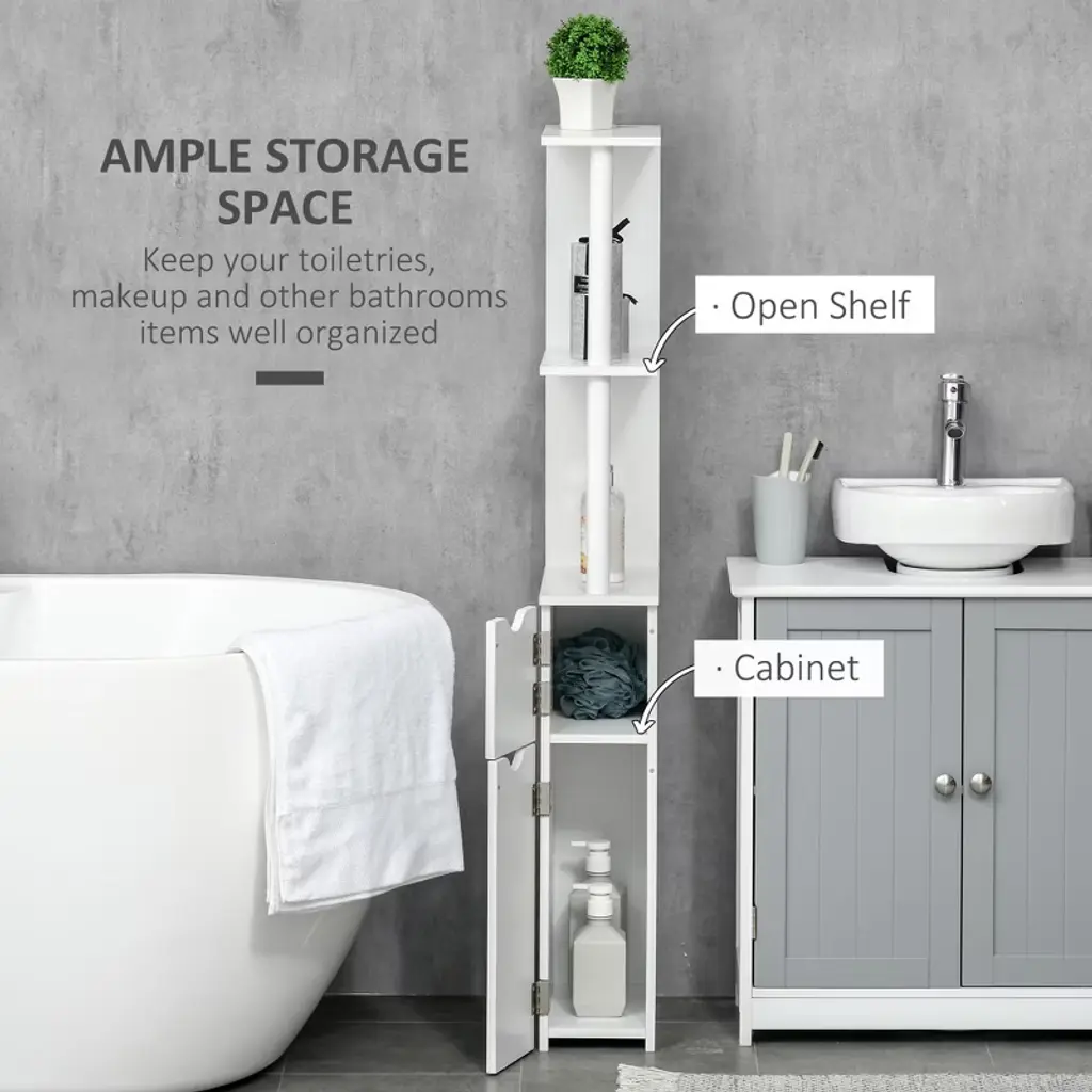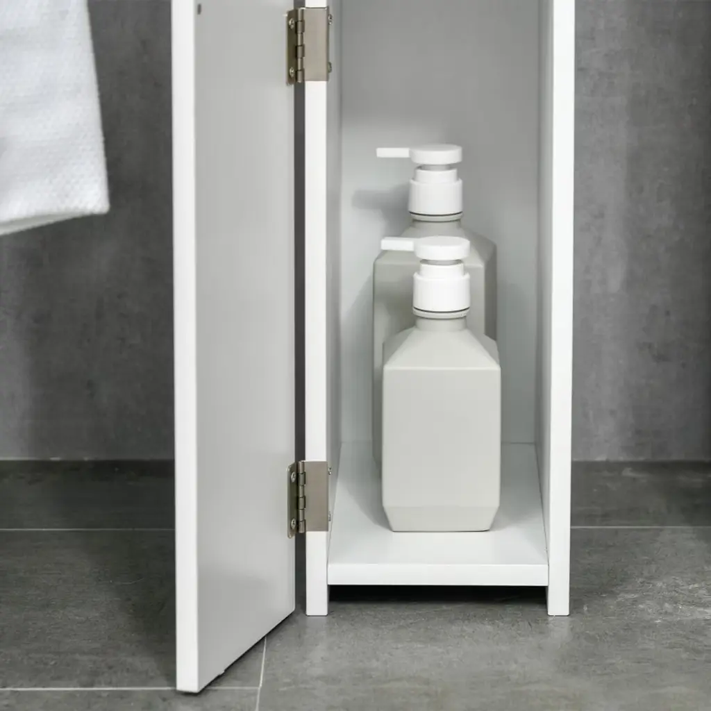 There never seems to be enough storage in the bathroom for everything you need. This slim bathroom storage cabinet has two open shelves and two-door cabinets, so you can store towels, daily hygiene products and cleaning supplies without trying to fit everything under the sink.