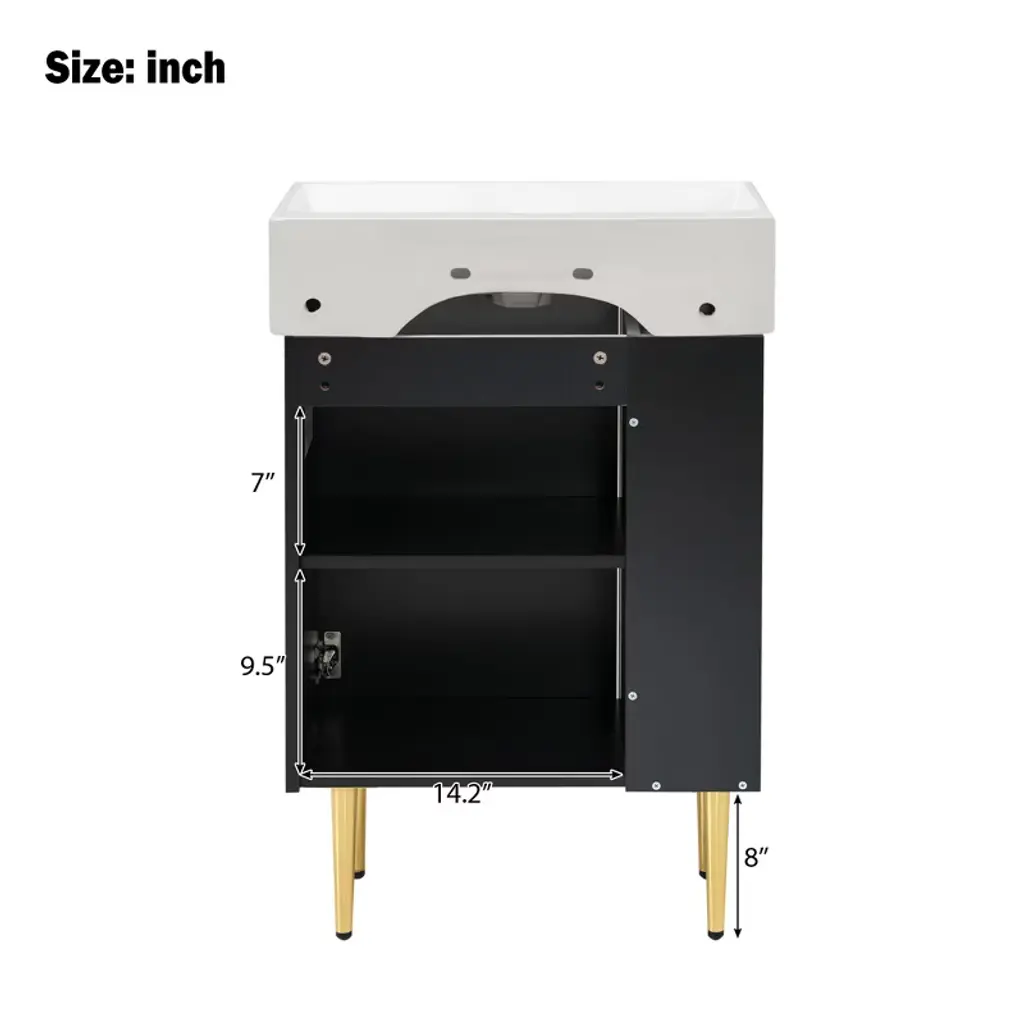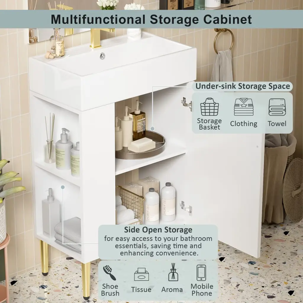 Why Choose This Bathroom Storage Cabinet? This stylish and efficient cabinet not only enhances your bathroom’s aesthetic but also provides the functionality you need for storage. Its contemporary design and smart features, like the ceramic sink and side storage, make it the perfect choice for any modern bathroom. Triple-Coat Finish, Enhanced Protection Triple-coat finish provides effective water and moisture resistance, reducing cracking and peeling for long-lasting use with a balance of style and sustainability. Side Storage, Easy Access Side-open storage allows easy access to small items like phones, toilet paper, and shoe brushes, while the spacious cabinet holds laundry detergent, clothes, and more. Elegant Design, Comfortable Experience Soft-close hinges ensure a quiet opening and closing experience, while adjustable plastic feet enhance stability. The wave-textured surface adds an elegant touch, complemented by gold handles for a modern aesthetic. Semi-Open Back Design Easy plumbing access, enhanced ventilation keeps it dry, fits various bathroom layouts.