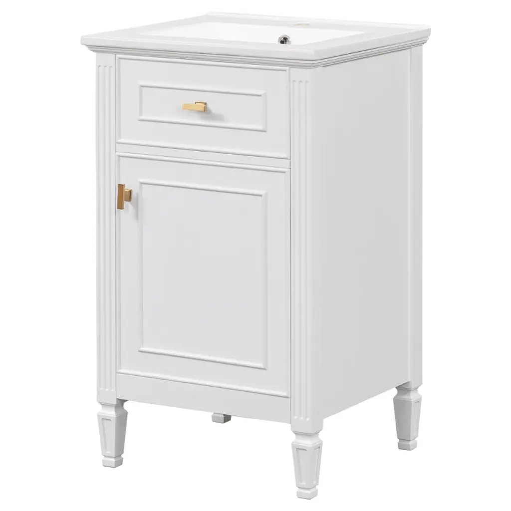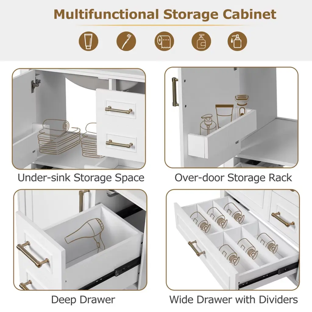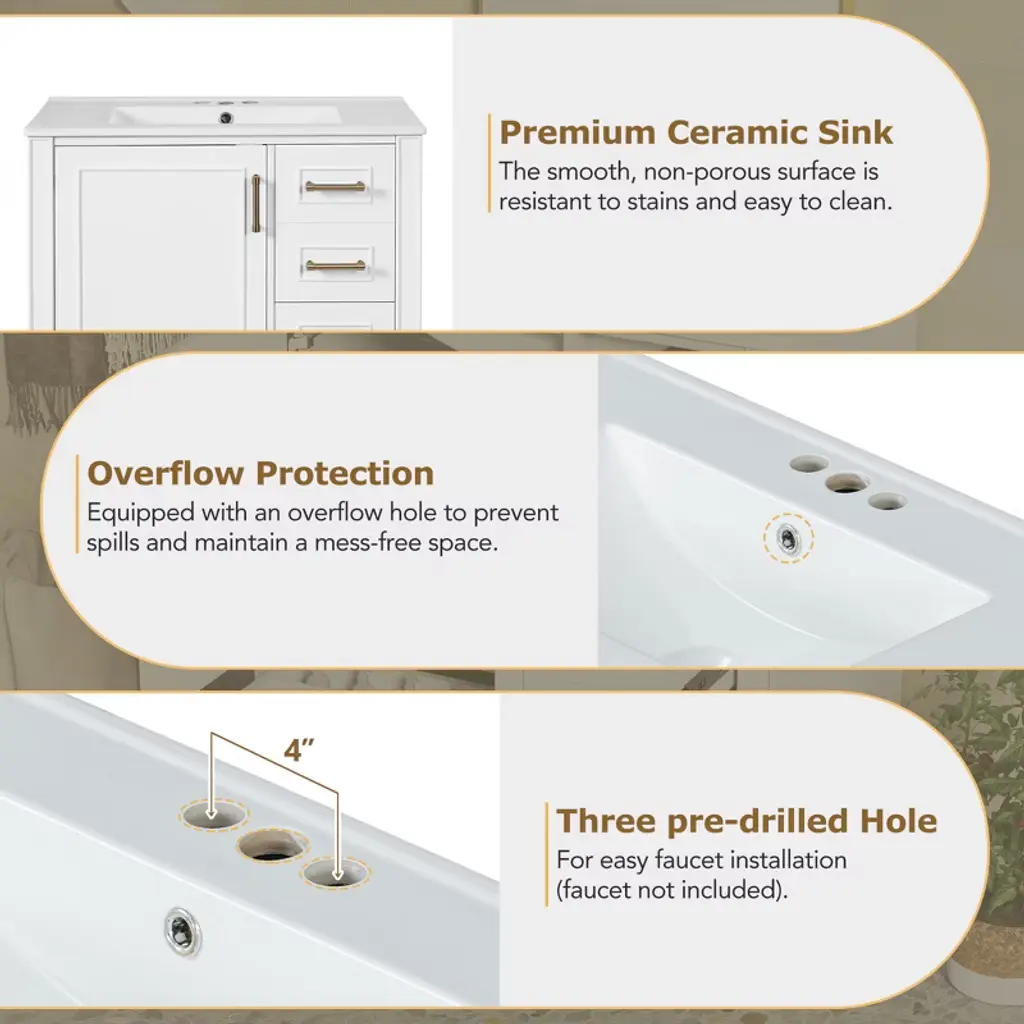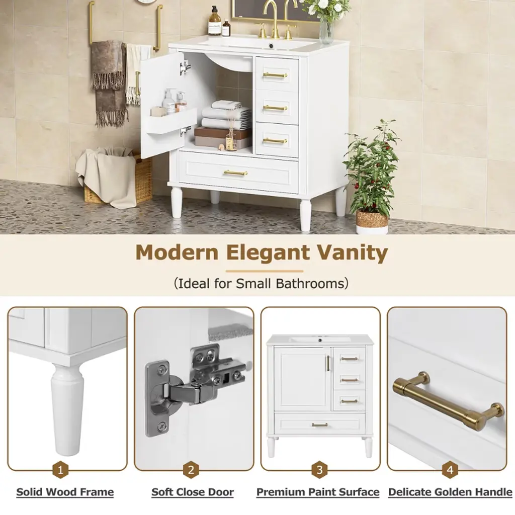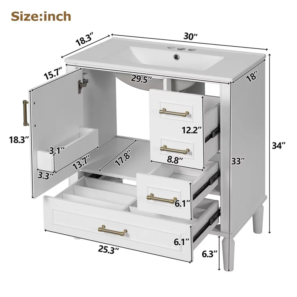 30" White Bathroom Vanity Set, Floor Standing, with Three Drawers, Soft Close Door Transform Your Bathroom into a Sanctuary With a perfect size of 30" * 18.3" * 34", this elegant cabinet is the ideal companion for compact bathrooms, effortlessly enhancing your space. The easy-to-clean ceramic basin, with its thoughtful overflow drain, ensures a dry and serene environment. Its sturdy construction, blending solid wood and premium MDF, promises lasting quality. The soft-close door and three drawers offer generous storage, elegantly organizing your essentials. The white exterior evokes a sense of calm, while the gold handles add a subtle touch of luxury. Assembly is a breeze with clear instructions, allowing you to create a tranquil, modern retreat in no time. Every detail is crafted to elevate your bathroom, transforming it into a space of beauty and functionality. Timeless Elegance The white finish and delicate gold handles create a timeless style, adding a serene and elegant touch to your bathroom with simplicity and grace. Generous Storage Solution The soft-close door and three drawers offer generous storage, perfect for organizing your bathroom essentials and keeping everything neat and accessible. Durable and Long-lasting Crafted with a solid wood frame and MDF, this cabinet is built to last, remaining strong and reliable even in humid conditions.