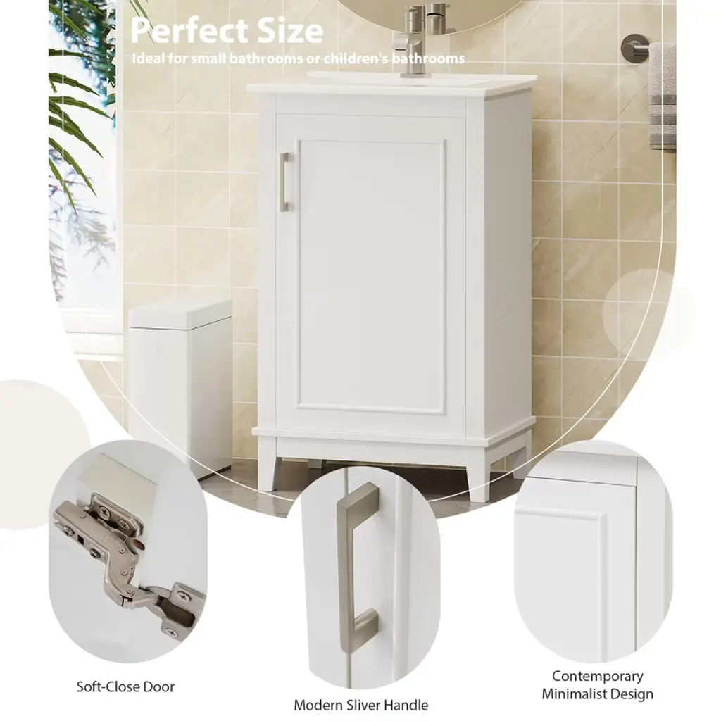 20 Inch Modern Small Bathroom Vanity Cabinet With Ceramic Basin Upgrade your bathroom with our Modern and Compact Bathroom Vanity Cabinet. Measuring 20*14.5*33.3 inches, this space-saving solution is perfect for small bathrooms. Premium Quality The ceramic one-piece basin is not only elegant but also easy to clean, while the pre-drilled faucet hole and overflow prevention add convenience and safety. Ample Storage Constructed with solid wood legs and an MDF cabinet body, this vanity cabinet ensures durability and stability. The ample storage space allows you to organize your bathroom essentials, and the double shelves on the doors provide a convenient spot for toothpaste and toothbrushes. Noise-Free Operation Experience quiet and noise-free operation with the soft-close doors, adding a touch of luxury to your daily routine. The contemporary minimalist design enhances the overall aesthetic of your bathroom. Upgrade your small bathroom with this stylish and functional bathroom vanity cabinet today.