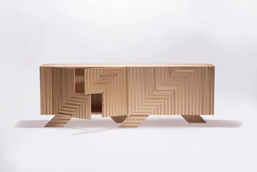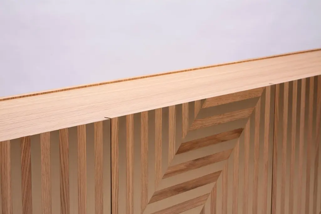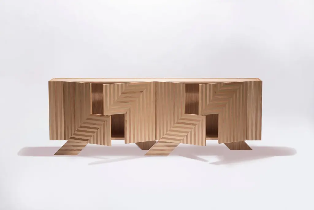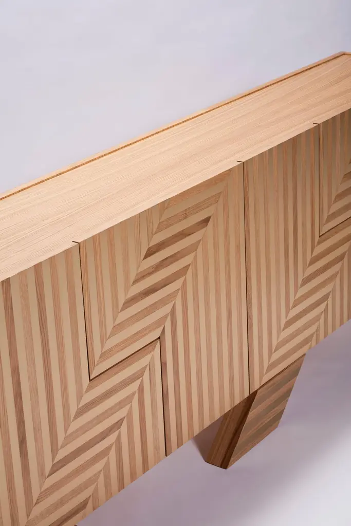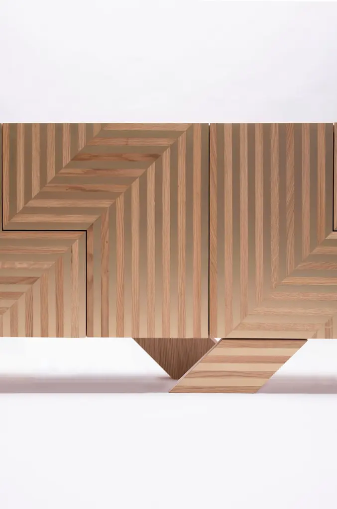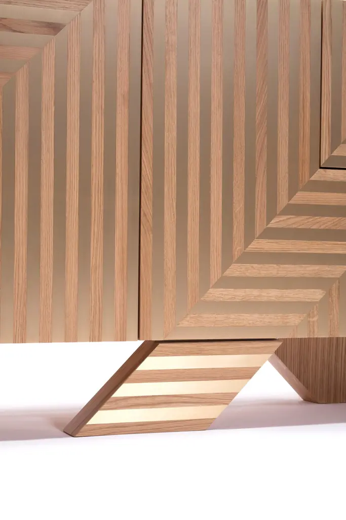 Diago’s design finds his inspiration from the industrial archeology of the late nineteenth century transforming his features into a vaguely eclectic stylistic code. The diagonal rhythm of the reticular structures used by Gustave Eiffel becomes a textured pattern that shapes a collection of furniture with a classic yet dynamic soul.The geometric pattern captures the attention, the construction lines are realized alternating wooden and metal strips that follow one another to generate optical effects that seem to alter the size of the furniture.This cabinet model is produced in solid oak wood. The doors are worked with oak wood strips alternating with brass profiles. Inside there are extra-clear glass shelves.The support feet of Diago have also been designed to give dynamism to this magnificent container.This cabinet fits both the living area and the sleeping area.