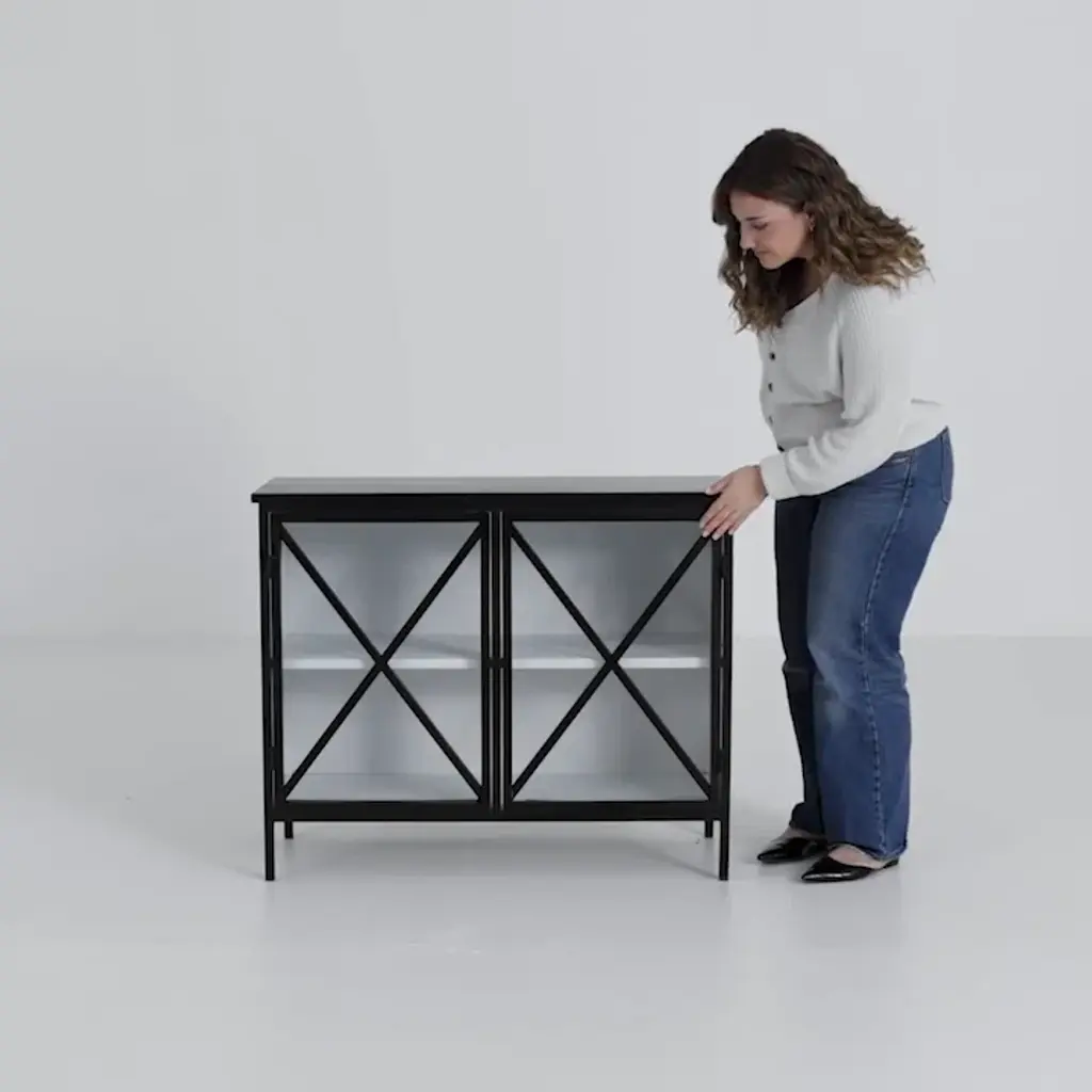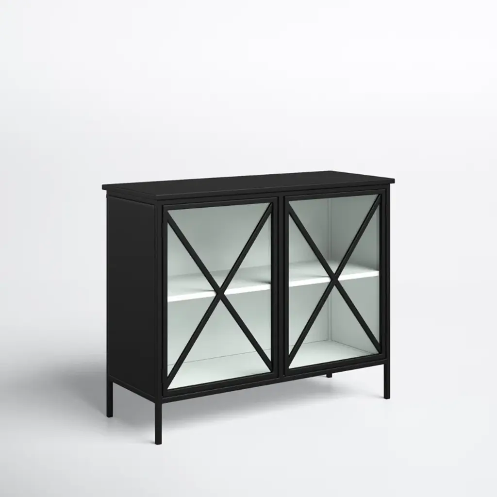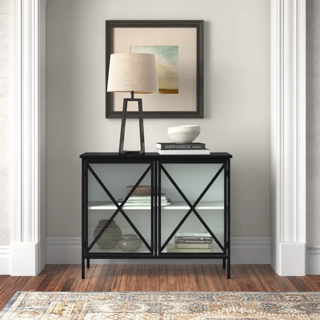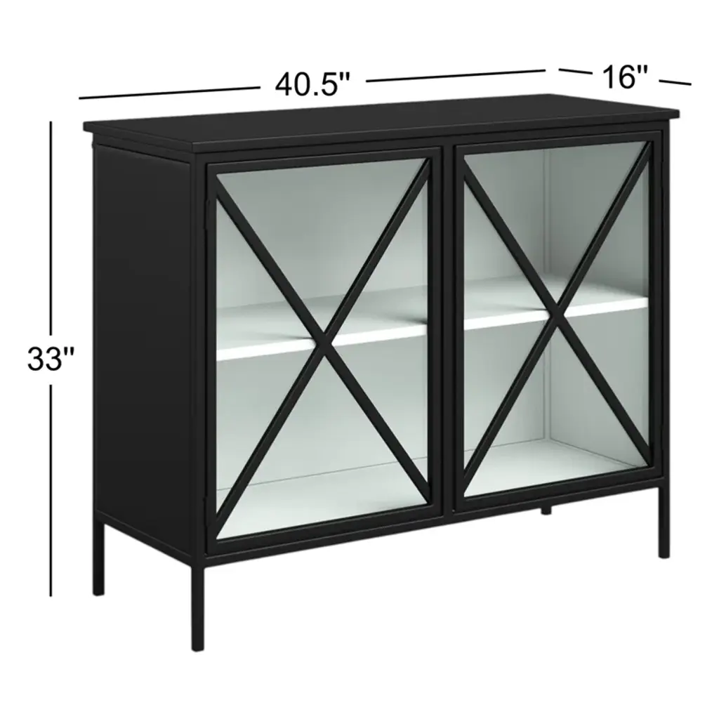 This 2-door accent cabinet has a clean, classic look and feel you'll love to show off just about anywhere. It's made from iron with a black finish and sits on four thin, tubular metal legs. The glass front doors are accented with metal Xs for added style and sophistication. We love the contrast of the two interior visible white shelves, especially when paired with the dark exterior. The best part? It's delivered fully assembled, so all you have to do when it arrives is find the right spot for it.