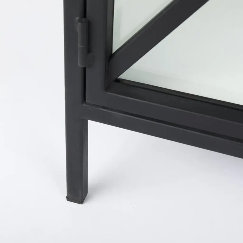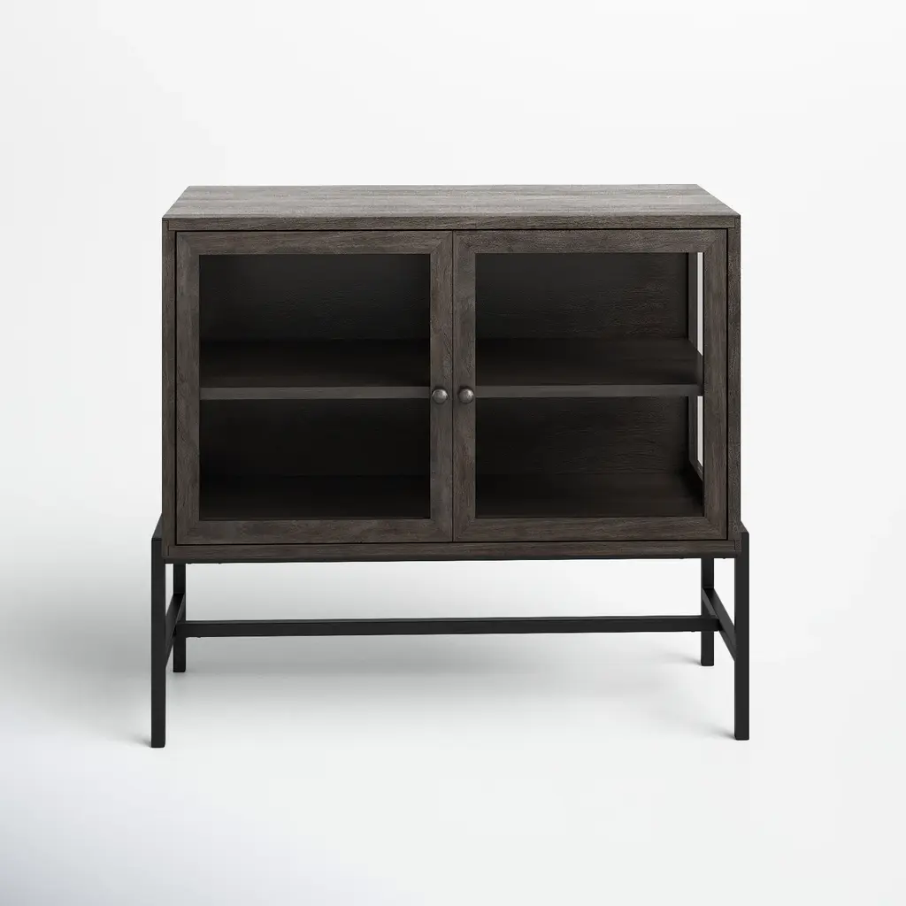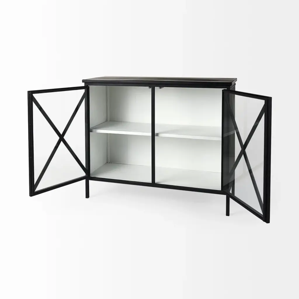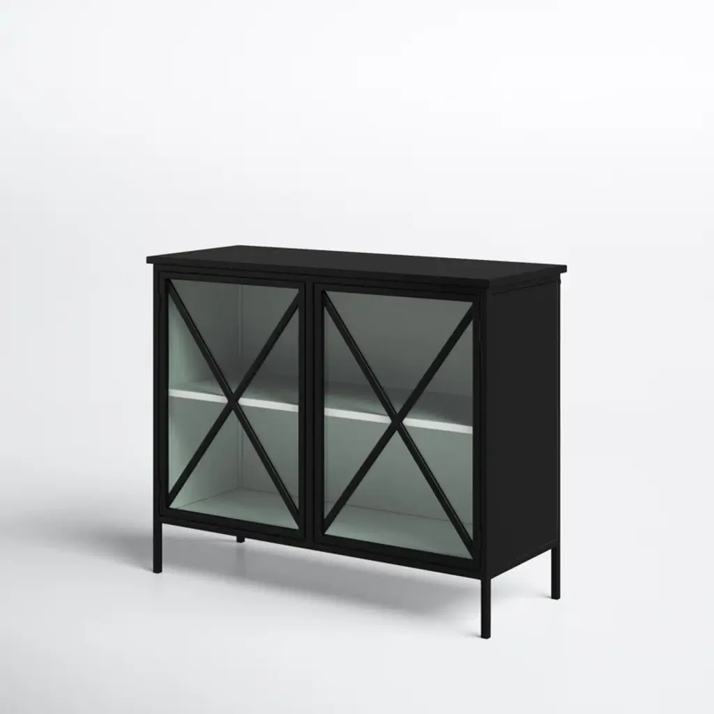 This 2-door accent cabinet has a clean, classic look and feel you'll love to show off just about anywhere. It's made from iron with a black finish and sits on four thin, tubular metal legs. The glass front doors are accented with metal Xs for added style and sophistication. We love the contrast of the two interior visible white shelves, especially when paired with the dark exterior. The best part? It's delivered fully assembled, so all you have to do when it arrives is find the right spot for it.