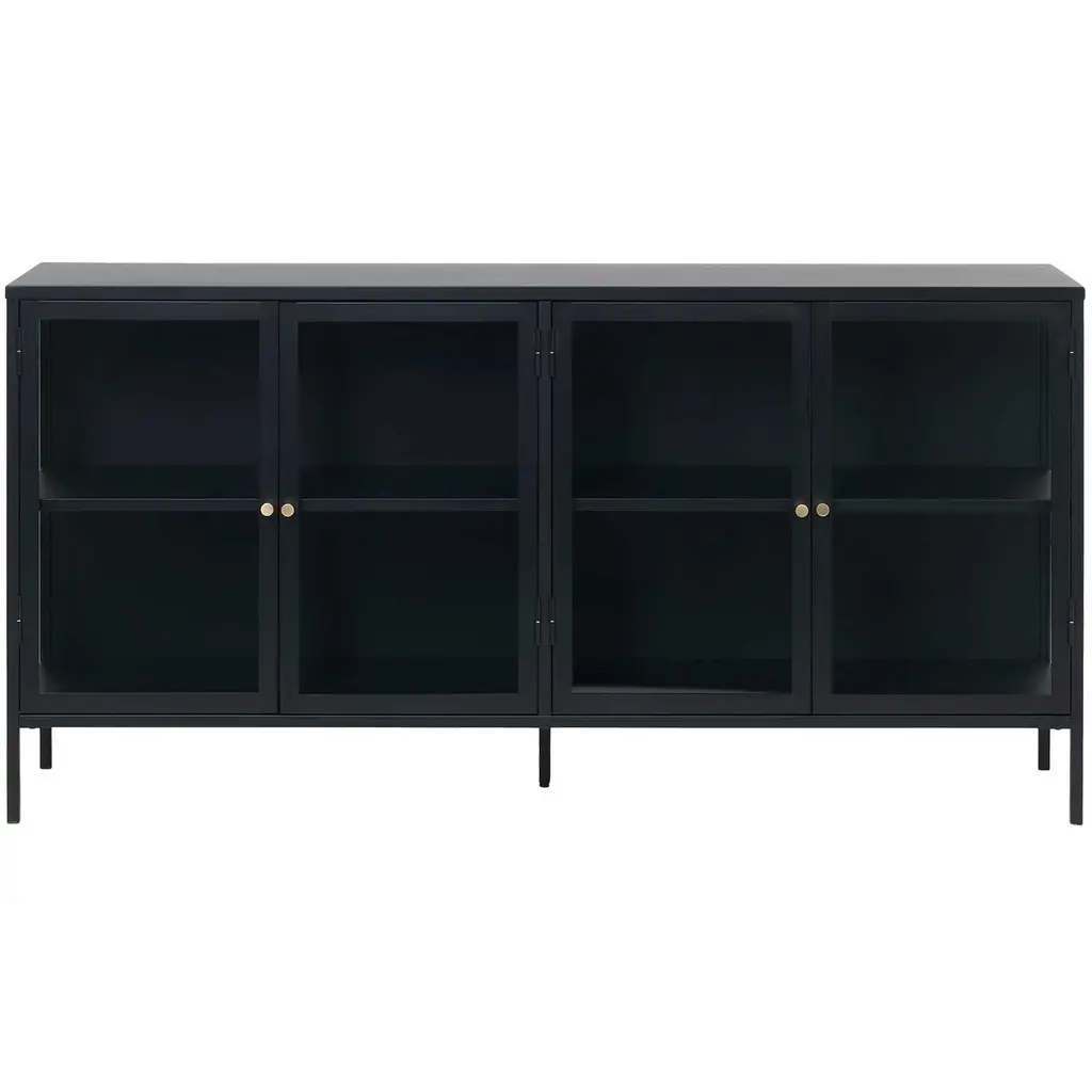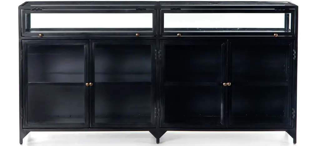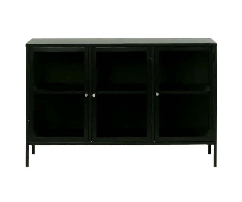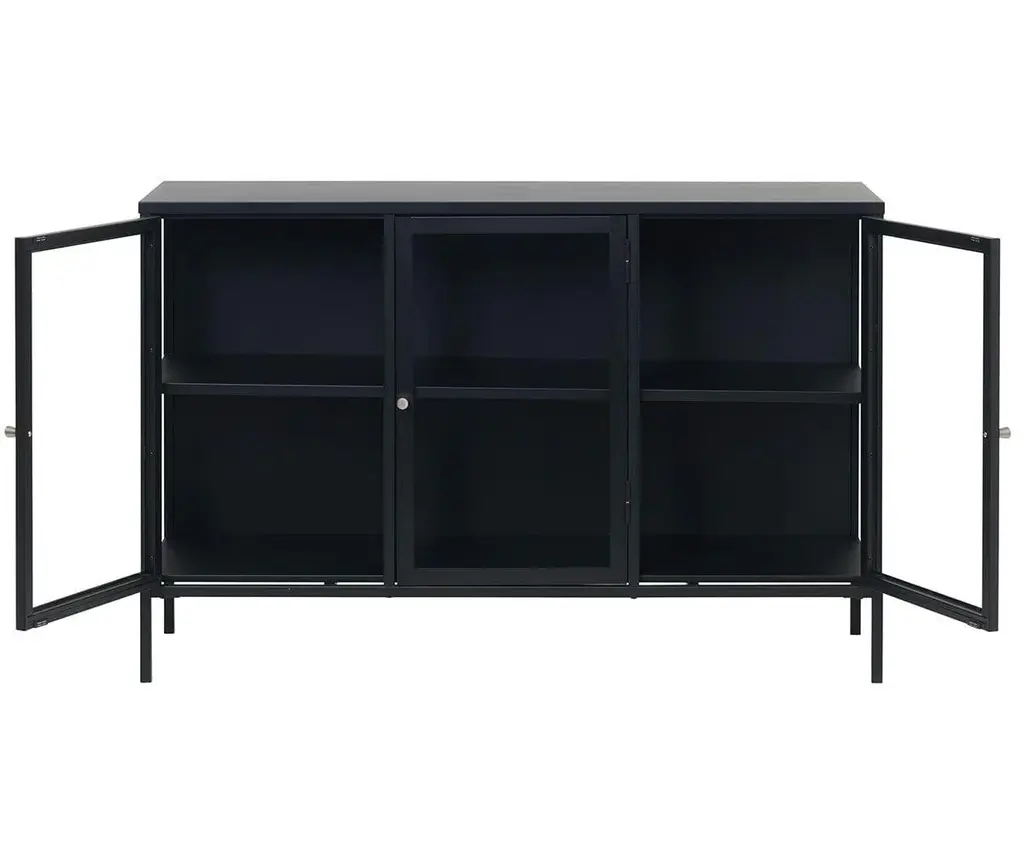 The Dion Three-Door Cabinet is a svelte, modern addition to any living room. Ample storage offers you the chance to showcase your media necessities in style while keeping them safe behind closed doors. A flat surface is the perfect place for your TV, and convenient cord-organizing cutouts allow you to connect your media items seamlessly. The Dion Collection pairs tempered glass doors and sides with sturdy metal framework to create an airy look that's both modern and minimalistic. Platinum hardware and crisp, clean lines mean that the pieces in this collection can be easily styled within a wide variety of design aesthetics.