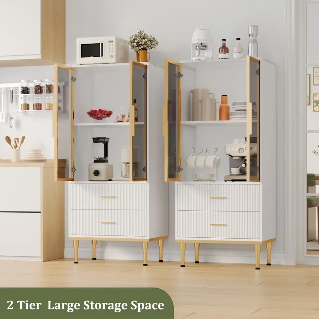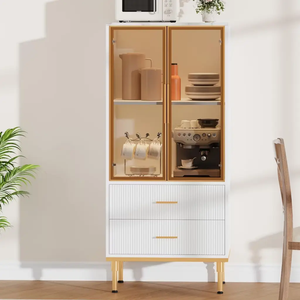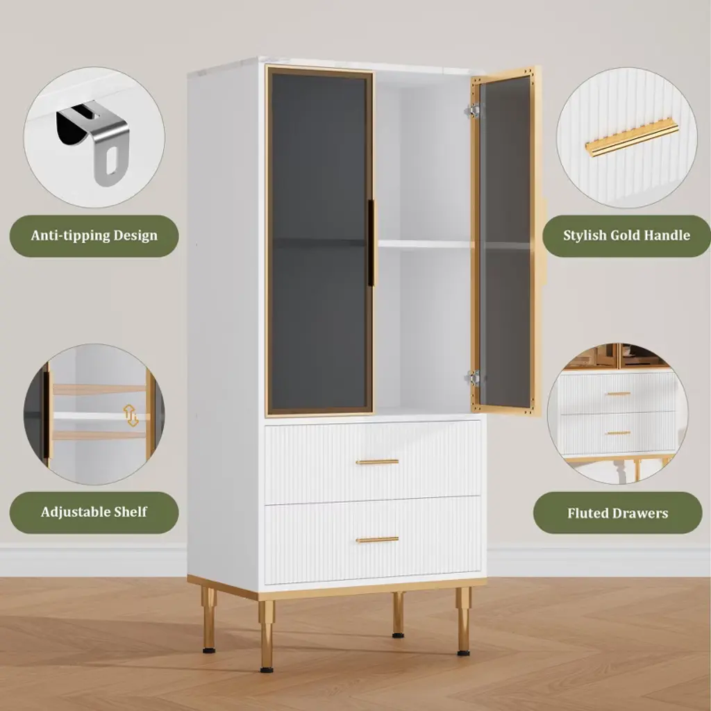 Display Cabinet with Glass Door, Modern Fluted Storage Cabinet with 2 Drawers for Living Room and OfficeProduct Description:1. Elegant Contemporary DesignEnhance your home decor with this beautifully crafted display cabinet that blends modern aesthetics with timeless elegance. The stunning tea-colored glass is elegantly framed in luxurious gold alloy, creating a striking visual appeal. The textured fluted drawer fronts and distinctive trapezoidal gold alloy feet add sophisticated detail, making this piece a stylish focal point in any room.2. Versatile Display and StorageThis cabinet offers the perfect combination of display and concealed storage. The spacious glass-door compartment features an adjustable shelf, ideal for showcasing collectibles, books, or decorative items. Below, two deep drawers provide ample space to organize smaller essentials, documents, or kitchen supplies, keeping clutter out of sight while maintaining easy access.3. Durable and Easy-Clean SurfacesCrafted from high-quality MDF with a polished, wear-resistant finish, this cabinet is built to withstand daily use while retaining its pristine appearance. The smooth white surface is effortless to maintain¡ªsimply wipe with a damp cloth to keep it looking fresh and new, making it both a practical and long-lasting addition to your home.4. Space-Saving Compact FootprintDesigned to fit seamlessly into various settings, this cabinet features compact dimensions of 15.7"W x 23.6"D x 54.8"H. Its versatile size allows it to serve as a elegant display cabinet in the living room, a functional storage solution in the office, or a stylish kitchen pantry for organizing essentials without occupying excessive floor space.5. Simple and Efficient AssemblyEnjoy a straightforward setup process with clearly labeled parts and detailed step-by-step instructions. All necessary hardware is included, enabling you to assemble your cabinet quickly and without complications. In no time, you can transform your space with this elegant and highly functional storage piece.Specifications:? Material: Engineered Wood (MDF), Gold Alloy Accents? Color: White with Gold Accents? Style: Modern? Configuration: 1 Glass Door Display Section, 2 Drawers? Special Features: Adjustable Shelf, Wear-Resistant Finish? Mounting Type: Freestanding? Overall Dimensions: 15.7"W x 23.6"D x 54.8"H