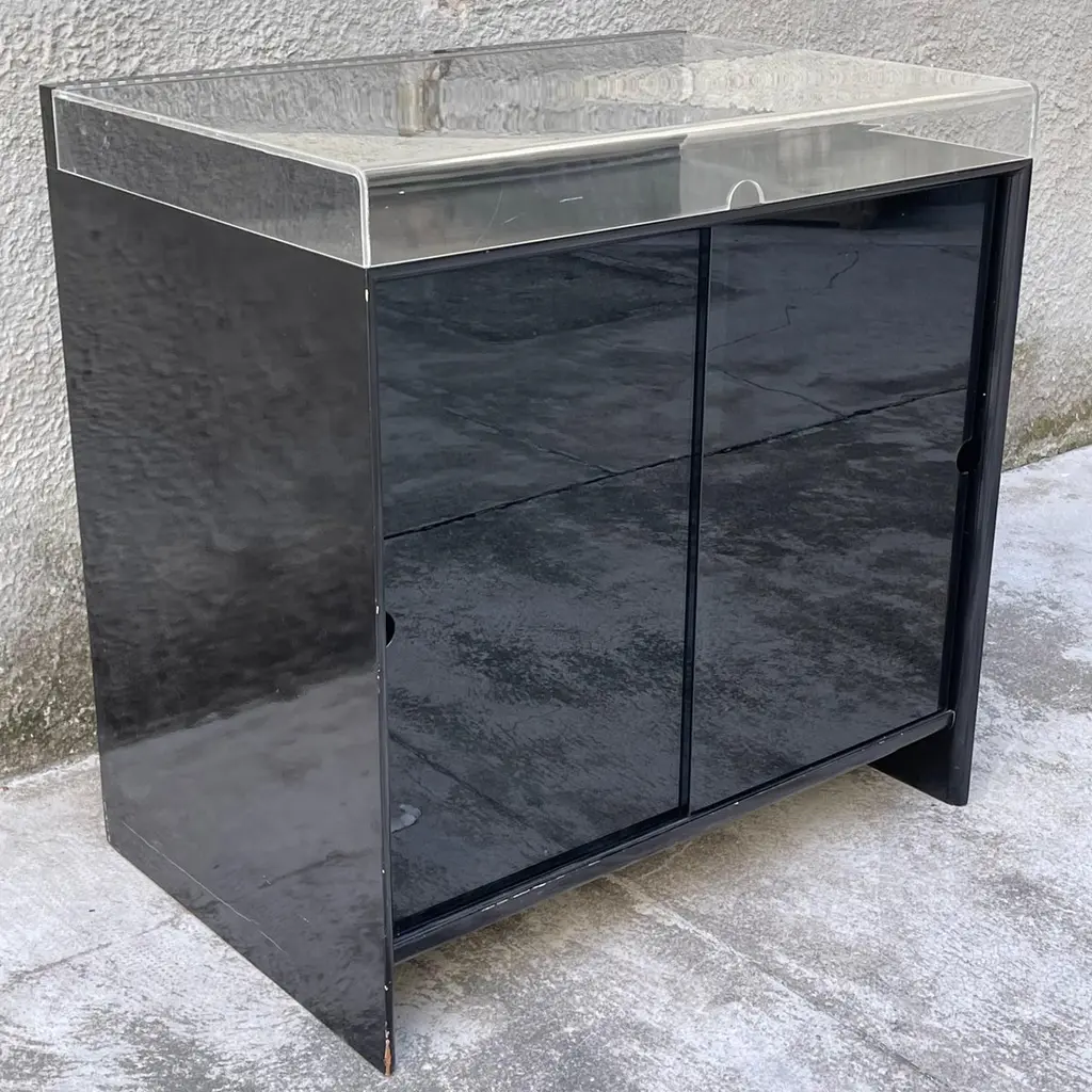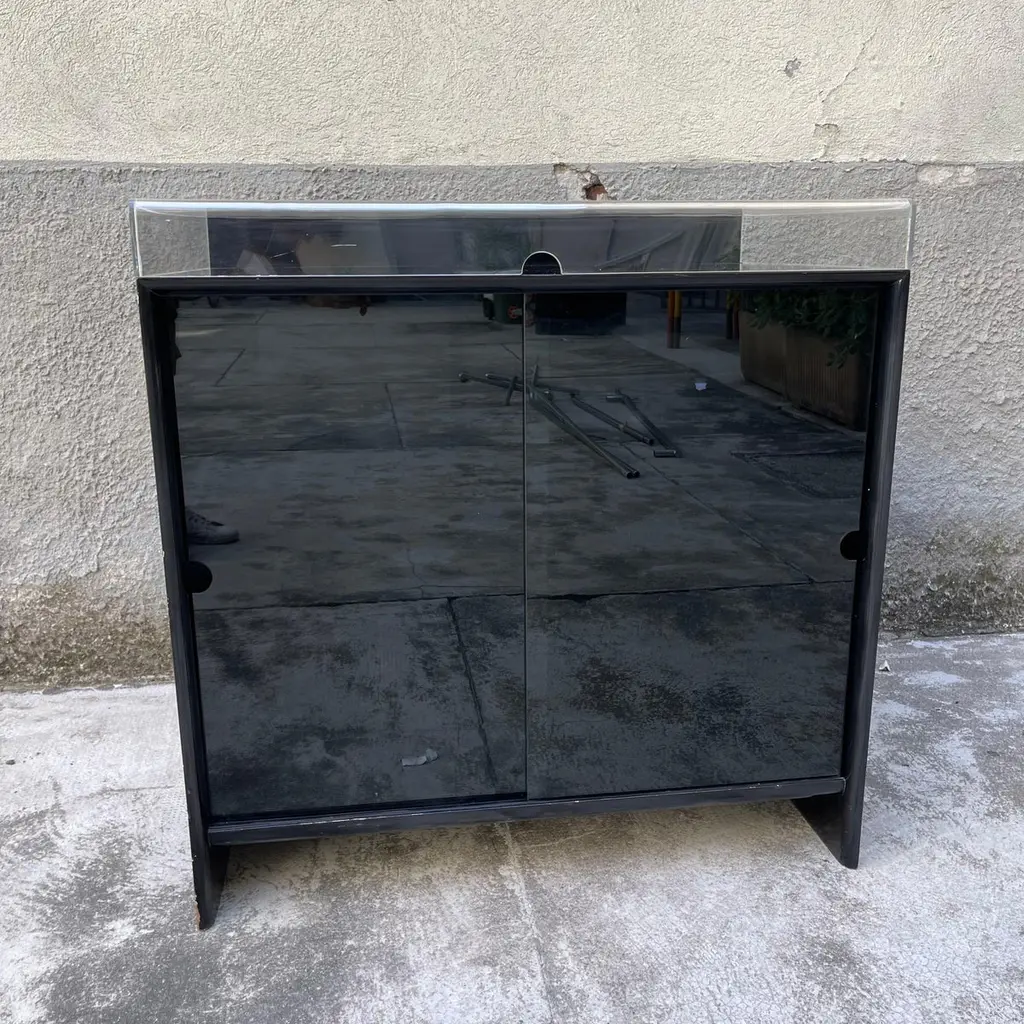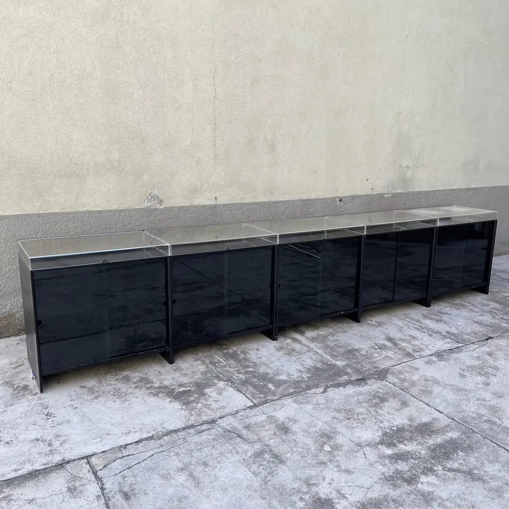 This set of cabinets (5 pieces available) with display top, constructed with great attention to detail and quality, has a thick Plexiglas top made by hand. Very useful for displaying small collections, it has a large compartment closed by two sliding sheets of smoked glass. It is perfectly suitable for collectors or store use, useful for exhibitions or displays. One of the five Plexiglas lids appears to be "stained" by heat. Sold individually or in bulk.