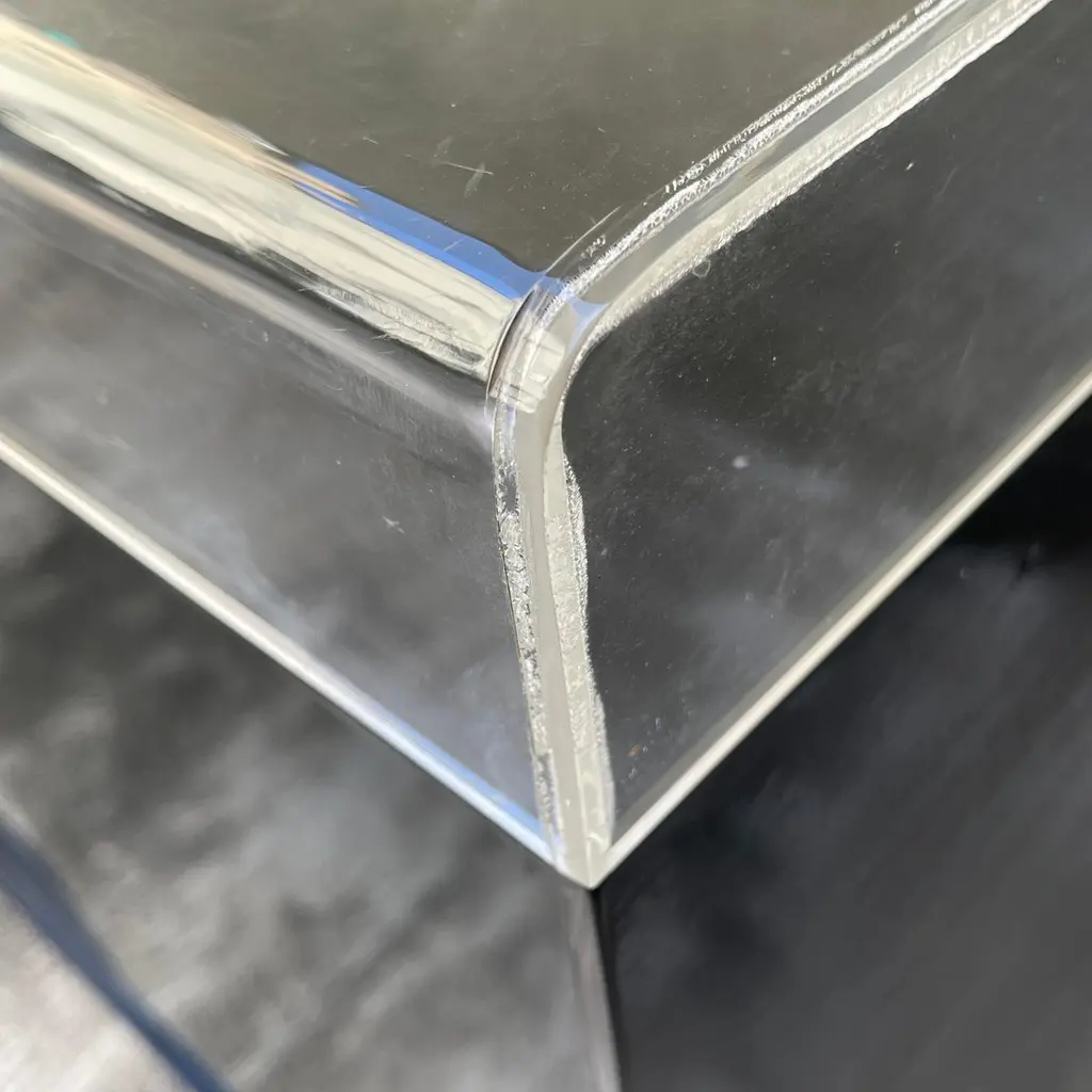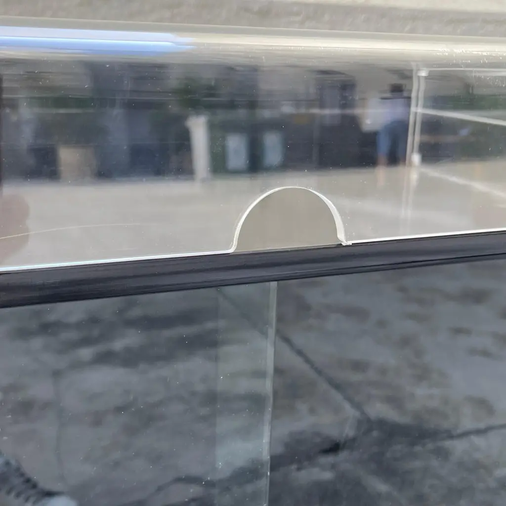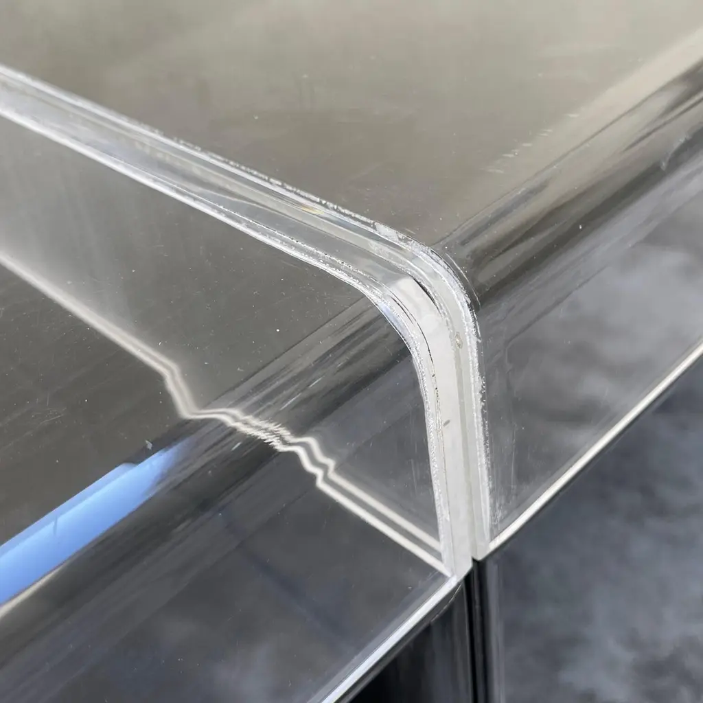 This set of cabinets (5 pieces available) with display top, constructed with great attention to detail and quality, has a thick Plexiglas top made by hand. Very useful for displaying small collections, it has a large compartment closed by two sliding sheets of smoked glass. It is perfectly suitable for collectors or store use, useful for exhibitions or displays. One of the five Plexiglas lids appears to be "stained" by heat. Sold individually or in bulk.