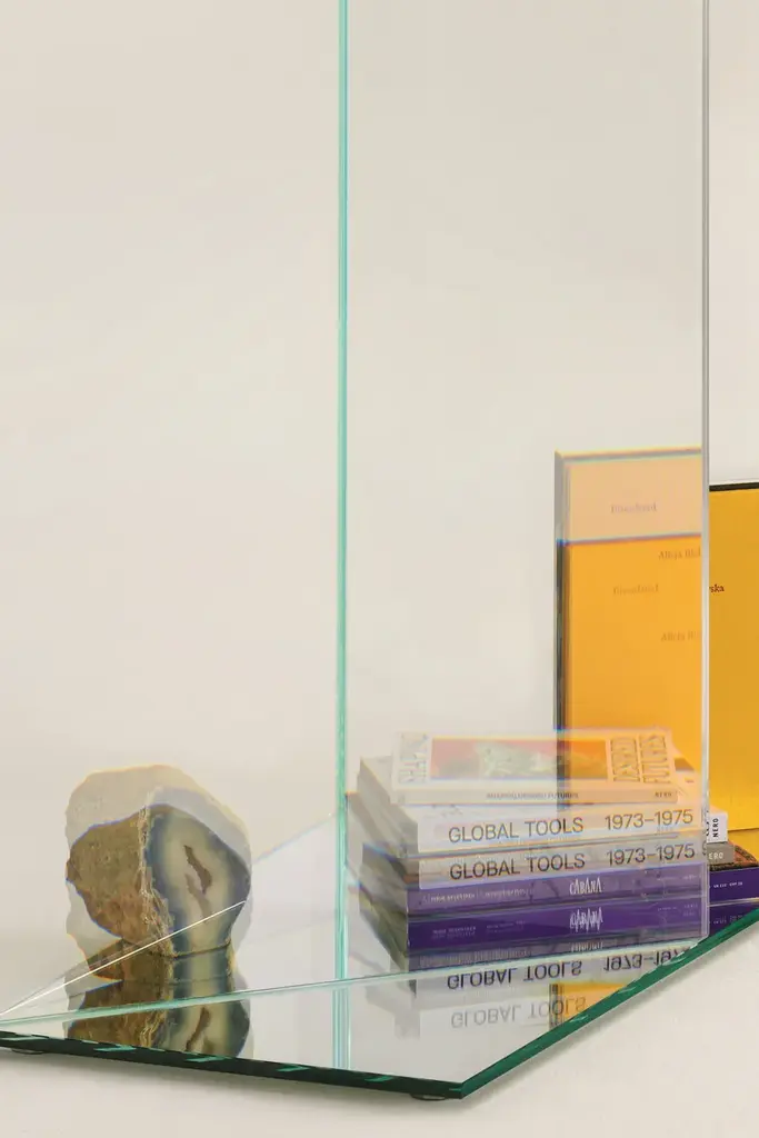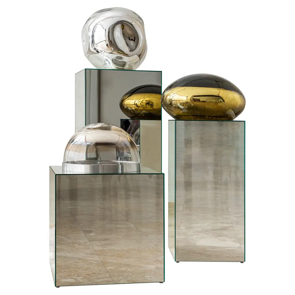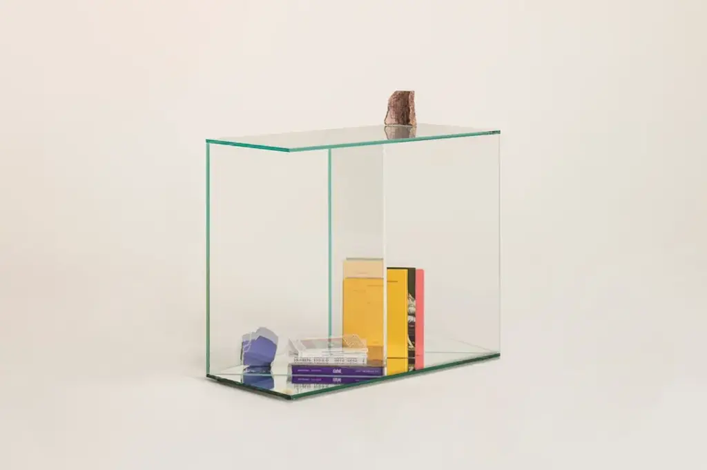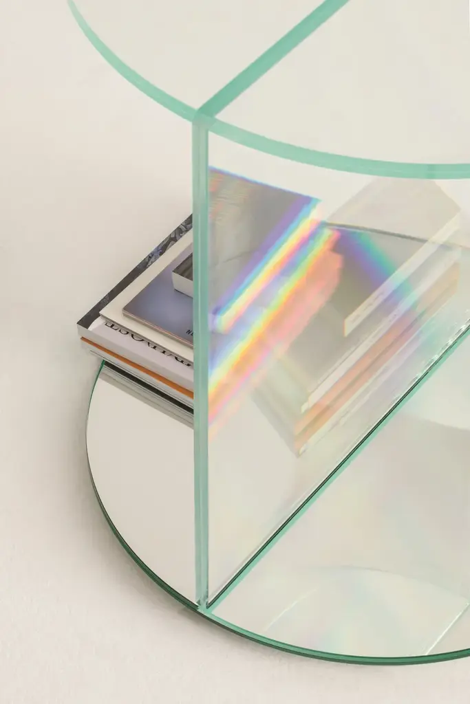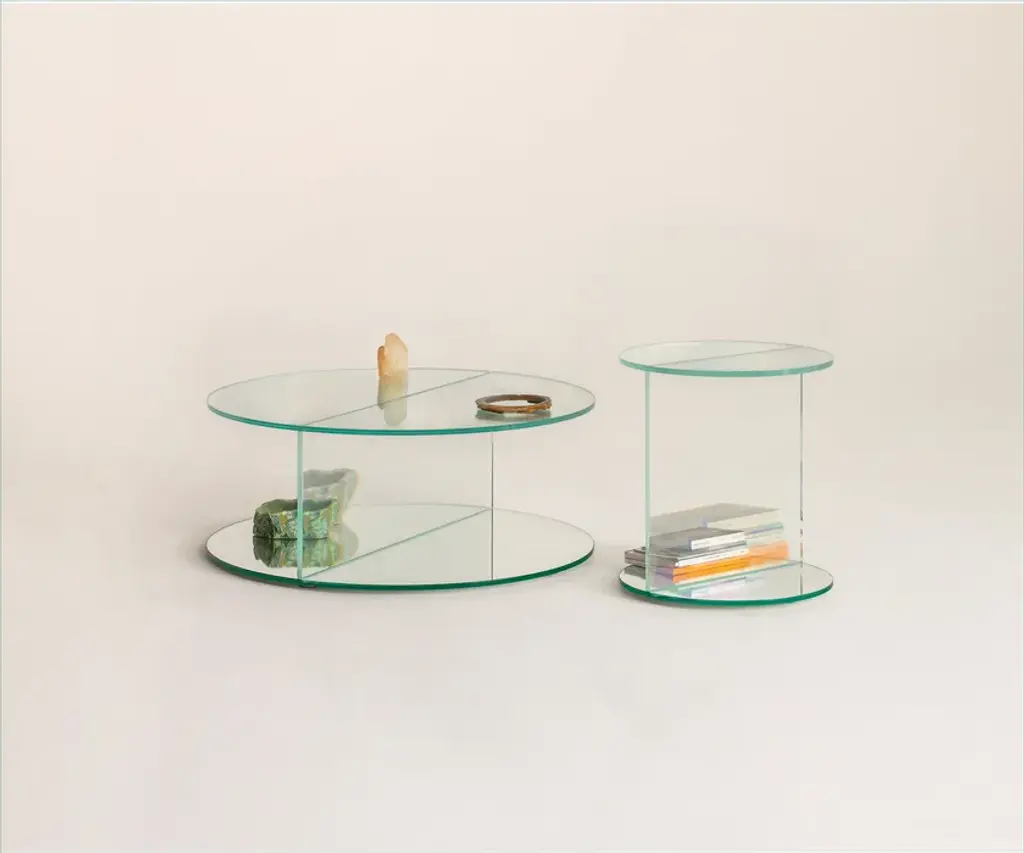 Collection of low tables and consoles made of an innovative laminated and glued glass, which gives life to extraordinary optical illusions and wonderful surreal effects. The objects observed through this material, in fact, seem to change their material consistency, vary their position, size and quantity. The base, in laminated mirror, reflects and amplifies these magical effects.