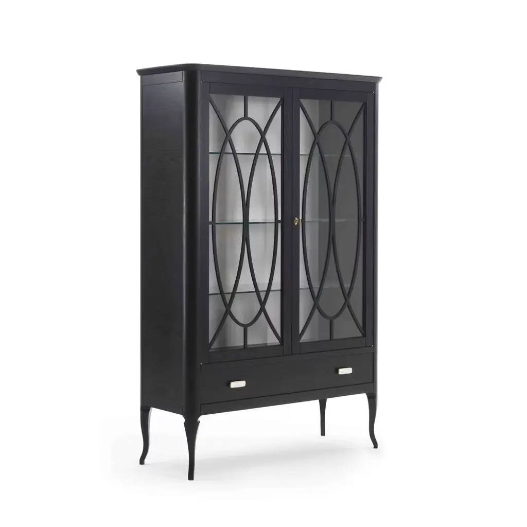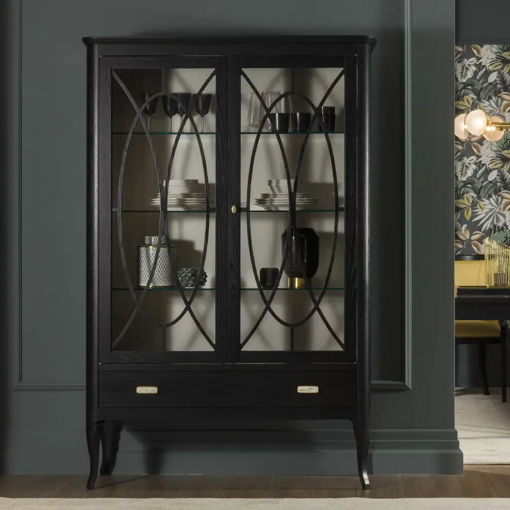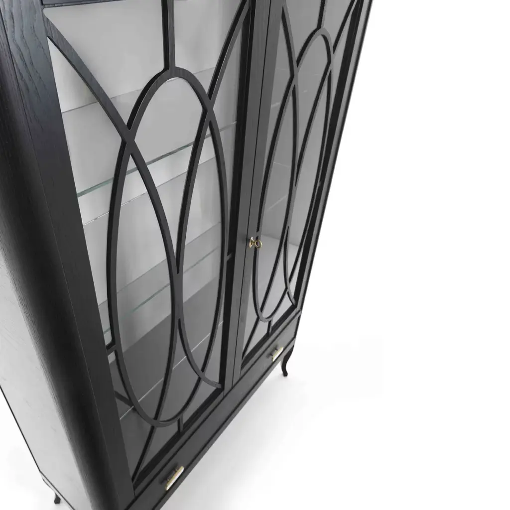 Fashioned of wood with ash veneer and ebonized finish, this refined display cabinet features a rectangular frame with cabriole legs and two glass doors accented with an open design of intersecting ovals and a single oval brass knob. The interior has three glass shelves and a back panel in ivory synthetic leather. Adding functional storage space, the two drawers feature runners with Blumotion technology and two elegant Art Deco-inspired brass handles with buffalo horn inserts, a sophisticated detail that makes this cabinet a splendid addition for classic and modern decors.