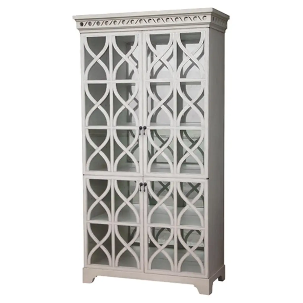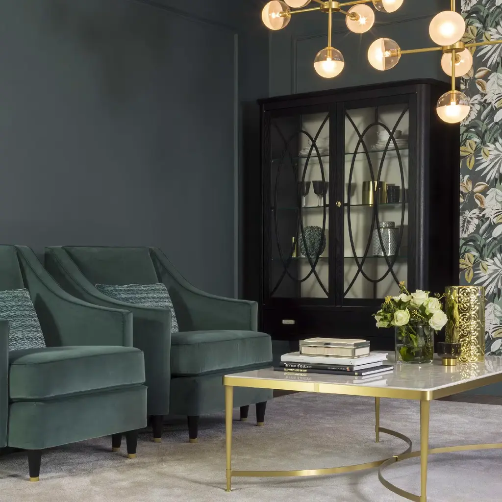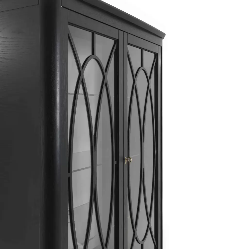 Fashioned of wood with ash veneer and ebonized finish, this refined display cabinet features a rectangular frame with cabriole legs and two glass doors accented with an open design of intersecting ovals and a single oval brass knob. The interior has three glass shelves and a back panel in ivory synthetic leather. Adding functional storage space, the two drawers feature runners with Blumotion technology and two elegant Art Deco-inspired brass handles with buffalo horn inserts, a sophisticated detail that makes this cabinet a splendid addition for classic and modern decors.