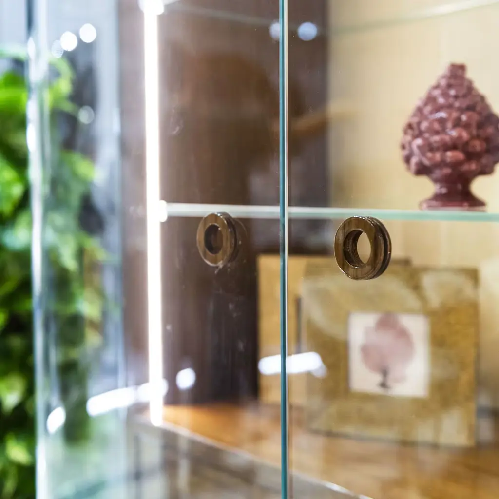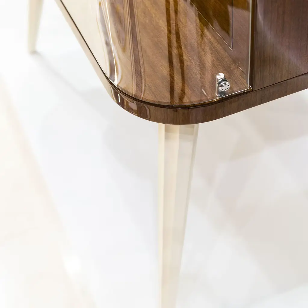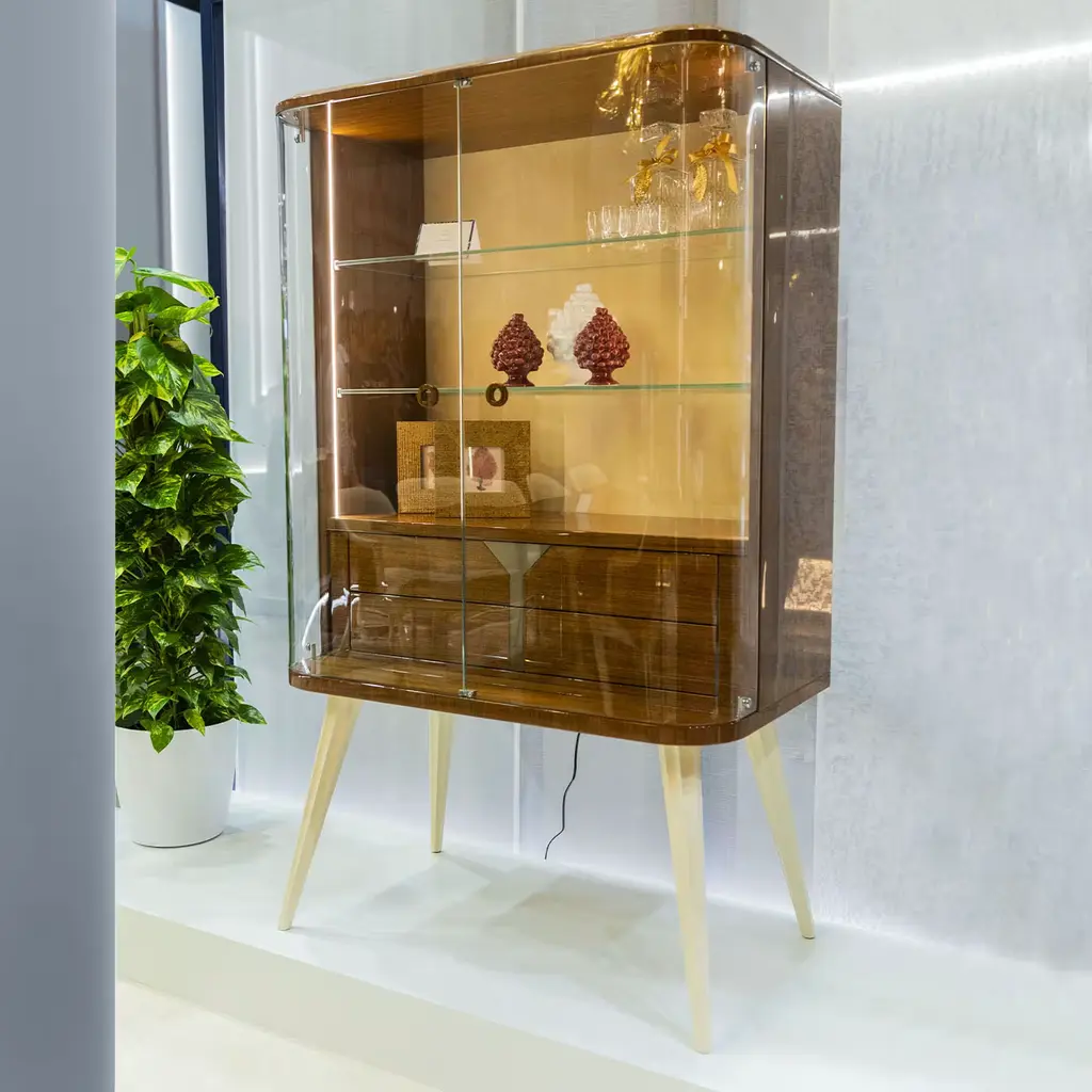 This singular cabinet is an exclusive design seducing with its interplay of transparencies and grain. Tapered faceted legs lacquered in a delicate vanilla hue sustain the structure, which boasts a warm Daniela walnut veneer combined with extra-clear, rounded glass doors allowing a full view of the shelved interior. Elegant satin metal details complete the design. Inquire with the Concierge about illumination options.