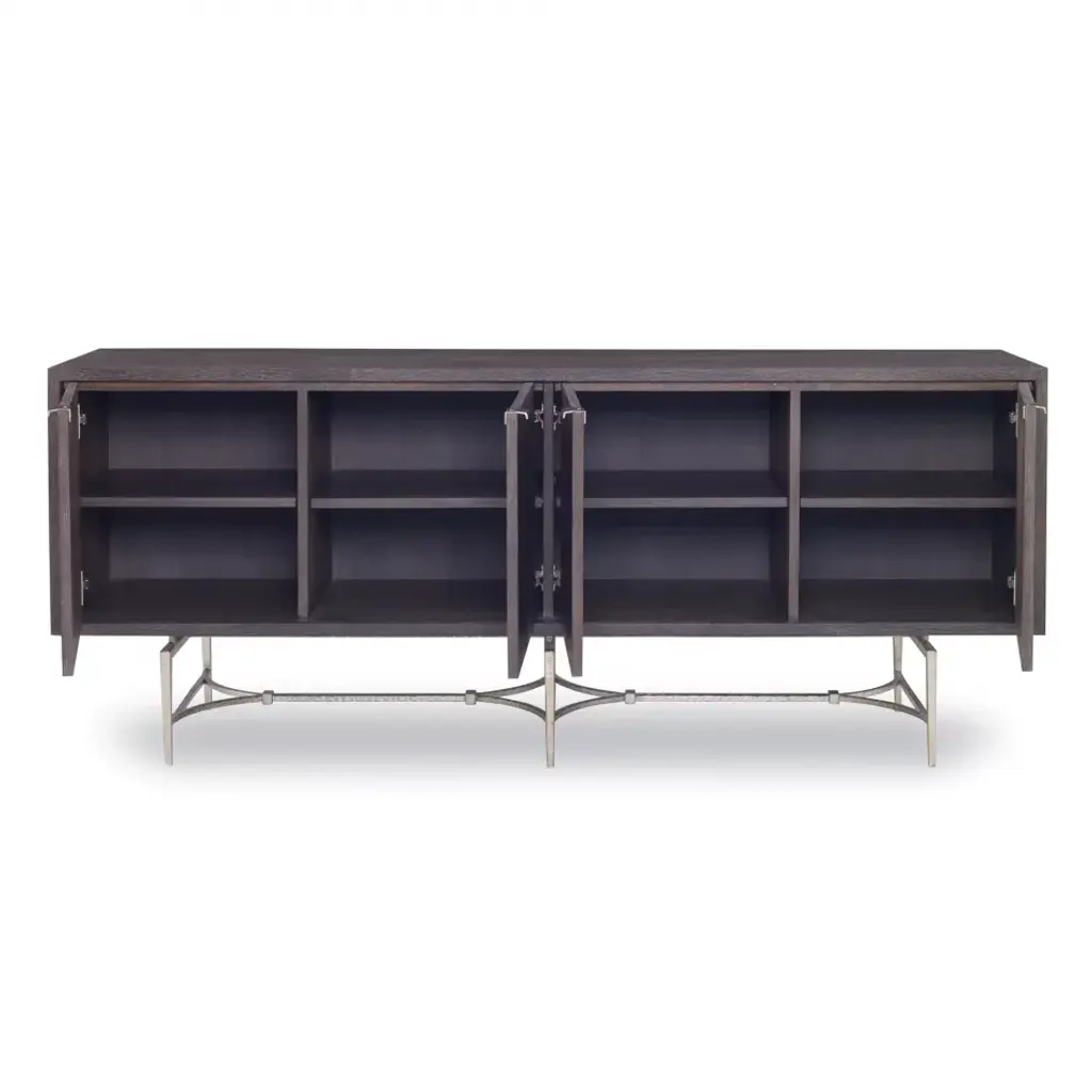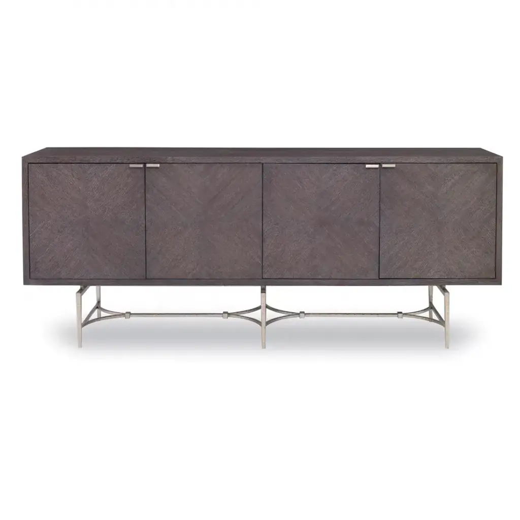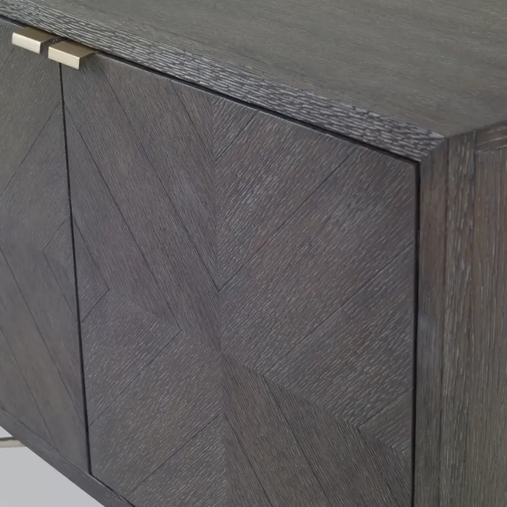 This elegant cabinet features four herringbone Oak veneer patterned doors. Crafted from White Oak, the cabinet is raised on silver leaf hammered legs and diamond shaped stretchers. Adjustable shelves are included.