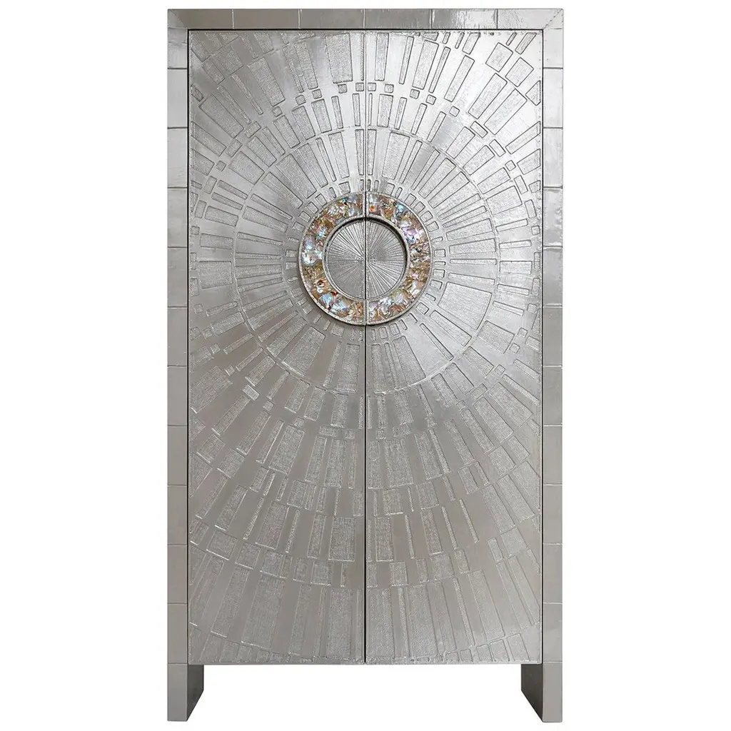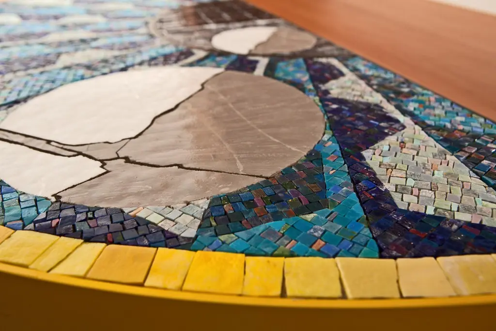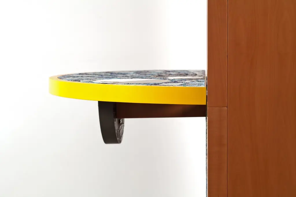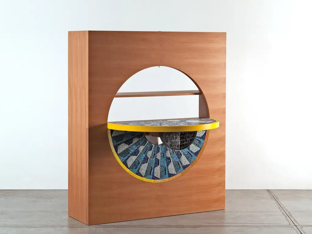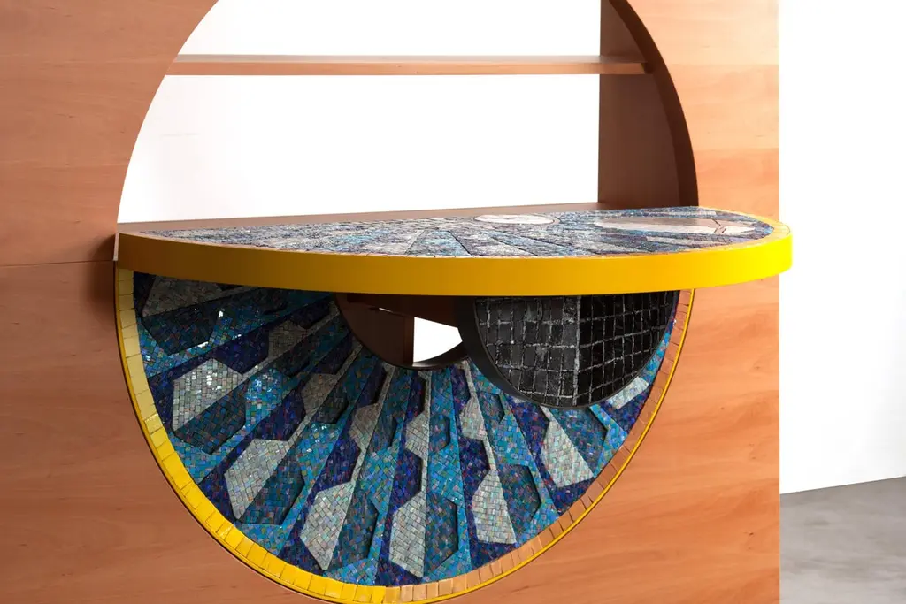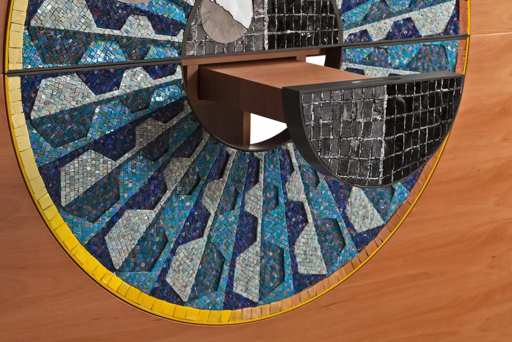 This versatile Collector, a double-sided cabinet made of pear wood, is the culmination of SoShiro’s and Alexandre Arrechea’s Layers collection collaboration. It is a transformative shelf unit inspired by one of Arrechea’s Corners series photographs, Blue Eye, and has been reimagined in mosaic as a drop-down shelf.The eye explores Arrechea’s themes of surveillance in his artworks, particularly with the idea that the corners of buildings in Havana are considered witnesses to Cuba's history and changes. The Collector celebrates exceptional craftsmanship from the Scuola Mosaicisti del Friuli, the master mosaic school in Italy, as well as beauty in design with its many adaptable functions. With six shelves and multiple cubby spaces, plus a drop-down shelf, this cabinet makes the perfect bar, organizer, or partition divider cabinet.