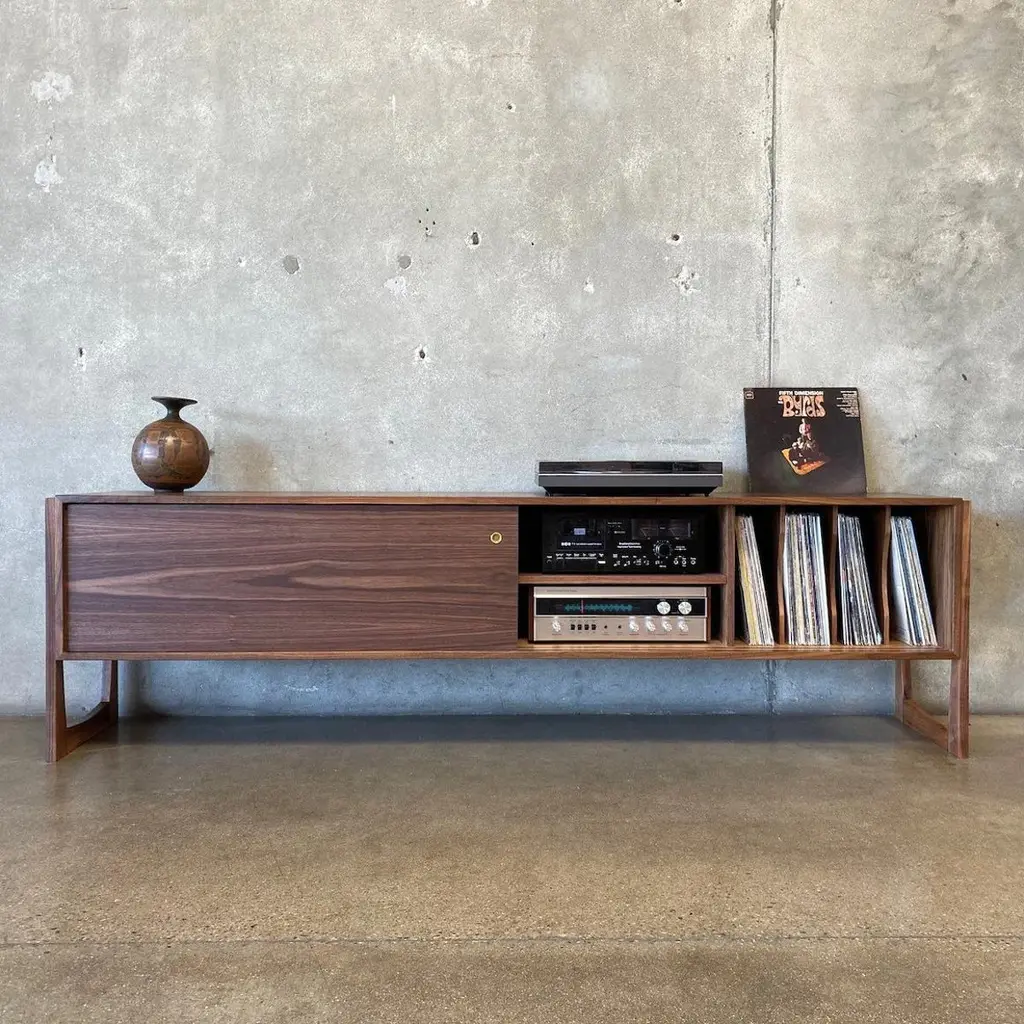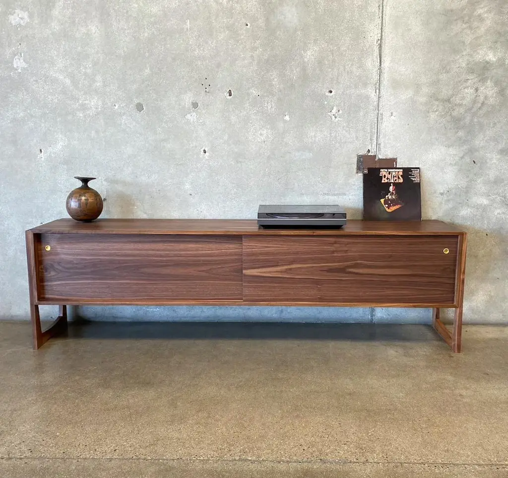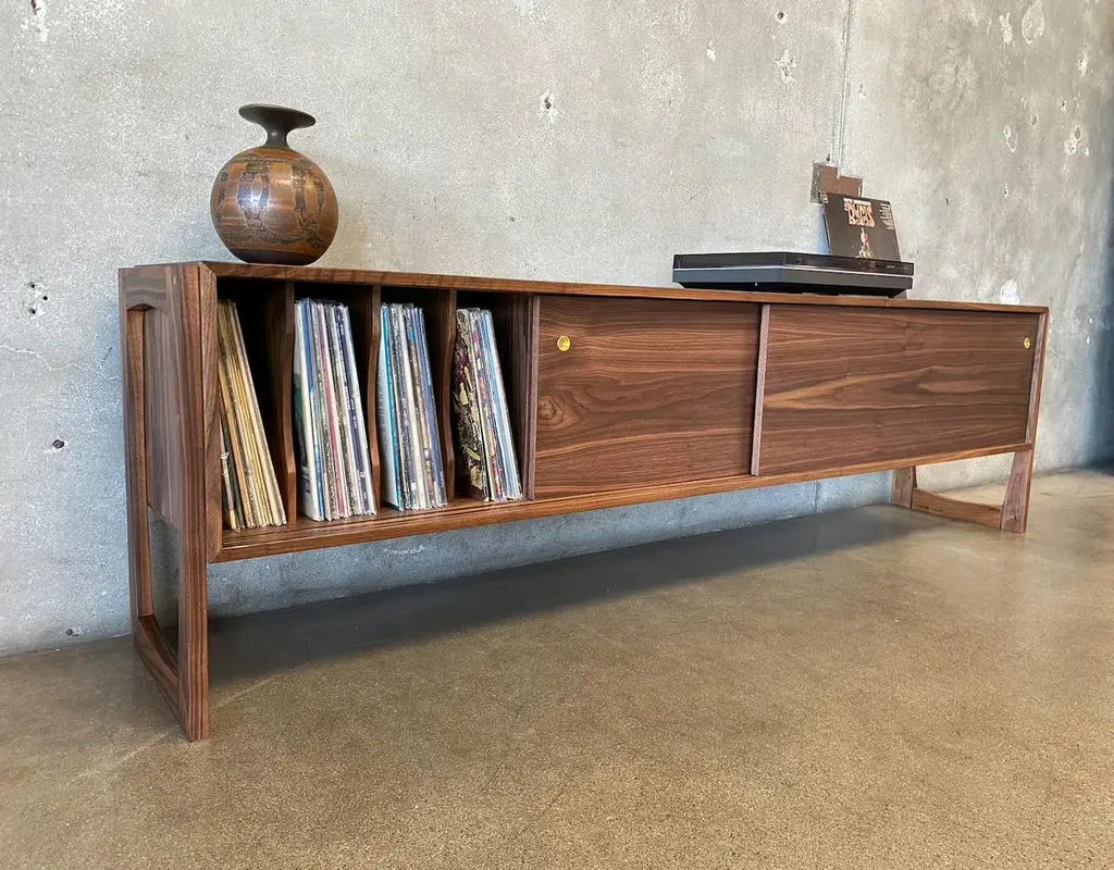 This walnut beauty is the perfect way to showcase your records, 84" long x 16" deep x 24" tall. This is an original design, and is handcrafted in Long Beach, CA by Pete Deeble Furniture. The two doors feature finger cup brass tone pulls and slide effortlessly. They are easily removed if you prefer to leave all components exposed.