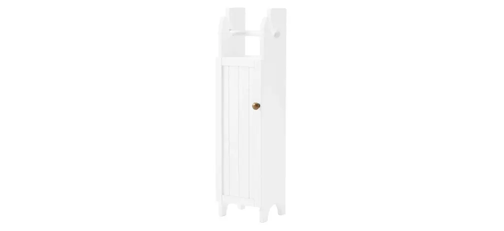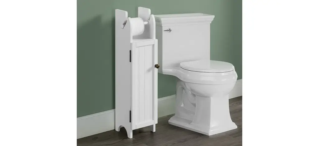 This classic Dover Deluxe Storage Cabinet w/ Toilet Paper Dispenser brings space saving-storage to your bathroom, and complements most bathroom d_cor. This free-standing toilet paper holder and dispenser is easy to move anywhere in the bathroom, with a compact size that fits conveniently next to toilet corners. Great for guest bathrooms, half-baths, powder rooms, and smaller spaces.