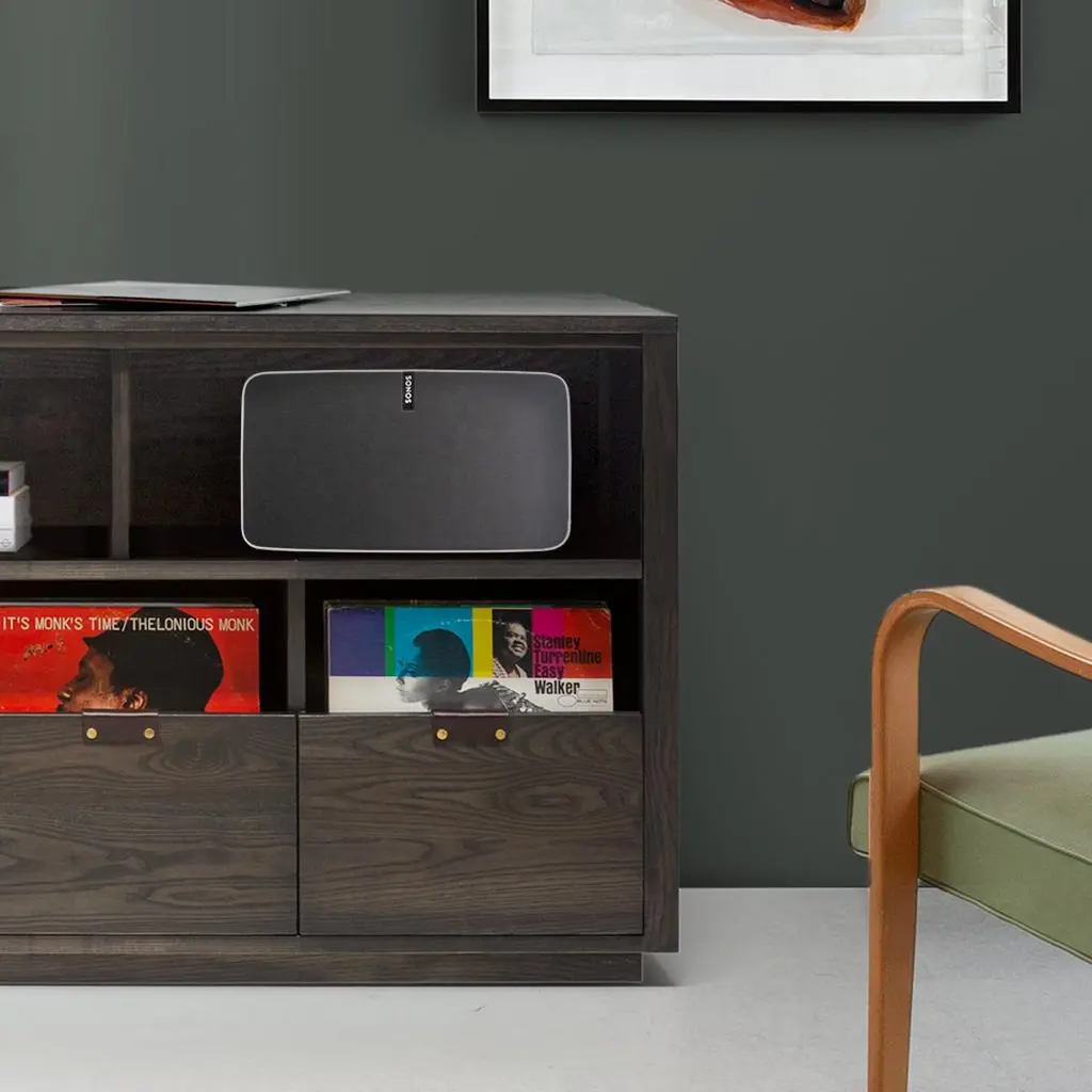 Our Dovetail vinyl storage cabinets with equipment shelves are sized to fit the most popular Sonos speakers and works with Sonos one, play 1, play 3, play 5, Beam, Playbase & Playbar. The drawers in our Dovetail cabinets utilize a “file drawer” approach to store LPs and allow you to easily flip through an entire record collection while enjoying a visual display of record cover art across the front of the cabinet. The design incorporates many of the same details found in our Dovetail Record Crates into a cabinet that can be customized for your storage needs. Each drawer is constructed with Symbol’s exposed English dovetail joinery, vegetable tanned leather handles with solid brass hardware, and utilize heavy-duty full extension soft-close under-mount drawer slides. Passive ventilation and cable management keep your components cool and organized. All of our cabinets are produced in the United States using sustainably harvested solid hardwoods for both strength and beauty.Features:- Store up to 270 LPs- (2) equipment shelves designed specifically for Sonos speakers- Dovetail drawer boxes with full-extension soft-close undermount drawer slides- Vegetable tanned leather handles with solid brass hardware- Solid wood constructionDimensions:Cabinet 48" W x 18" D x 28.75" HEquipment shelves (each) 22 1/8" W x 18" D x 9" H.