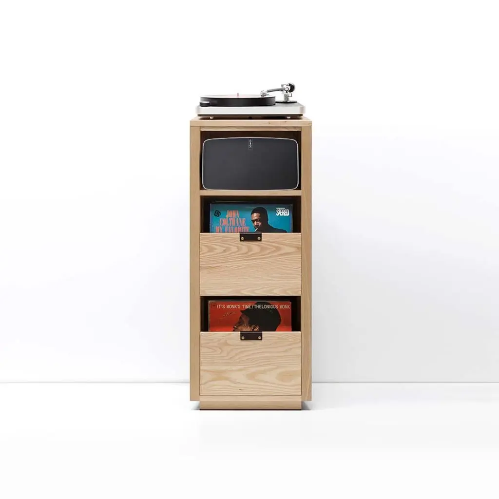 Our dovetail vinyl storage cabinets 1 x 2.5 with equipment shelves are sized to fit the most popular Sonos speakers and works with Sonos One, Play 1, Play 3, Play 5, Beam, Playbase & Playbar. The drawers in our Dovetail cabinets utilize a “file drawer” approach to store LPs and allow you to easily flip through an entire record collection while enjoying a visual display of record cover art across the front of the cabinet. The design incorporates many of the same details found in our dovetail record crates into a cabinet that can be customized for your storage needs. Each drawer is constructed with Symbol’s exposed English dovetail joinery, vegetable tanned leather handles with solid brass hardware, and utilize heavy-duty full extension soft-close under-mount drawer slides. Passive ventilation and cable management keep your components cool and organized. All of our cabinets are produced in the United States using sustainably harvested solid hardwoods for both strength and beauty.Features:- Store up to 180 LPs- (1) equipment shelf designed specifically for Sonos speakers- Dovetail drawer boxes with full-extension soft-close undermount drawer slides- Vegetable tanned leather handles with solid brass hardware- Solid wood constructionDimensions: Cabinet 18" W x 18" D x 43 7/8" HEquipment shelf 14 7/8" W x 18" D x 9" H.