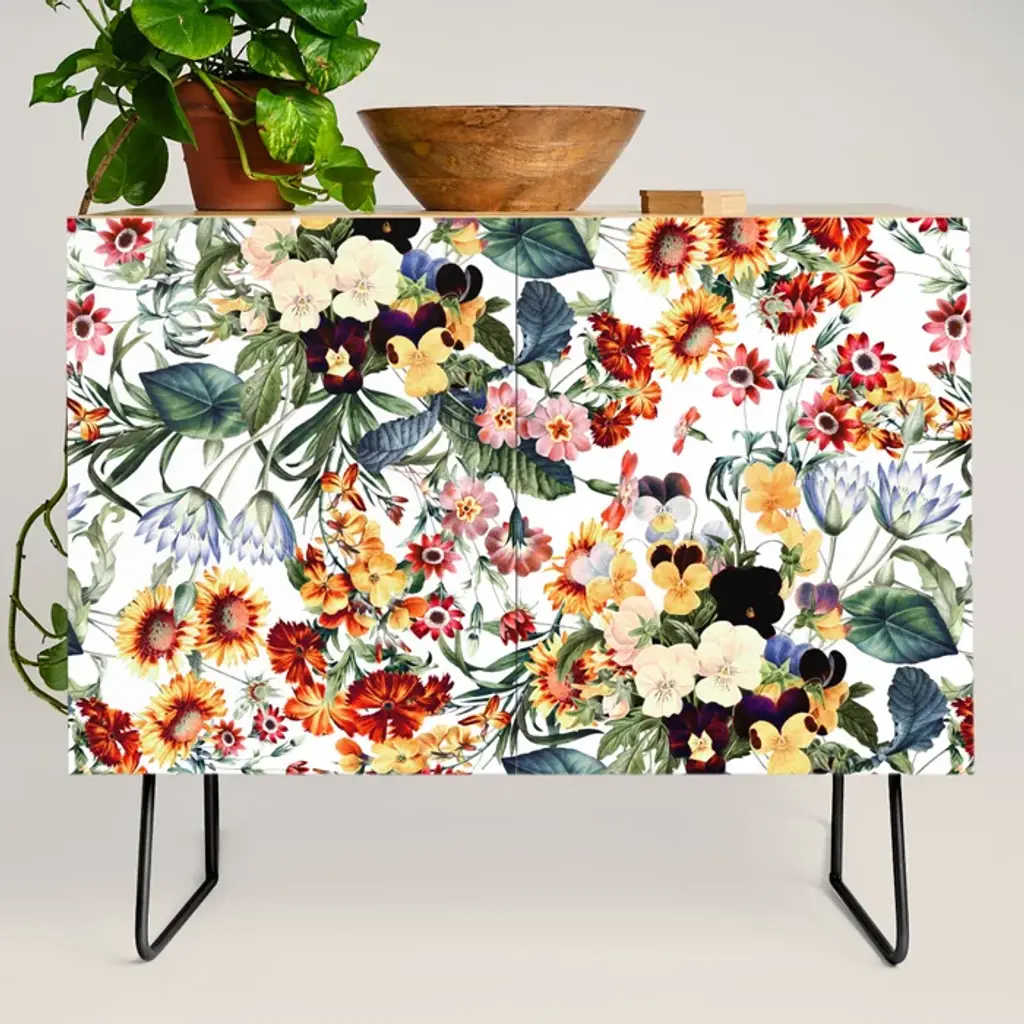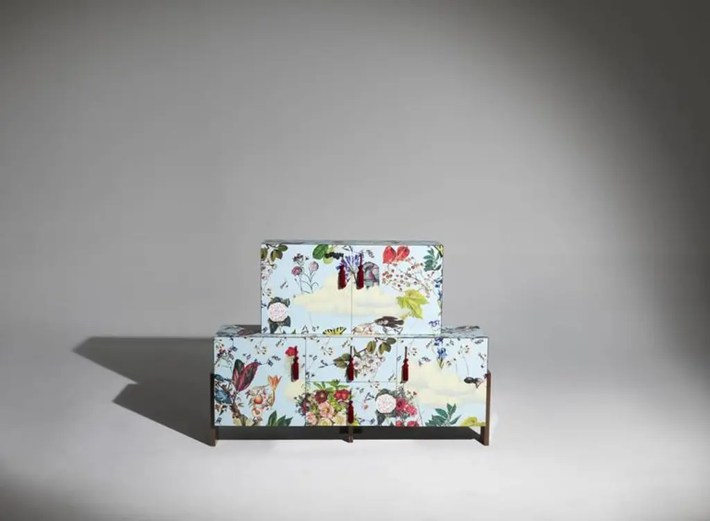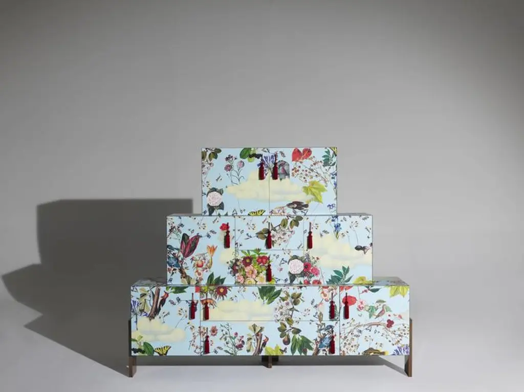 What could the design of a storage cabinet be like today? This is the question Driadelab, Driade’s observatory on contemporary lifestyles, asked itself when it started to research into this project. The result was Ziqquarat: a cabinet made up of different boxes that can be piled up to create ever changing forms. This system, constructive in all respects, can be used to create arrangements of three different sizes depending on the space available. The project’s source of inspiration, ancient Egyptian pyramids, is no random choice: it is such a strong theme that it even gave its name to the cabinet. The shapes and volumes of this special piece of furniture give it a unique personality. The surface finish, printed on laminate, is available in four, exclusive, designs. The patterns are contemporary and very easy to recognise: vintage collages, optical decors, textures that interpret the weaves suggested by the creativity of current trends. Ziqquarat is a piece of furniture that perfectly accomplishes its storage task while playing a main role in the masterpiece to which all our homes belong, approaching the world of art and touching our most sensitive strings. Cabinet made of printed bi-laminate with black walnut veneered feet. Cabinets in bi-laminate with flower, striped or geometric pattern made by digital printing. Inner parts in black laminate. Elements with doors and removable inner shelf. Drawers with shock absorbing closing system. Ground supports are made of Canaletto walnut with glossy finish for flower version or made of glossy black lacquered bi-laminate for other versions.The single boxes are available with the following decorations:box W. 94.4 inches with white and black stripes decoration, box W.70.8 inches with white and red stripes decoration and box W. 47.2 inches with black and white decoration.