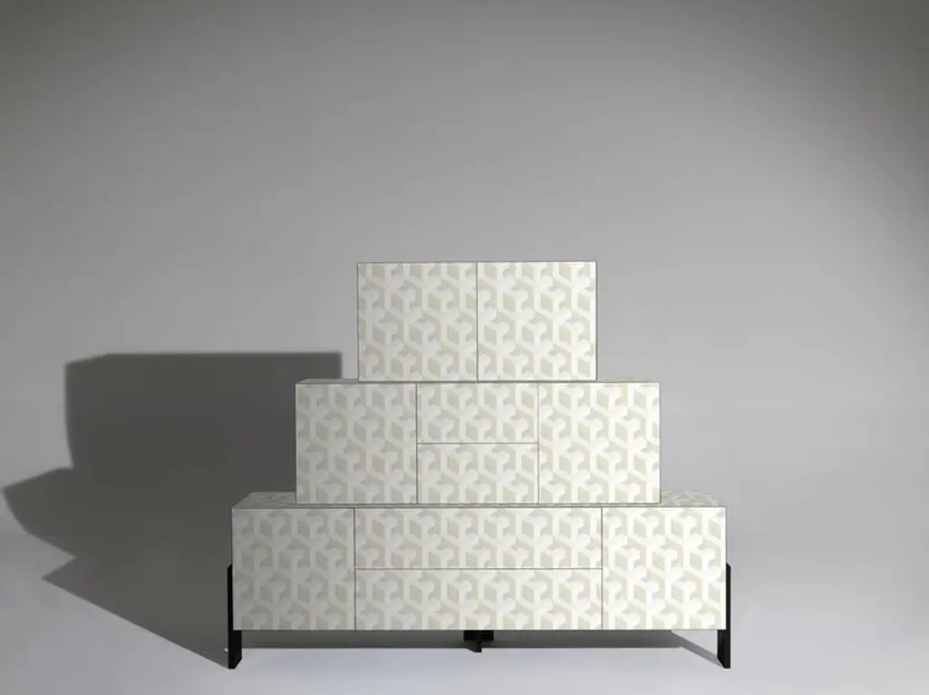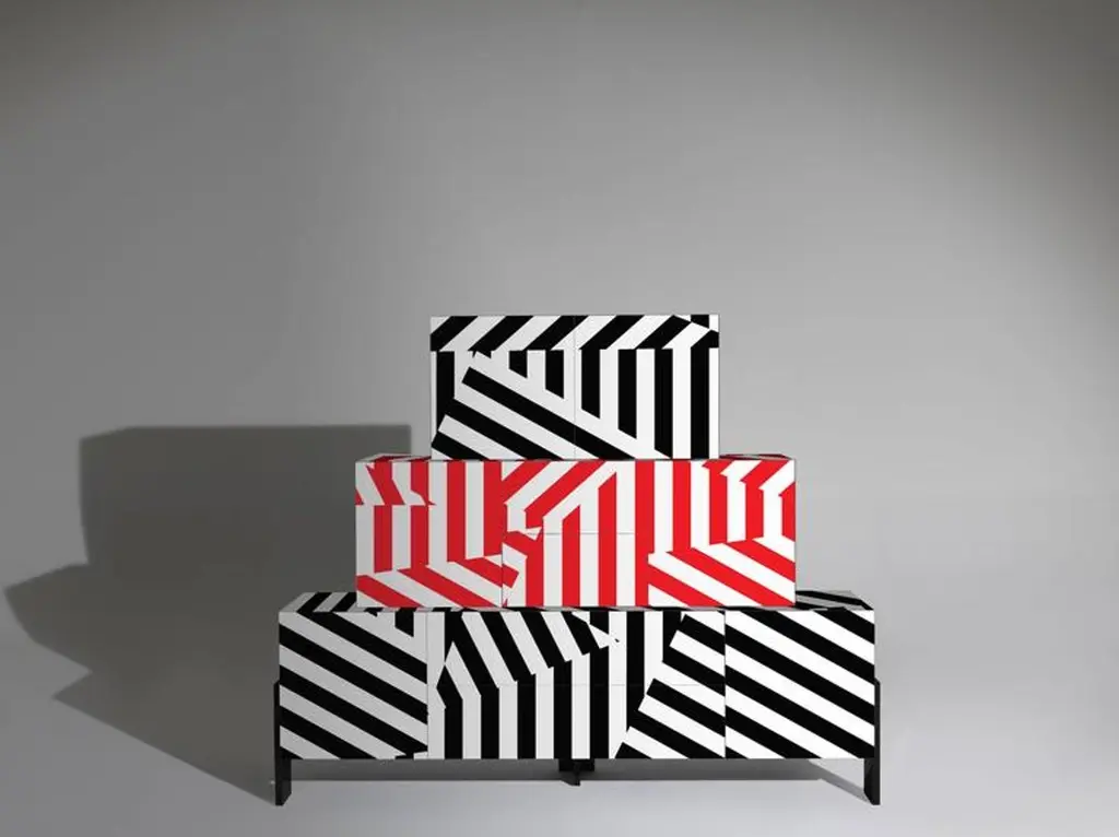 What could the design of a storage cabinet be like today? This is the question DriadeLab, Driade’s observatory on contemporary lifestyles, asked itself when it started to research into this project. The result was Ziqquarat: a cabinet made up of different boxes that can be piled up to create ever changing forms. This system, constructive in all respects, can be used to create arrangements of three different sizes depending on the space available. The project’s source of inspiration, ancient Egyptian pyramids, is no random choice: it is such a strong theme that it even gave its name to the cabinet. The shapes and volumes of this special piece of furniture give it a unique personality. The surface finish, printed on laminate, is available in four, exclusive, designs. The patterns are contemporary and very easy to recognise: vintage collages, optical decors, textures that interpret the weaves suggested by the creativity of current trends. Ziqquarat is a piece of furniture that perfectly accomplishes its storage task while playing a main role in the masterpiece to which all our homes belong, approaching the world of art and touching our most sensitive strings. Cabinet made of printed bi-laminate with black walnut veneered feet. Cabinets in bi-laminate with flower, striped or geometric pattern made by digital printing. Inner parts in black laminate. Elements with doors and removable inner shelf. Drawers with shock absorbing closing system. Ground supports are made of Canaletto walnut with glossy finish for flower version or made of glossy black lacquered bi-laminate for other versions.Measure: The single boxes are available with the following decorationsbox W. 94.4 inches with white and black stripes decoration, box W.70.8 inches with white and red stripes decoration and box W. 47.2 inches with black and white decoration.