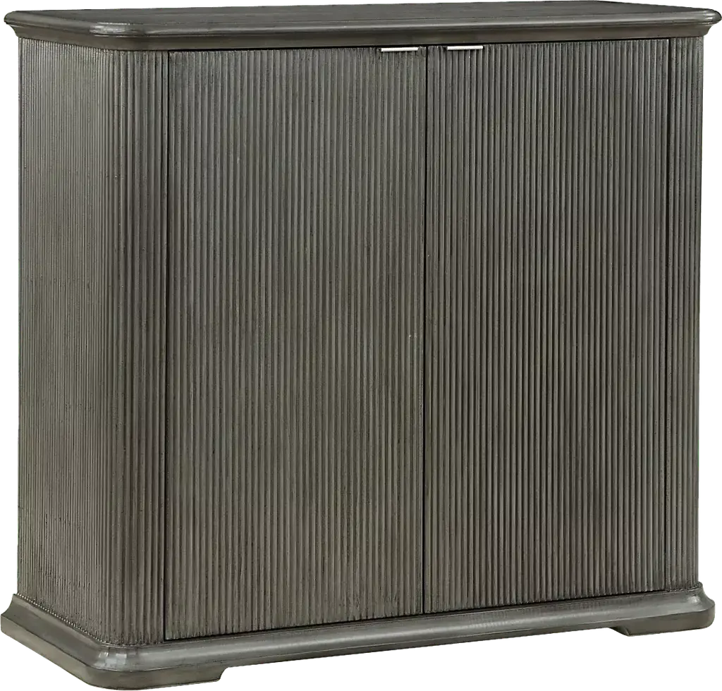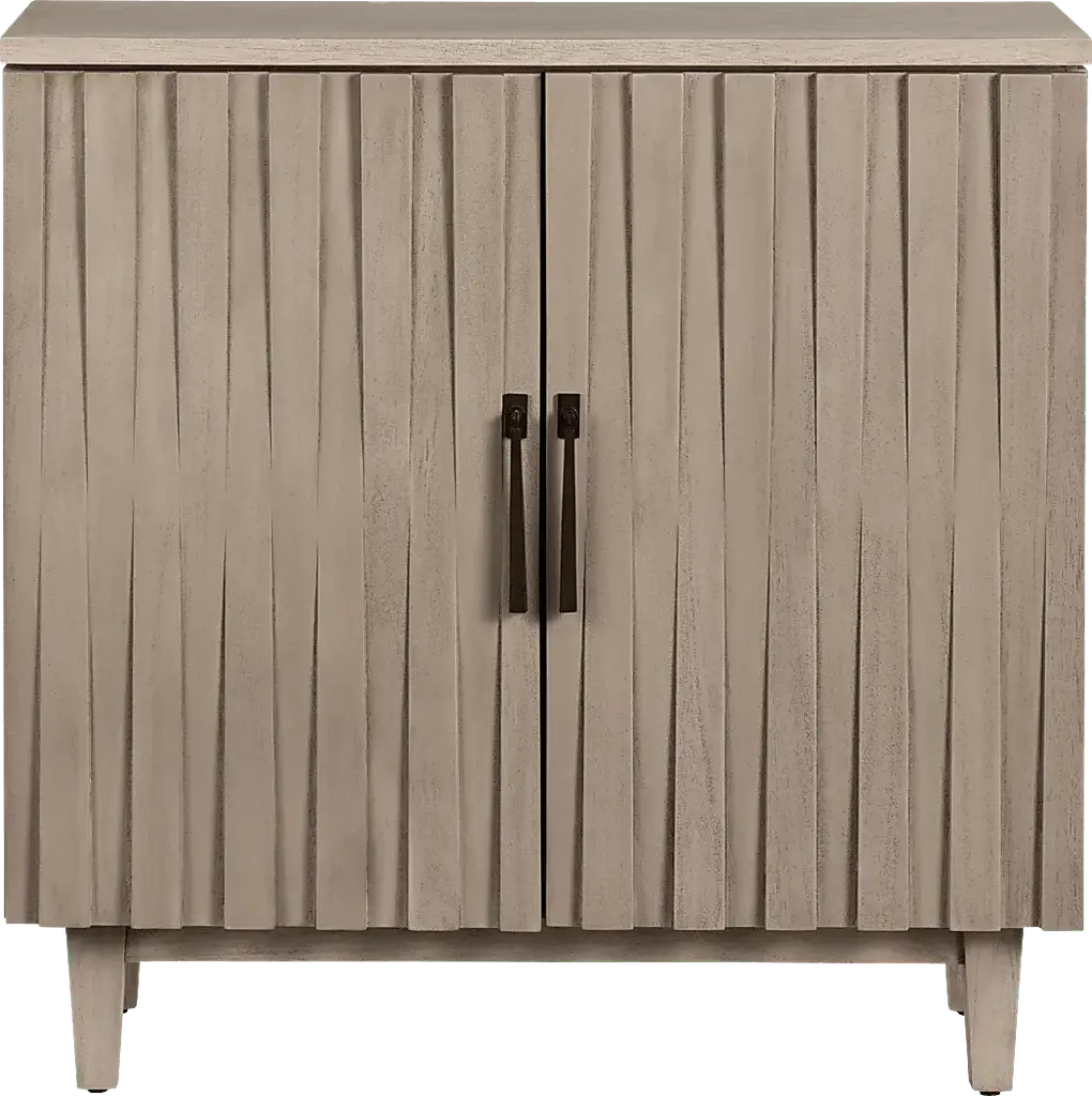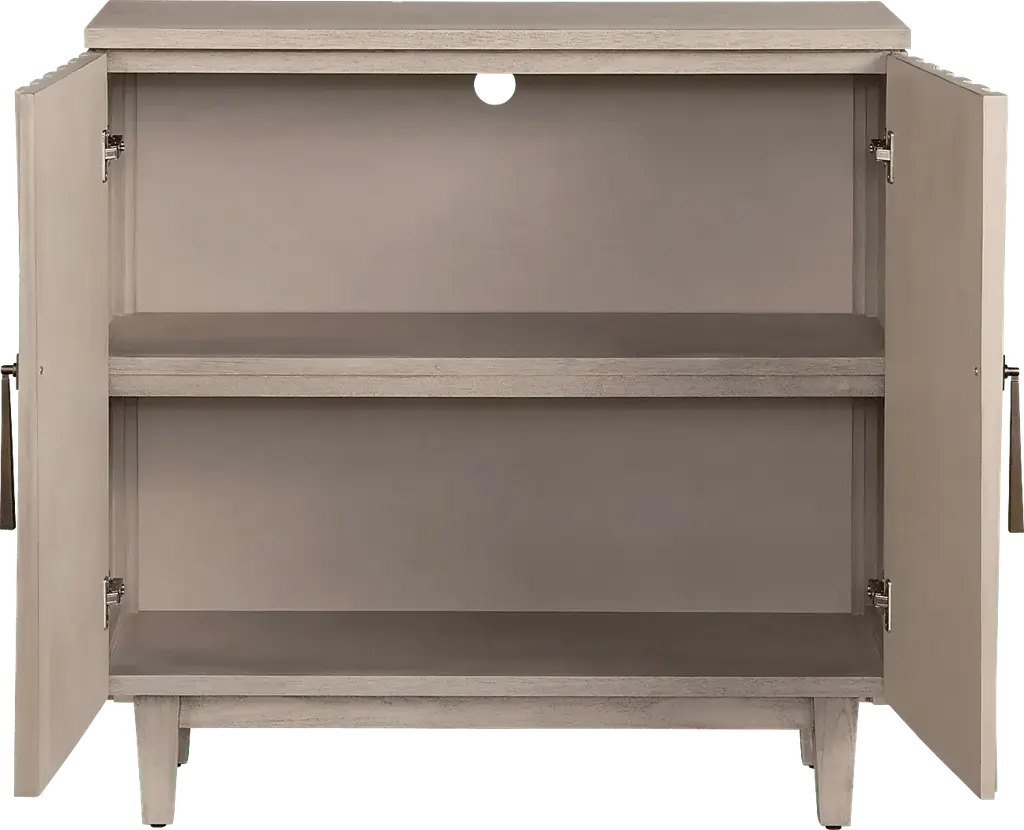 The Drifthousen tan accent cabinet offers a blend of function and style with its tan finish with dark undertones and painted surface, creating a warm, inviting aesthetic. The rectangular body features a subtly textured vertical groove design on the front, complemented by oversized pendant pulls in an aged copper finish. European hinges ensure smooth door operation, revealing a fixed shelf for organized storage. A cord management hole enhances versatility, while the sturdy base with tapered legs completes the look. No assembly required, simply set it up and enjoy.