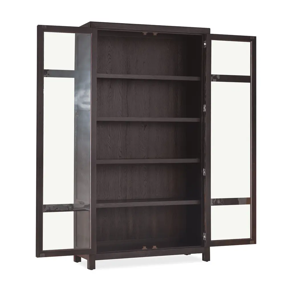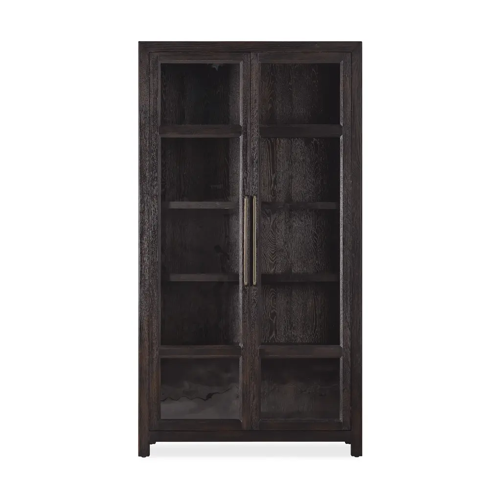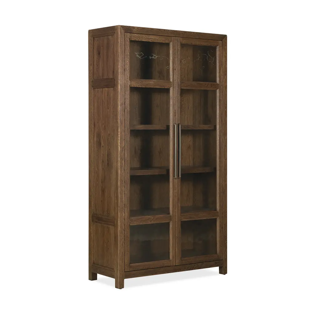 Bringing rustic warmth and vintage charm to your dining space, the Driftwood Display Cabinet from Hooker Furniture is a beautiful blend of texture and character. This tall, elegant cabinet is crafted from oak solids and veneers, with a distressed finish that celebrates the wood's authentic knots. The two doors feature wood frames and seeded glass panels, adding a touch of old-world charm while allowing a glimpse of the treasures within. Inside, four adjustable shelves provide the perfect stage for showcasing your favorite collectibles or dishware. Highlights: