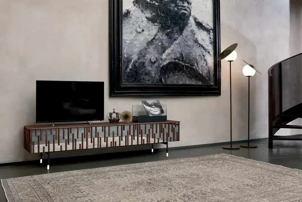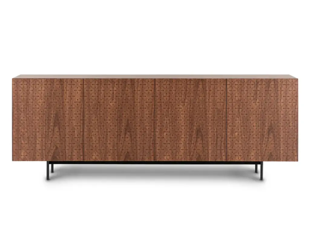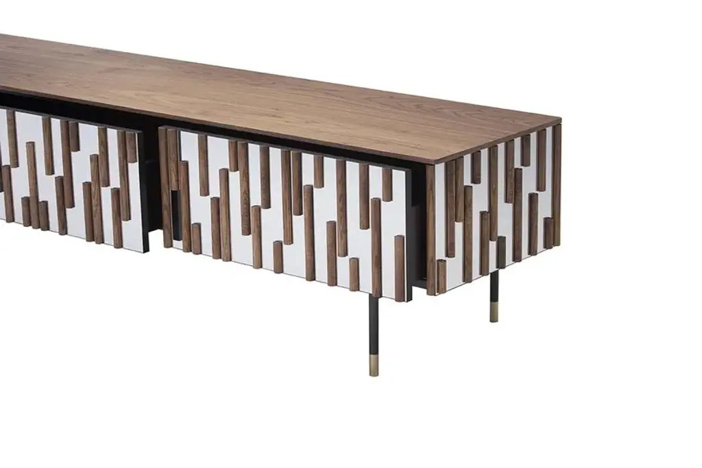 A complete and extremely elegant day program. Solid wood drops applied with extreme care to the mirror effect doors. A fine and sophisticated shaped and rounded top; a metal frame with gold-finish inserts. All this to leave nothing randomly.
