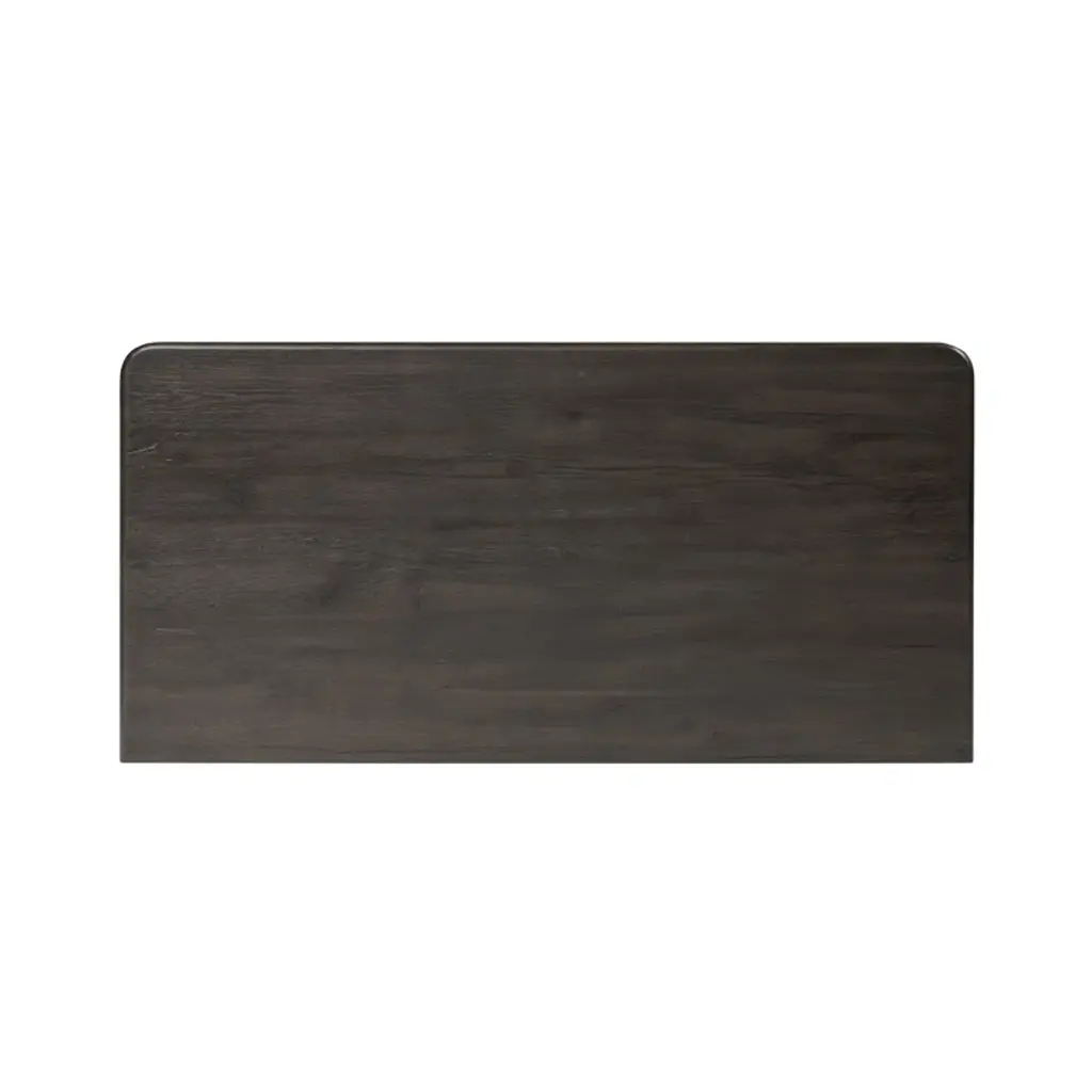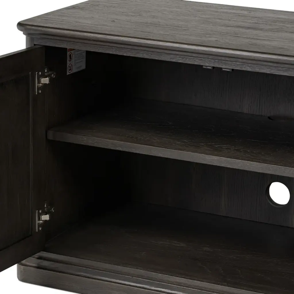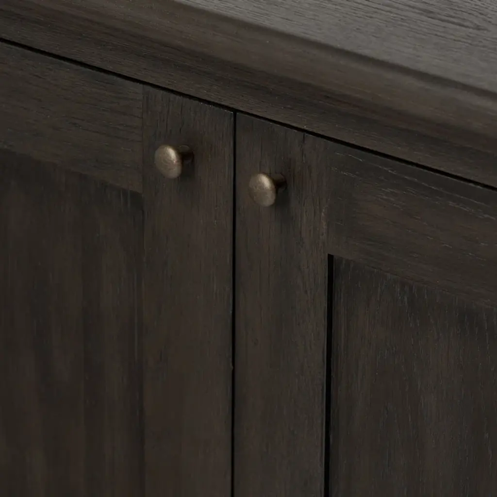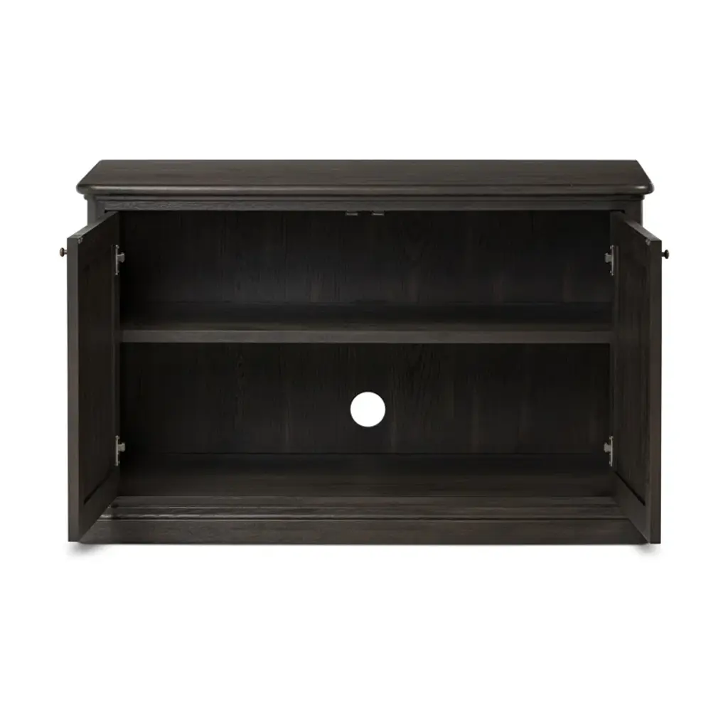 A design collaboration by Amber Lewis and Four Hands. Smaller in scale yet impactful, a smoked black oak cabinet features two doors with understated bronzed iron hardware. Opens to wide shelving, creating extra storage in any room.