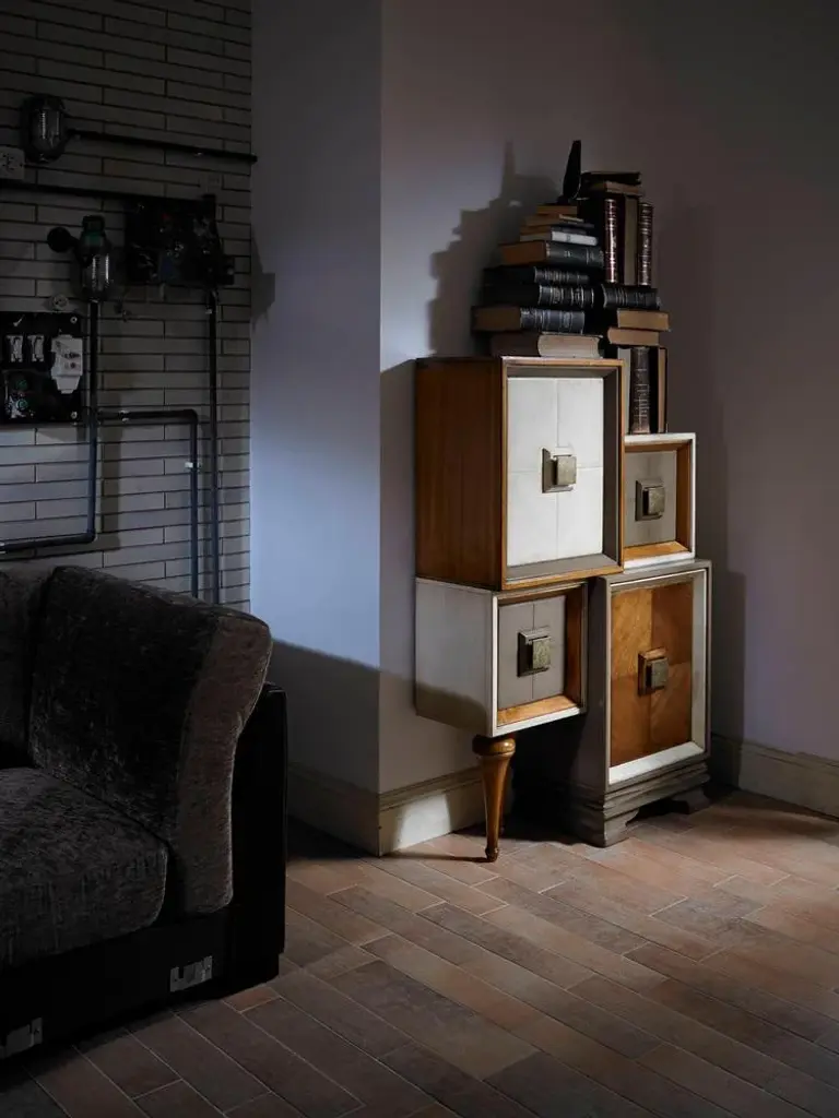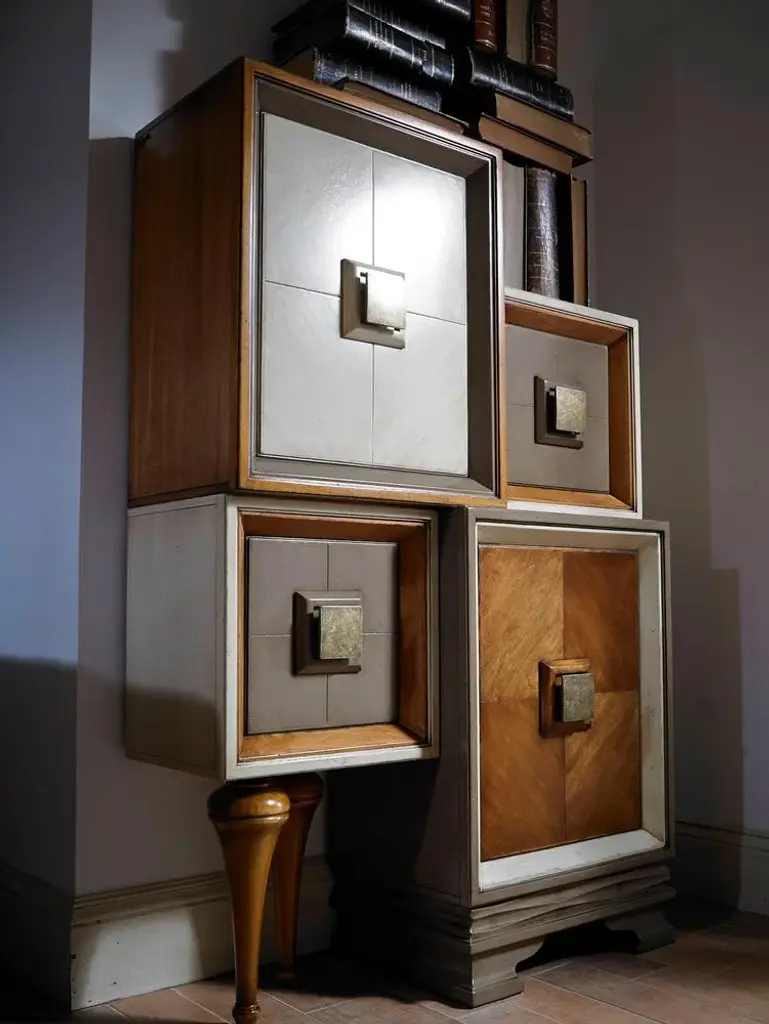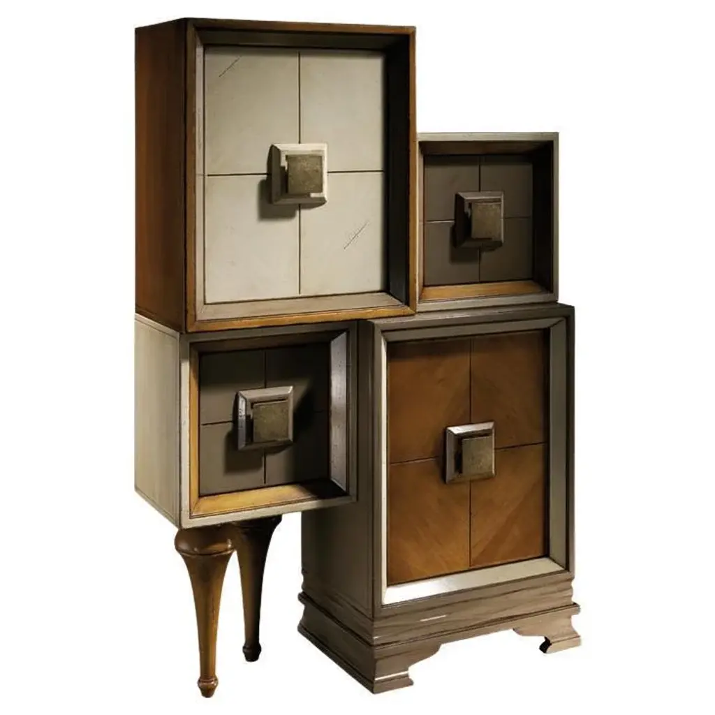 Dinastía Entry Cabinet by Lola Glamour Dimensions: D 35 x W 88 x H 135 cm Materials: Wood. The smallest of the Dynasty series, but not for that reason renounces its grandeur. Four-door modules with slanted moldings and diamond plates that sum up the idea of disorder as a generator of balance and harmony. All this is nuanced with neutral tones that sit on an original combination of carefully chosen legs. Remember that you can take this work as a starting point to create your own combination of finishes and shapes.