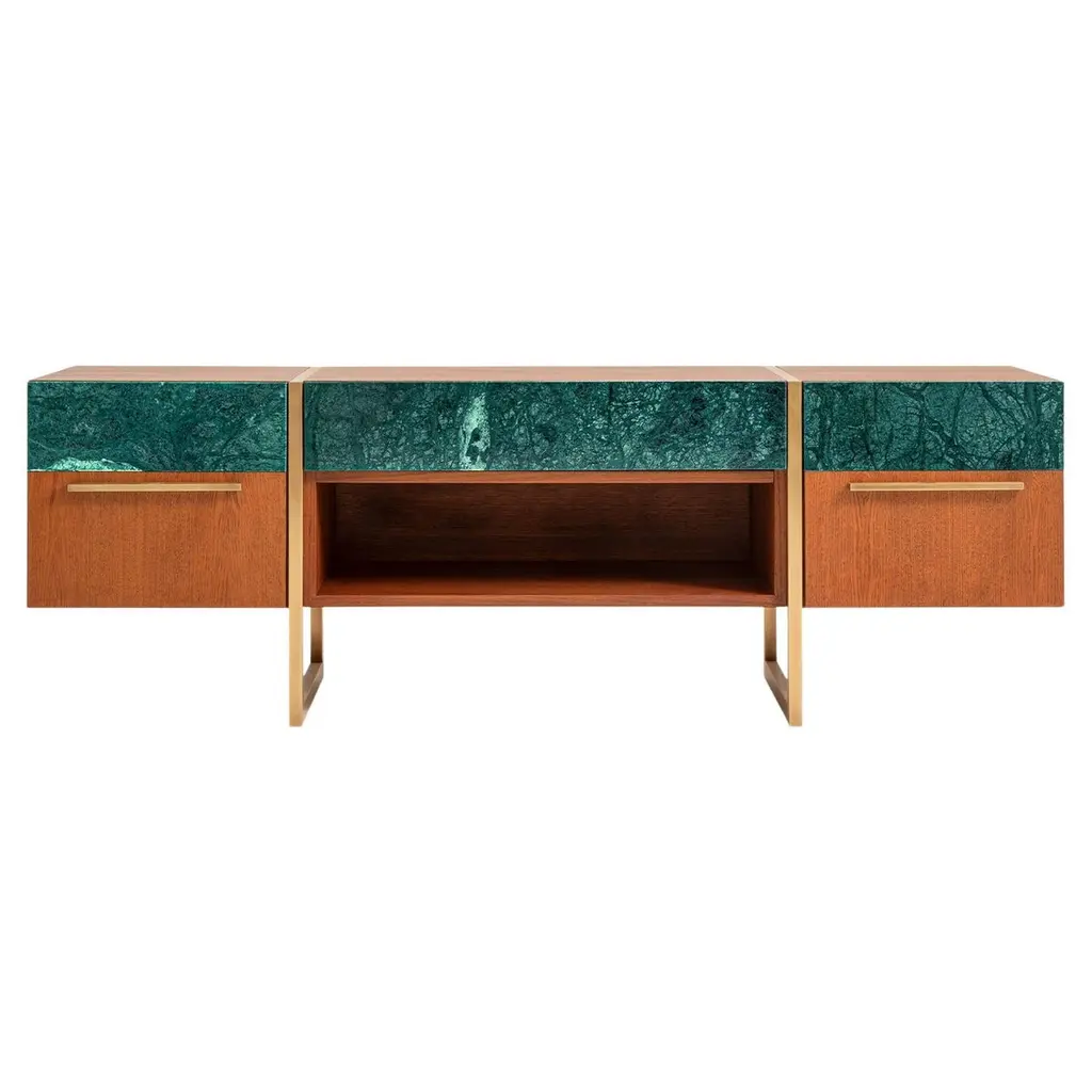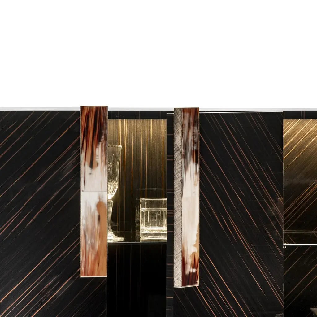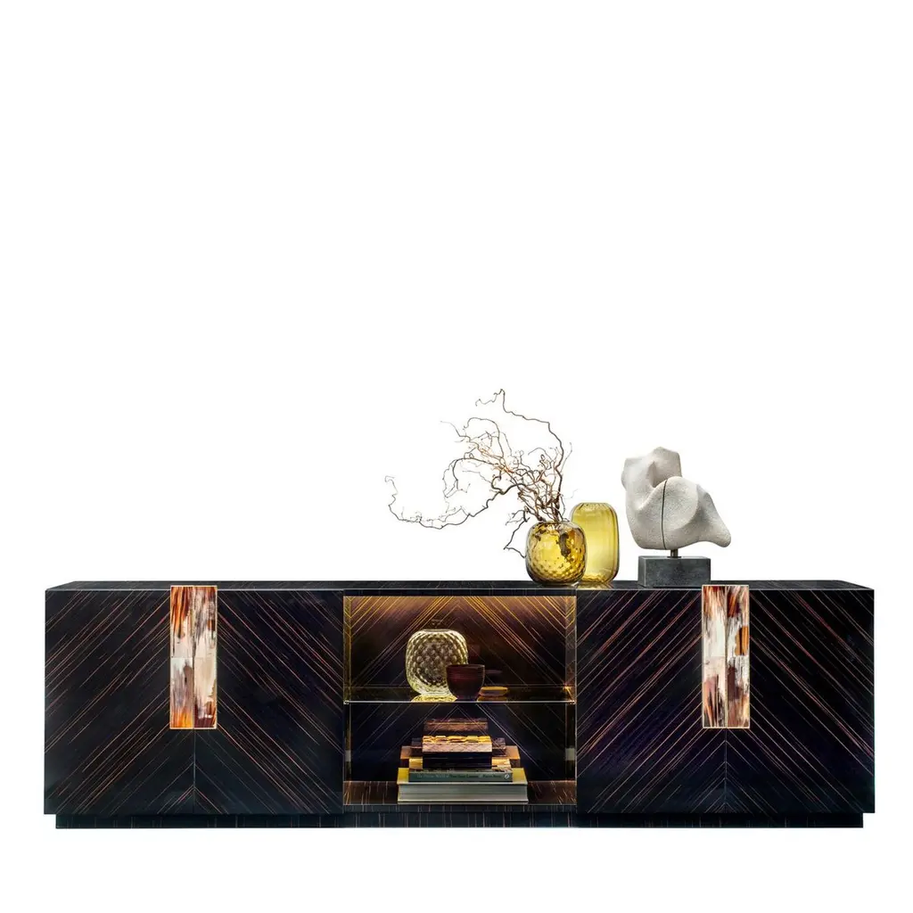 The lavish, glossy ebony veneer characterizing this 4-door, horizontal cabinet bestows it a luxurious allure. Its structure comprises a central compartment with a suggestive LED lighting system and the two side compartments boast plush, rectangular brass handles, which are hand-engraved and feature a 24-karat gold plating with horn inlays for an even more precious result. Tempered bronze glass shelves complete this striking piece of furnishing. Customizations in finishes and dimensions are available.