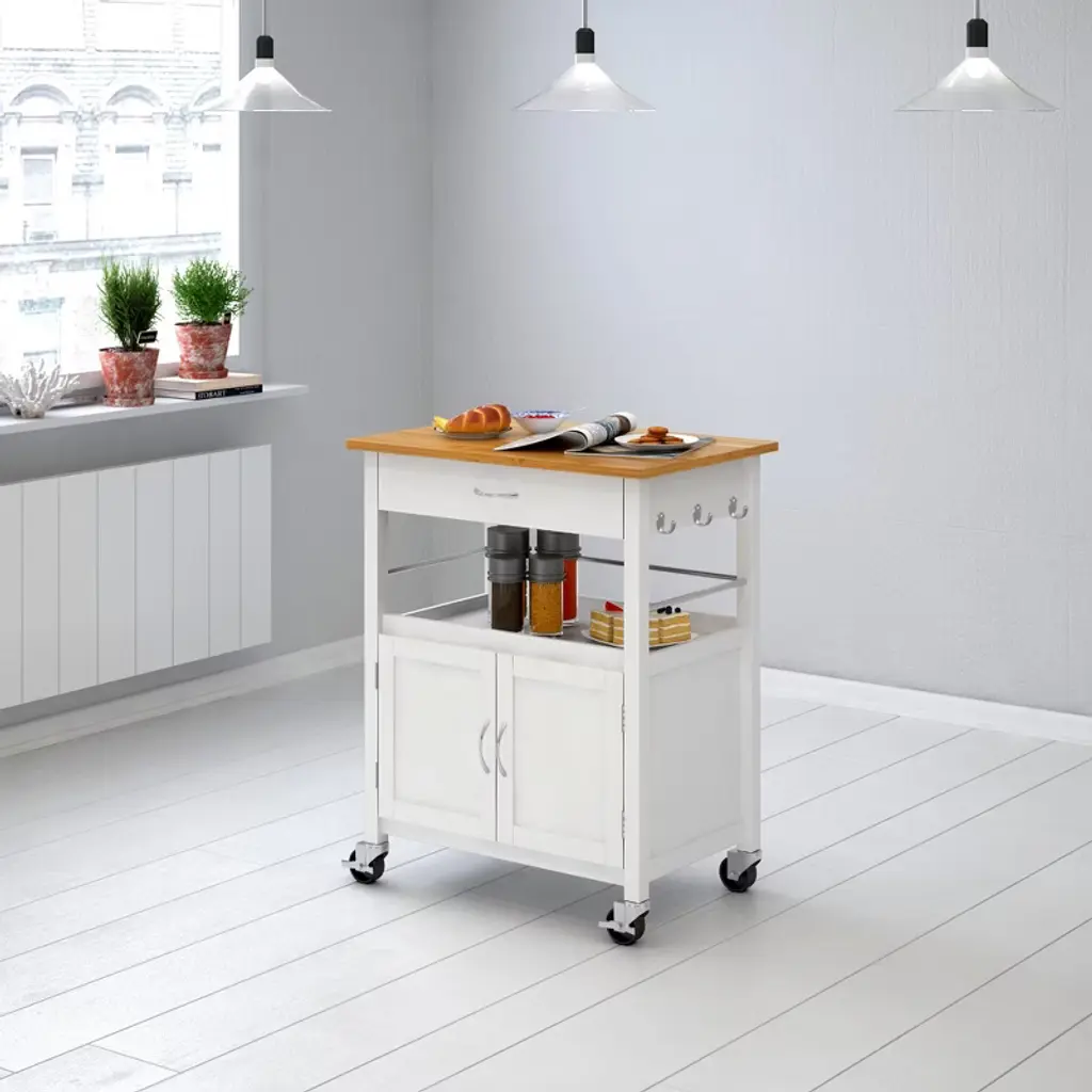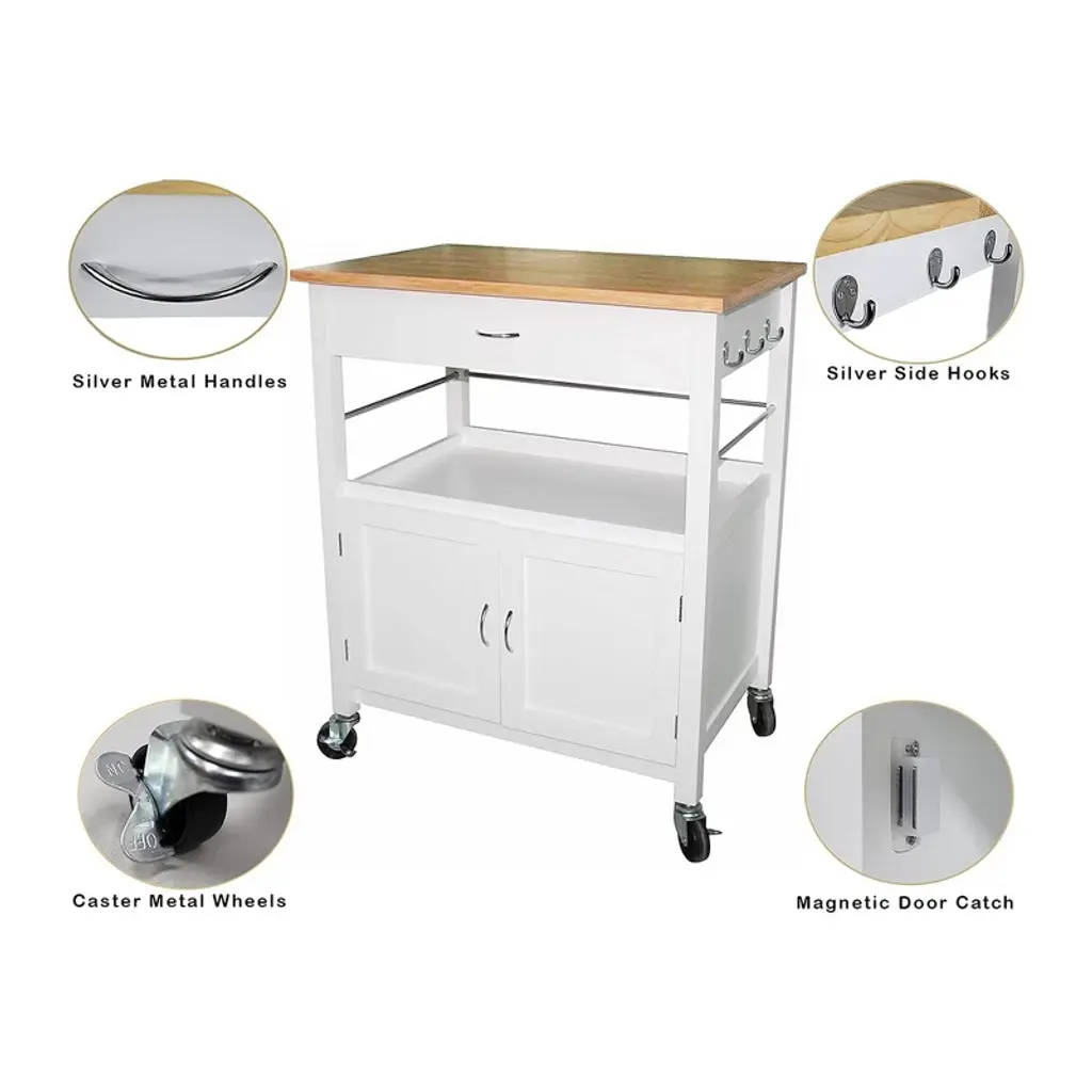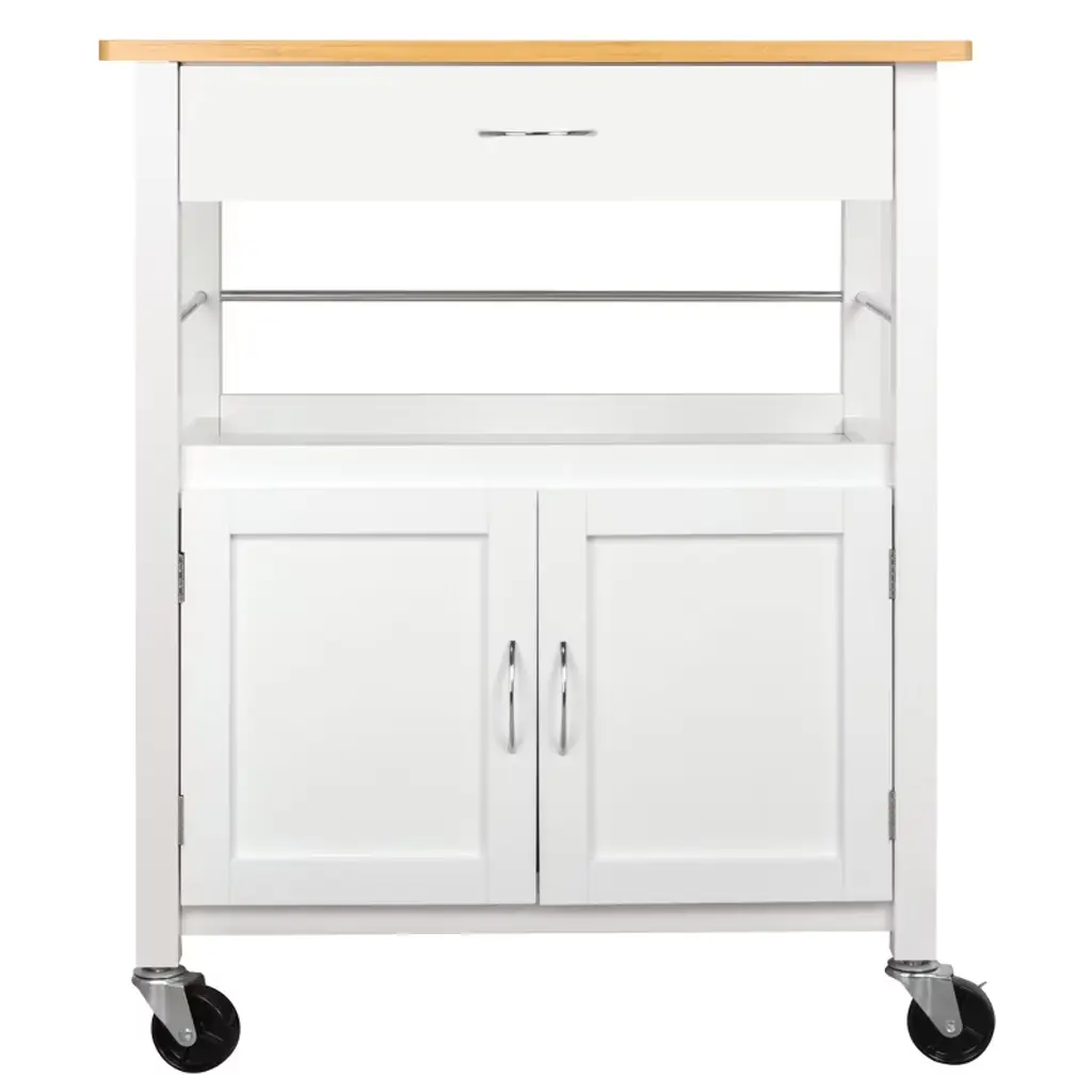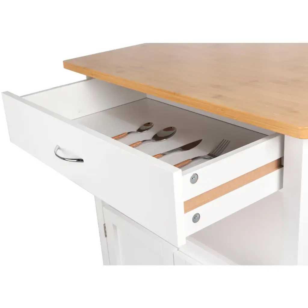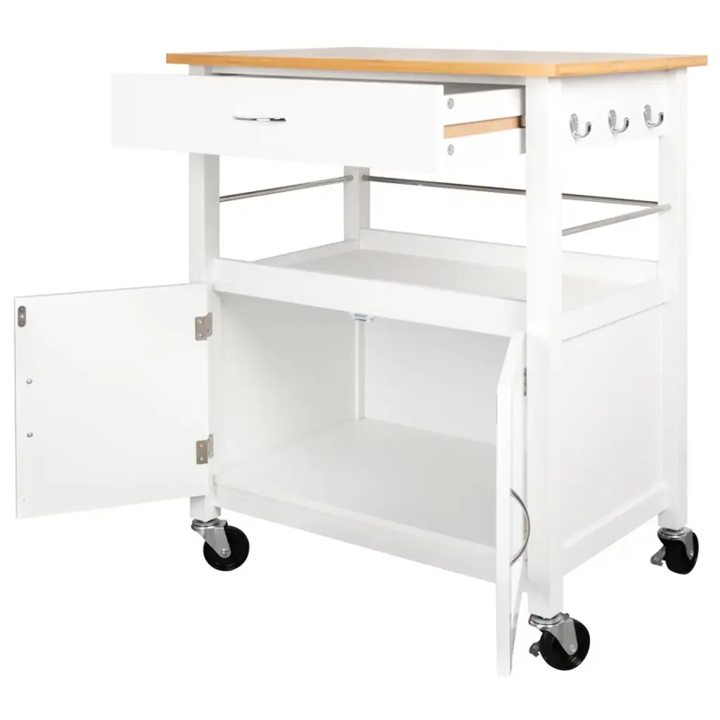 Add more prep and storage space with the eHemco Kitchen Island Cart. The bamboo top offers a butcher block for cutting and other tasks while the base coordinates with your decor. A slide out drawer, cabinet and an open shelf offer storage for ingredients, utensils and more. Metal bars and 3 hooks provide a convenient spot to hang towels and other items. This natural cart is also easy to move from place to place with locking caster wheels.