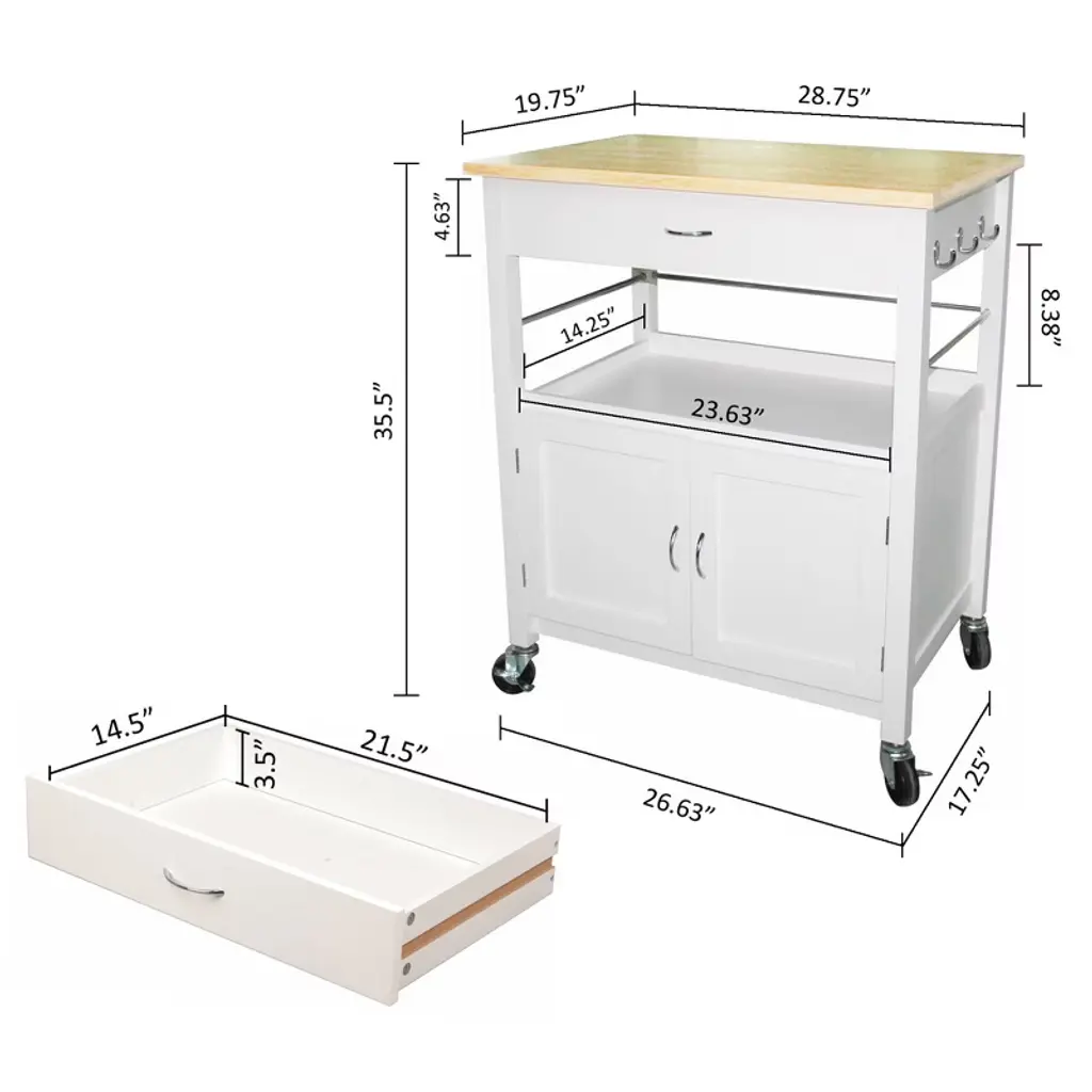 Ehemco Kitchen Island Cart On Wheels With Drawer, Storage Cabinet, Shelf And Natural Bamboo Top Butcher Block, 35.5 Inches Height, White