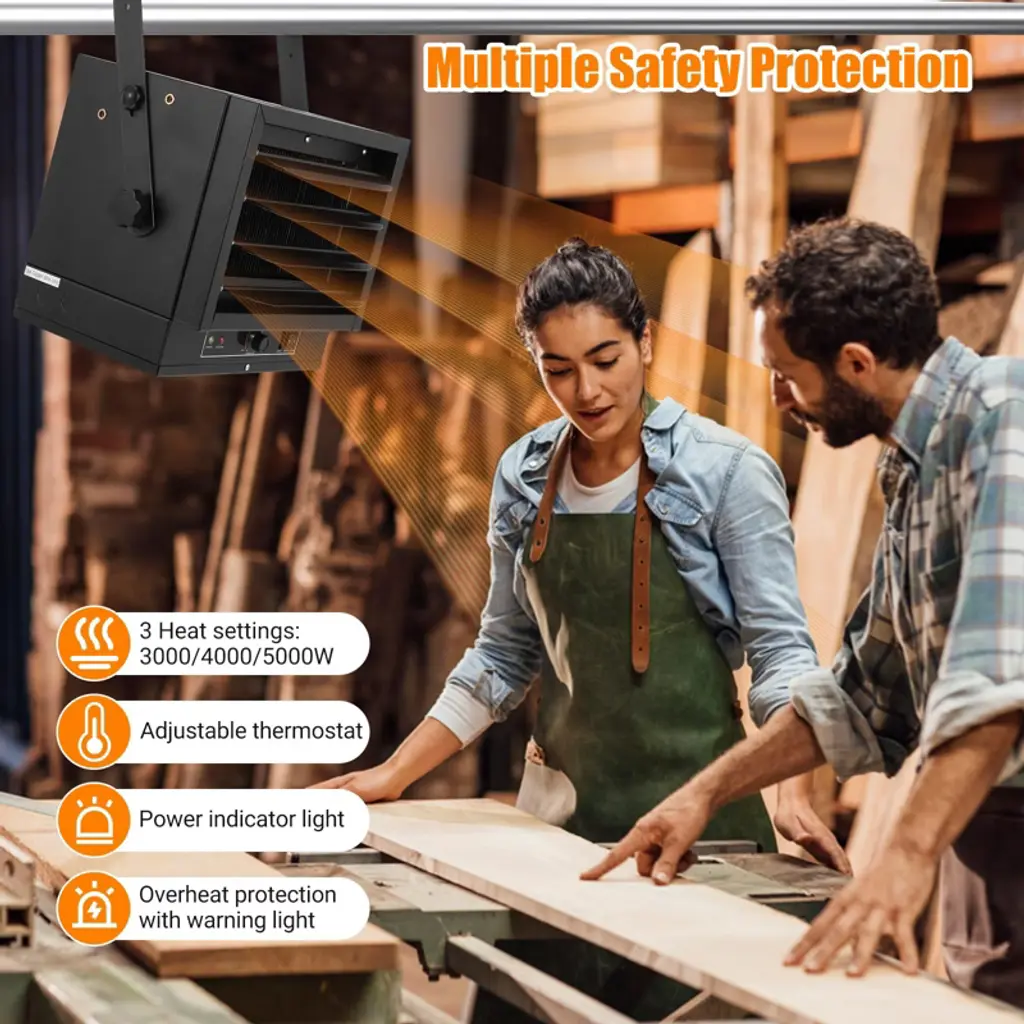 Garage Heater, Electric Garage Heater 5000W 240V Hardwired - Ceiling Mount Space Heater with Fan-Forced Heating, Overheat Protection, Manual Thermostat for Workshop?? Efficient Ceiling Mount DesignMaximize your valuable floor space with this professionally designed ceiling-mounted electric garage heater. Perfect for garages, workshops, warehouses, and storage areas where floor space is at a premium, this hardwired installation keeps your working area completely unobstructed. The ceiling mounting position provides optimal heat distribution throughout your space while maintaining safety by positioning the heating unit safely overhead. This space-saving solution delivers powerful heating performance without compromising your valuable floor area.?? Adjustable Angle & Three Heat SettingsCustomize your heating experience with adjustable louvers and variable mounting angles that direct airflow precisely where needed. With a maximum output of 17,065 BTUs, this powerful heater efficiently warms areas up to 500 square feet. Choose from three distinct heat settings¡ª3,000 watts, 4,000 watts, and 5,000 watts¡ªto match your specific heating requirements during varying cold weather conditions. The flexible positioning and multiple power levels ensure optimal comfort while conserving energy when full power isn't necessary.??? Built-in Thermostat & Overheat ProtectionMaintain perfect working conditions with the integrated manual thermostat offering adjustable temperature control from 45-95¡ãF (7-35¡ãC). The intelligent overheating protection system features a built-in sensor that automatically shuts off the device if unsafe temperatures are detected, providing essential safety for both the equipment and your property. The caution indicator light clearly signals operational status, while the ETL compliance certification ensures the unit meets rigorous safety standards.??? User-Friendly Temperature ControlExperience straightforward operation with the convenient knob thermostat that provides precise temperature management. The intuitive control design allows easy adjustment of heat output to achieve your desired comfort level. Quick on/off functionality ensures immediate heating when needed, with simple knob adjustments making operation accessible to all users. The clear, uncomplicated interface eliminates guesswork while providing reliable performance in demanding workshop environments.?? Safe Hardwired InstallationDesigned with safety as the priority, this heater requires professional hardwired installation to a 240V circuit, providing more secure operation than plug-in designs. The unit includes intelligent safety features including automatic overheating shutdown and a clear power indicator light that shows operational status at a glance. Proper installation by a qualified electrician ensures compliance with National Electric Code standards and local regulations, guaranteeing safe, reliable performance for years to come.?? Technical Specifications: Brand: TruAIR Color: Black Form Factor: Cabinet Item Weight: 22.35 Pounds Power Source: 240V Hard-Wired Heating Method: Fan-Forced Air Heat Output: 17,065 BTU Power Settings: 3,000W / 4,000W / 5,000W Coverage Area: Up to 500 sq ft Temperature Range: 45-95¡ãF (7-35¡ãC) Special Features: Manual Thermostat, Overheat Protection Installation: Ceiling Mount Safety Certification: ETL Compliant Usage: Indoor Only ? Key Product Features:? Powerful heating capacity - 5000W, 17,065 BTU output? Three heat settings - 3000W, 4000W, 5000W options? Ceiling mount design - saves valuable floor space? Adjustable louvers - direct heat where needed? Overheat protection - automatic safety shutoff? Manual thermostat - precise temperature control (45-95¡ãF)? Hardwired installation - safer than plug-in designs? ETL certified - meets safety standards? Fan-forced heating - rapid, even warmth distribution? Durable construction - industrial-grade components