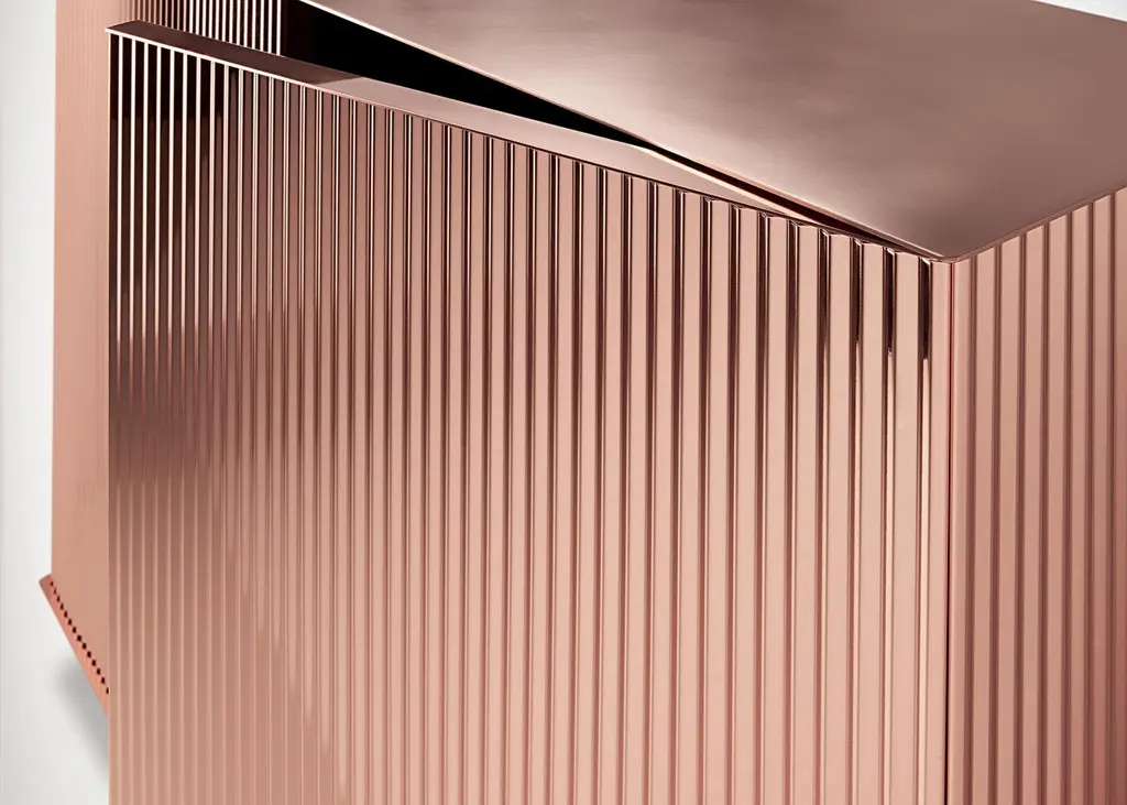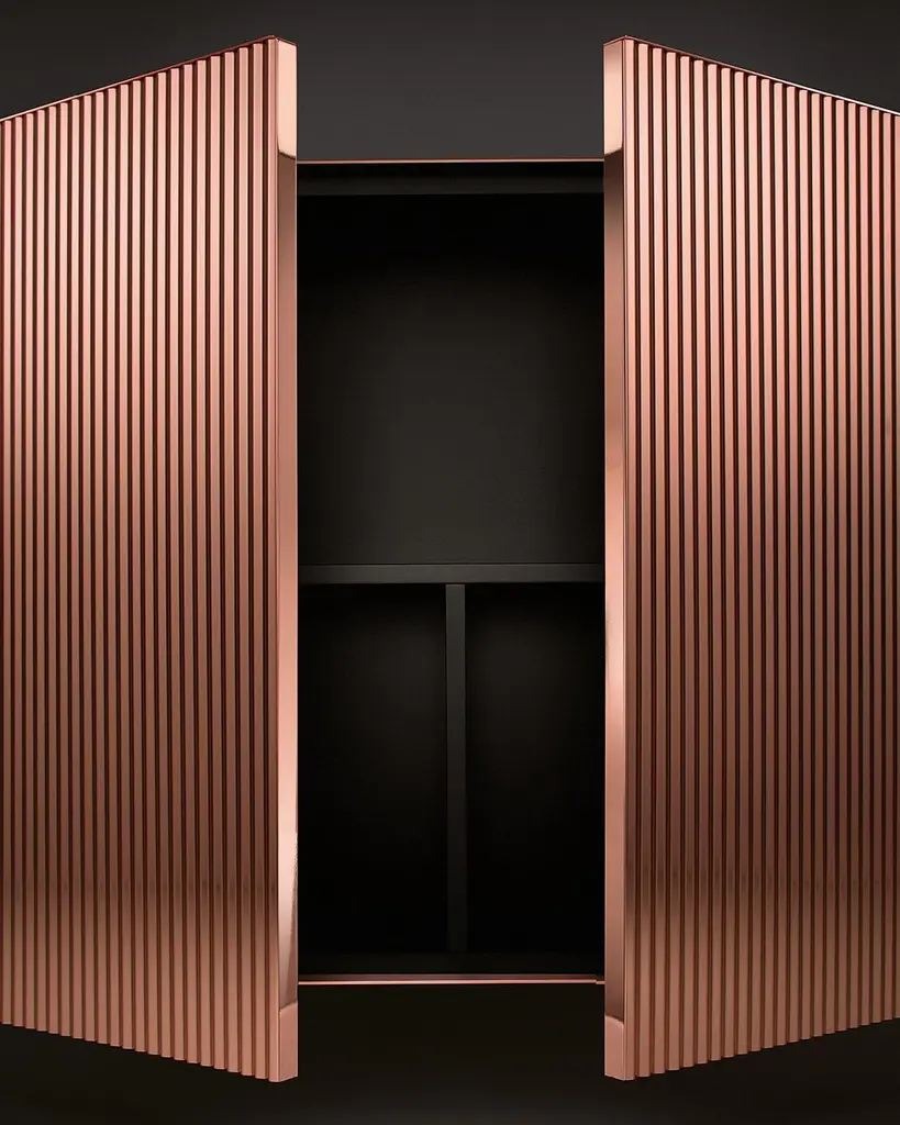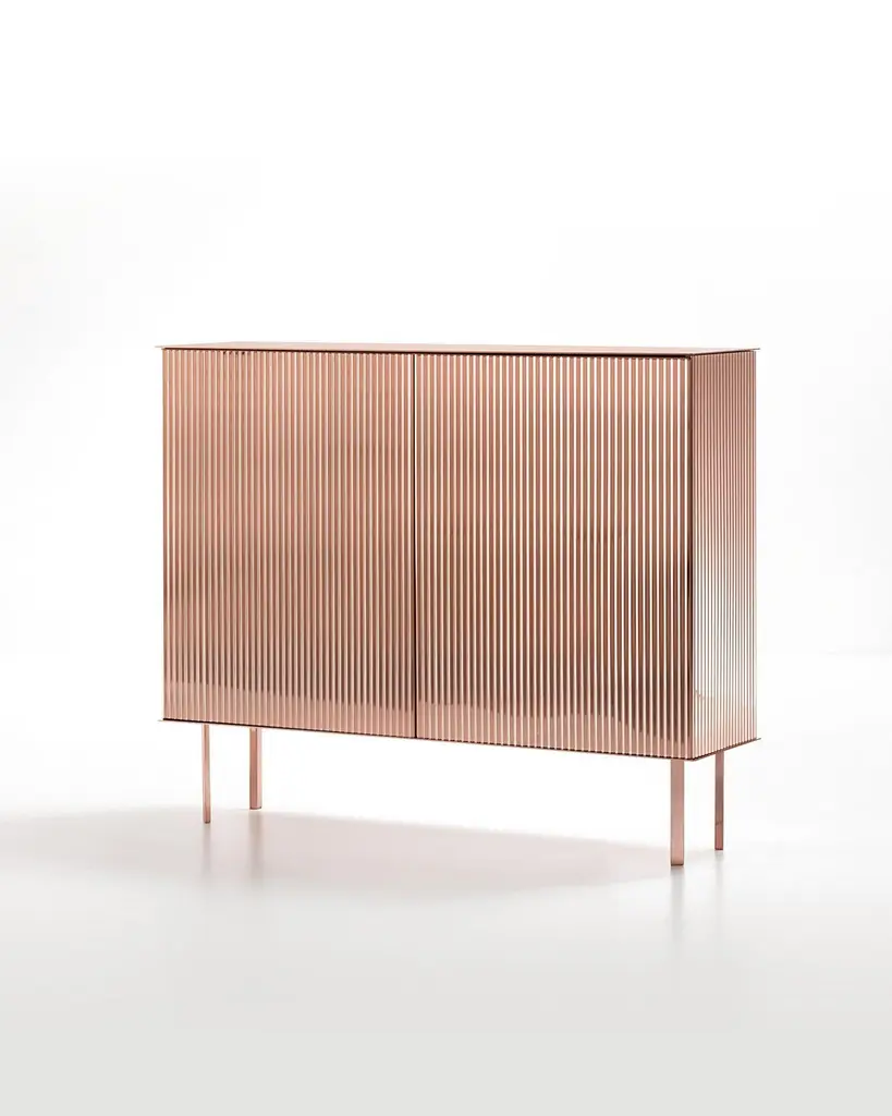Like a ballerina on her toes, Elizabeth gracefully unfurls her luminous dress, as if made of pleated fabric. The characteristic folds add movement to the metal sheet along the surface of the cabinet, transforming each reflection into the light. In an interplay of airiness and tension, elasticity and rigor, the metal vibrates with the rhythm of its pleats. Elizabeth gives shape to a new way of imagining unambiguously feminine metal furniture.Finish: Copper.