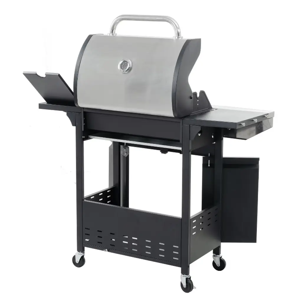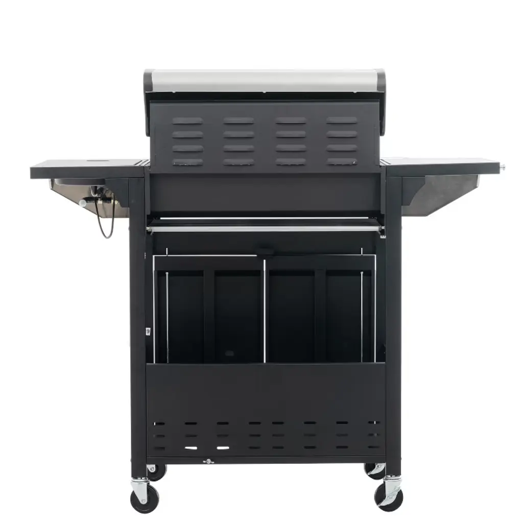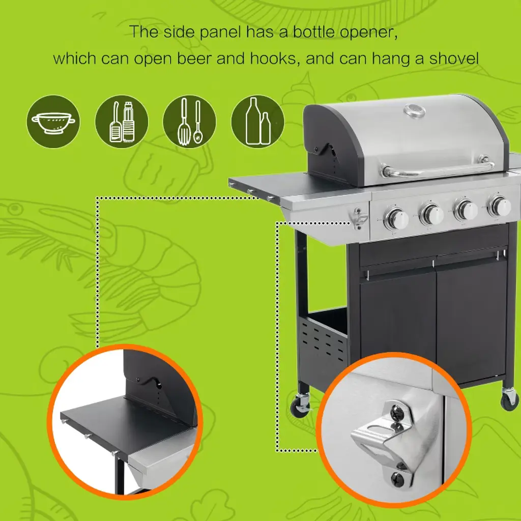 This 4-burner gas grill is made of exclusive stainless steel and porcelain enameled iron materials. The cooking space of this grill includes a main grilling area as well as a warming area, totaling a total of 387 sq.in, which is more than enough cooking space for small gatherings or large parties. Its even-heat cooking system, which includes stainless steel burners, enameled flame arrestors, and an enhanced grill pan, is fixed on wheels for easy mobility and anchoring, and each burner can be ignited independently, and these components work together to distribute heat consistently across the entire cooking surface, reducing sparks and splatters while grilling. It also has 2 wheels for easy movement and fixing.