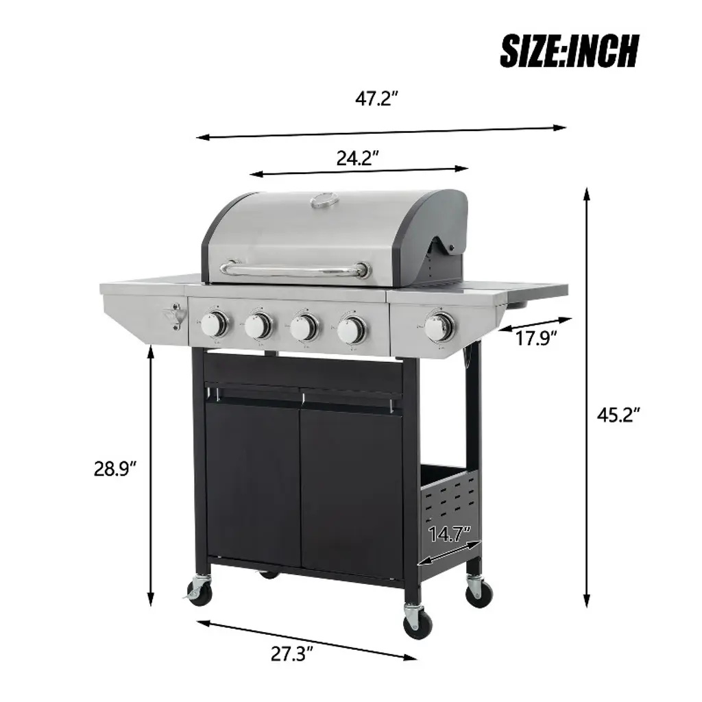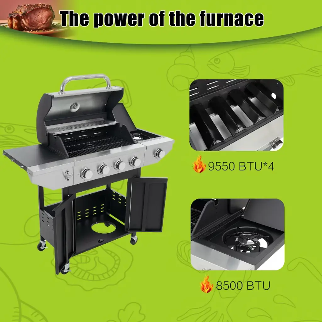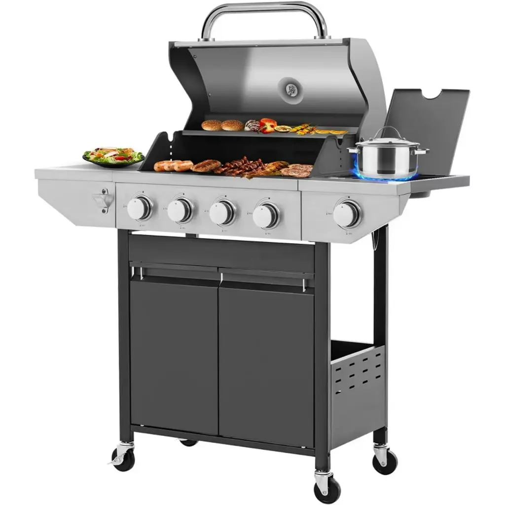 Eljget 4-burner Propane Gas Grill With Side Burner, 46700 Btu Outdoor Cooking Stainless Steel Bbq Grills Cabinet, Black