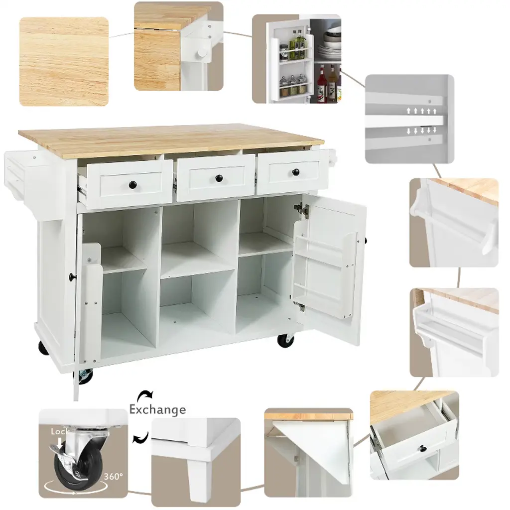 Eljget Kitchen Island With Storage Rolling Kitchen Cart Storage Cart With Drop Leaf Countertop, Storage Cabinet And 3 Drawers For Dinning Room, White