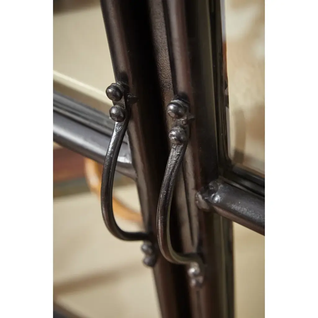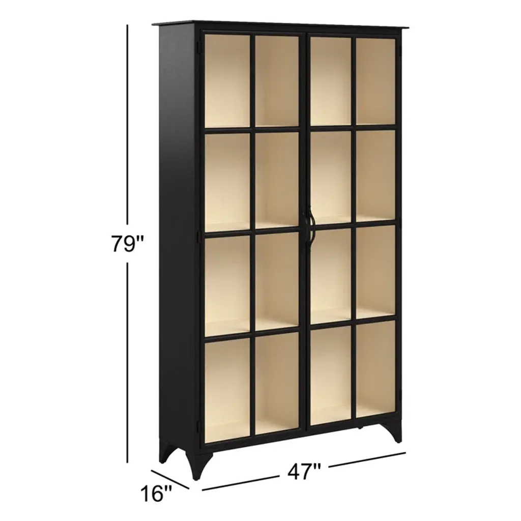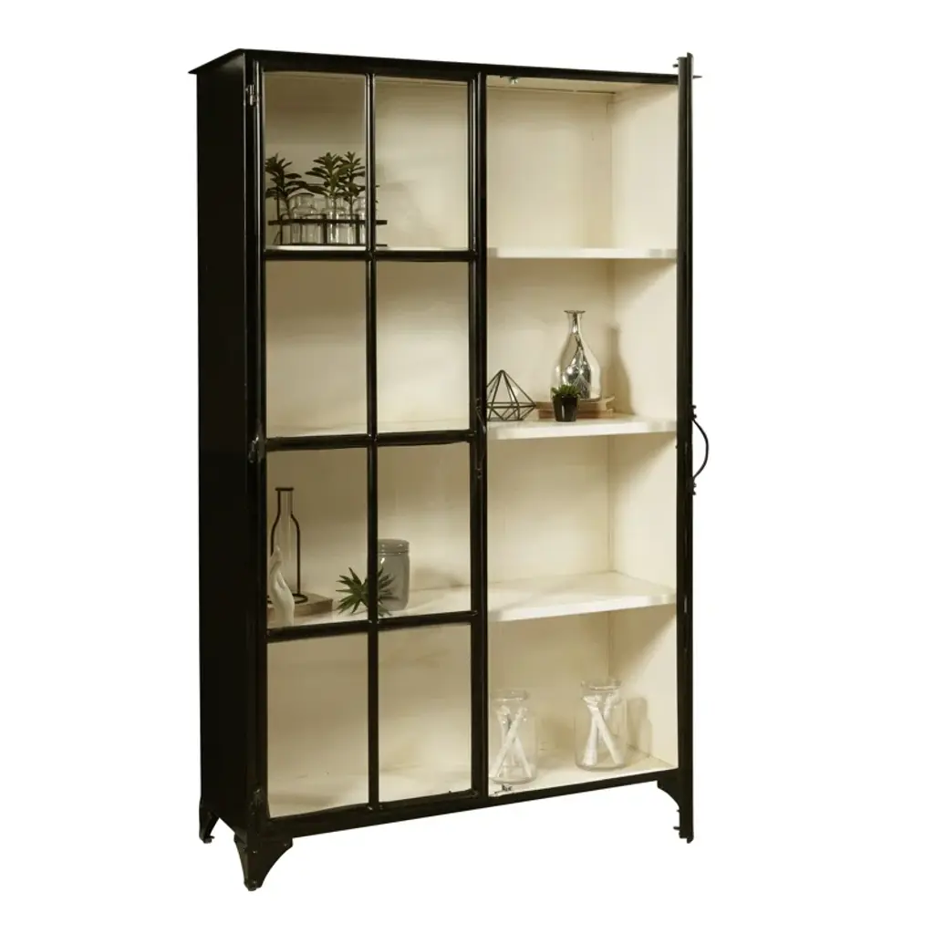 This display case is a great choice, whether you're looking for a place to display family heirlooms, or want some easy-access storage for board game nights. It's crafted from iron in a dark finish with a straightforward silhouette and riveted, tapered bracket feet for a little rustic charm. Double glass doors swing open to reveal three shelves, and feature clean-lined colonial muntins that remind us of the windowpanes on a cozy cottage. This china cabinet comes fully assembled and ready to help you increase your living room storage.