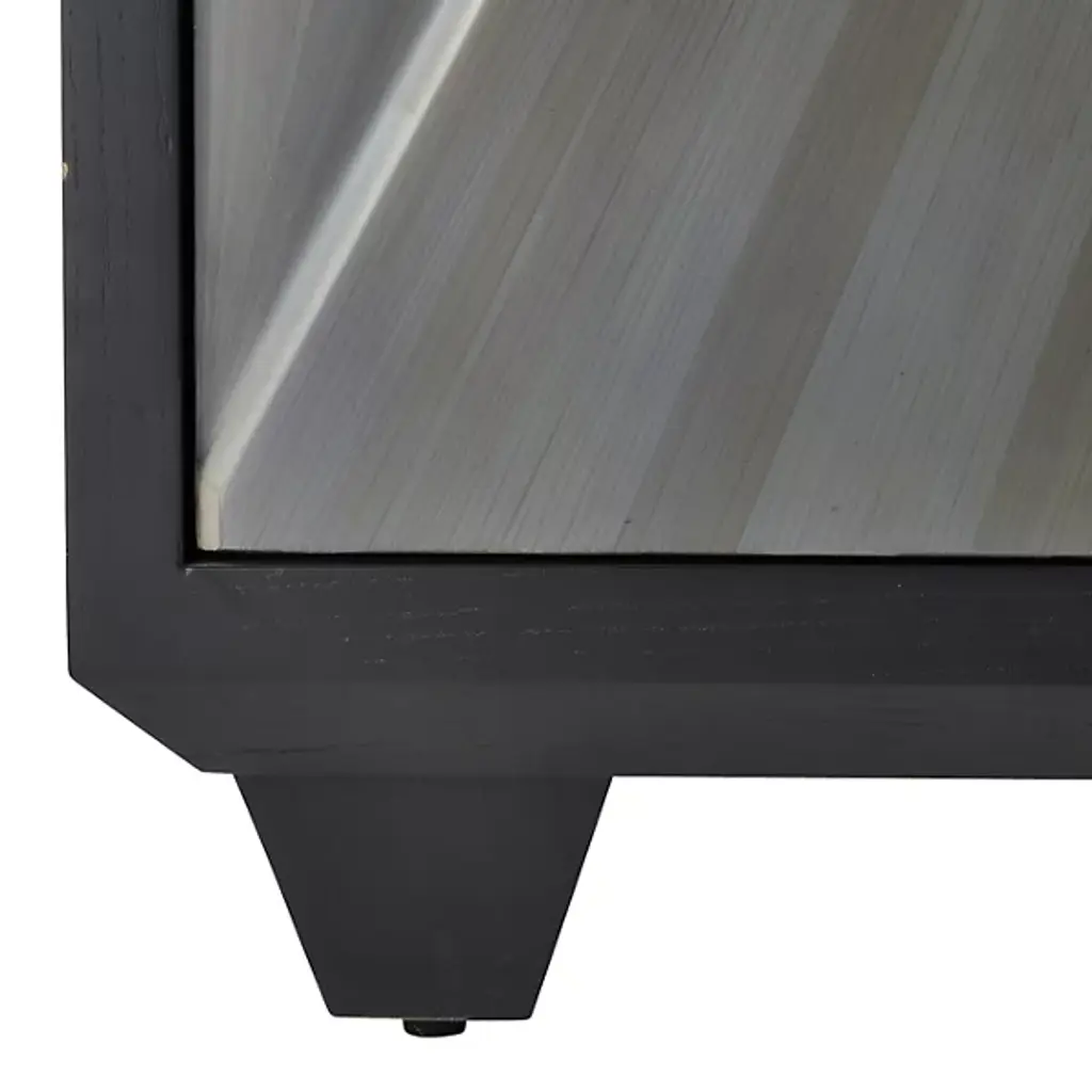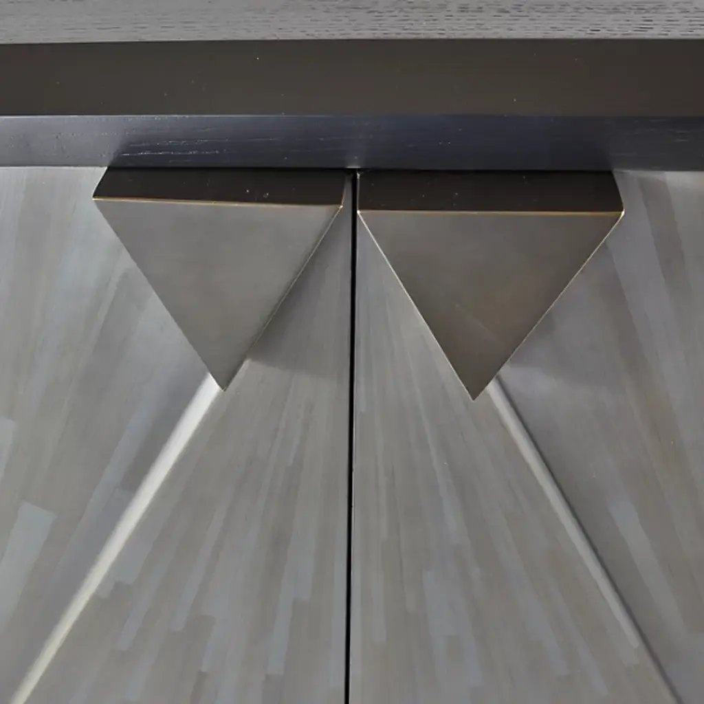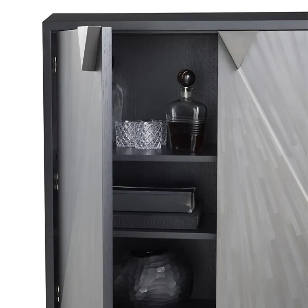 Inspired by the timeless artistry of gray straw marquetry, the Ellington Cabinet from Arteriors showcases boiled straw meticulously applied in armor-like faceted patterns that beautifully reflect light. Accented with elegant triangular iron bronze pulls, the two doors open on adjustable hinges to reveal ample shelving inside. This exquisite piece is framed in ebony oak veneer, ensuring durability and sophistication. Each cabinet features unique finishes, making it a distinctive addition to any home decor, seamlessly blending classic techniques with modern functionality.