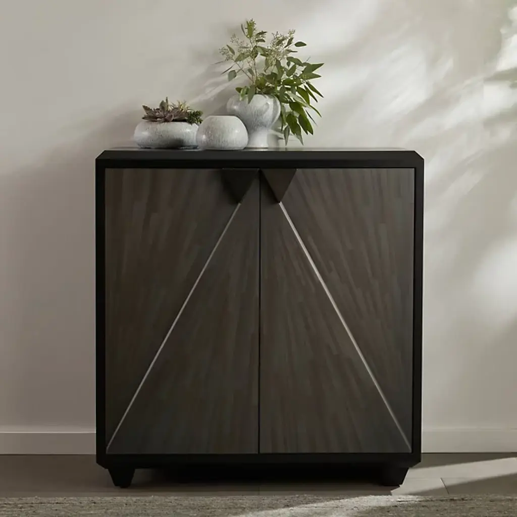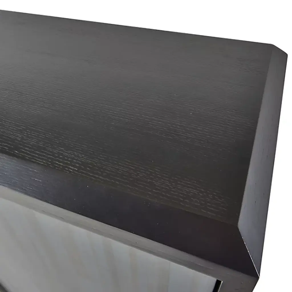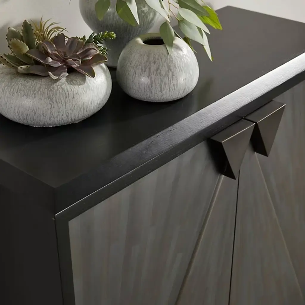 Inspired by the timeless artistry of gray straw marquetry, the Ellington Cabinet from Arteriors showcases boiled straw meticulously applied in armor-like faceted patterns that beautifully reflect light. Accented with elegant triangular iron bronze pulls, the two doors open on adjustable hinges to reveal ample shelving inside. This exquisite piece is framed in ebony oak veneer, ensuring durability and sophistication. Each cabinet features unique finishes, making it a distinctive addition to any home decor, seamlessly blending classic techniques with modern functionality.