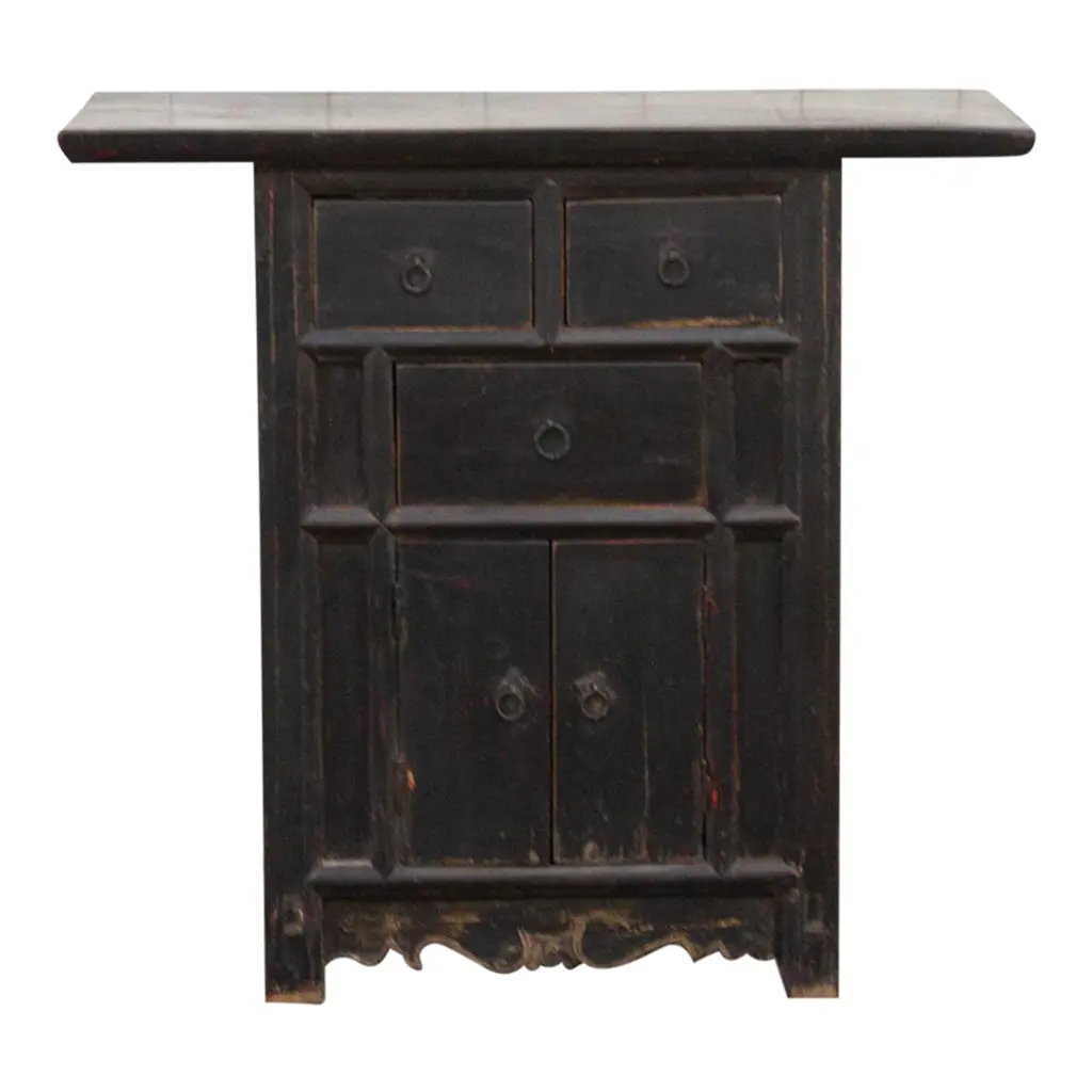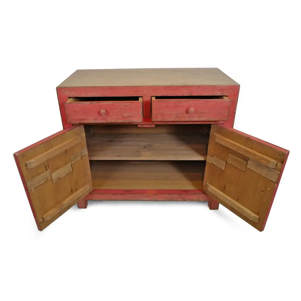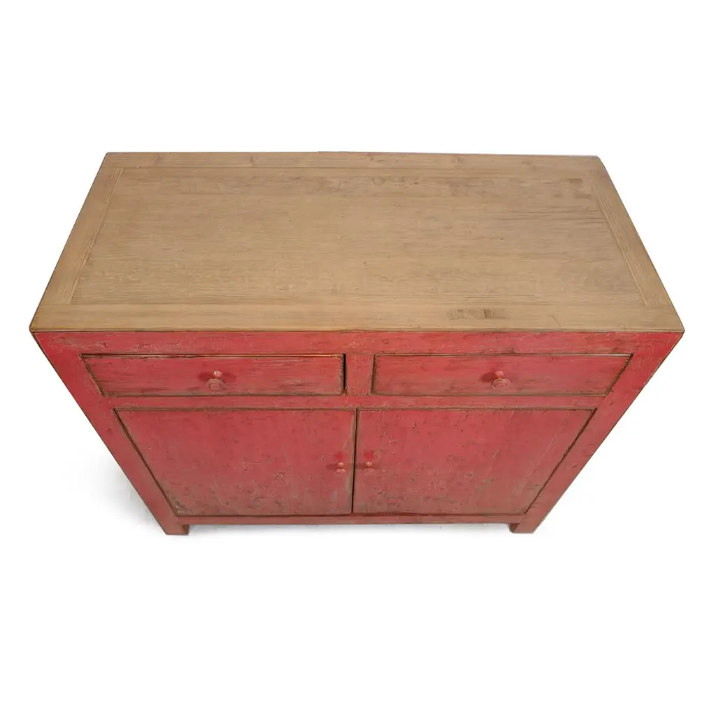 Vintage style salvaged distressed elm wood persimmon cabinet. Cabinet space below and two drawers above. Each varies in exact patina and worn finish.