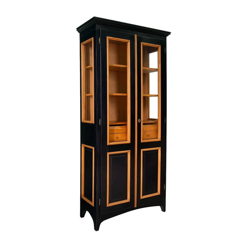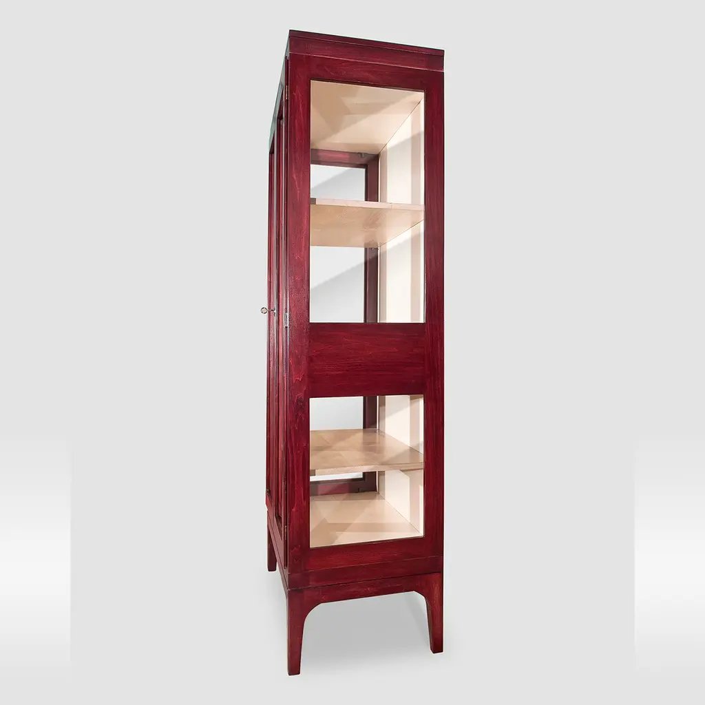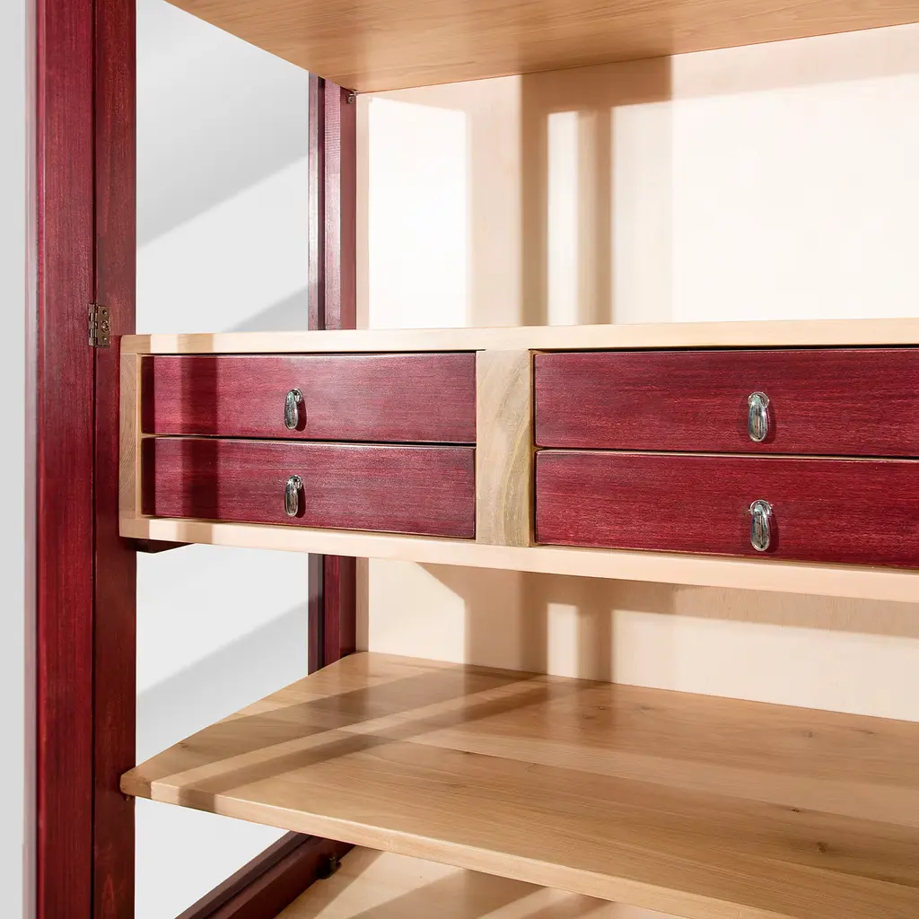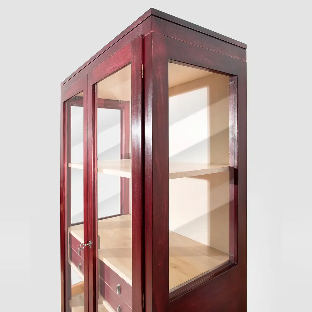 Sober lines and superb details characterize this refined display cabinet in solid lime finished with beeswax, partially stained in red and partially showcased in its natural finish. Raised on legs, the structure features four drawers - equipped with metal knobs and double dovetail joints - and shelves revealed by the glass also incorporated in the doors. The double-hook lock ensures a smooth, long-lasting use. Ask the Concierge for customizations. Clear instructions favor a quick assembly.
