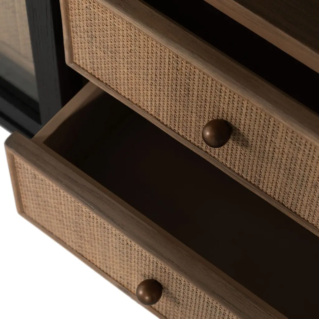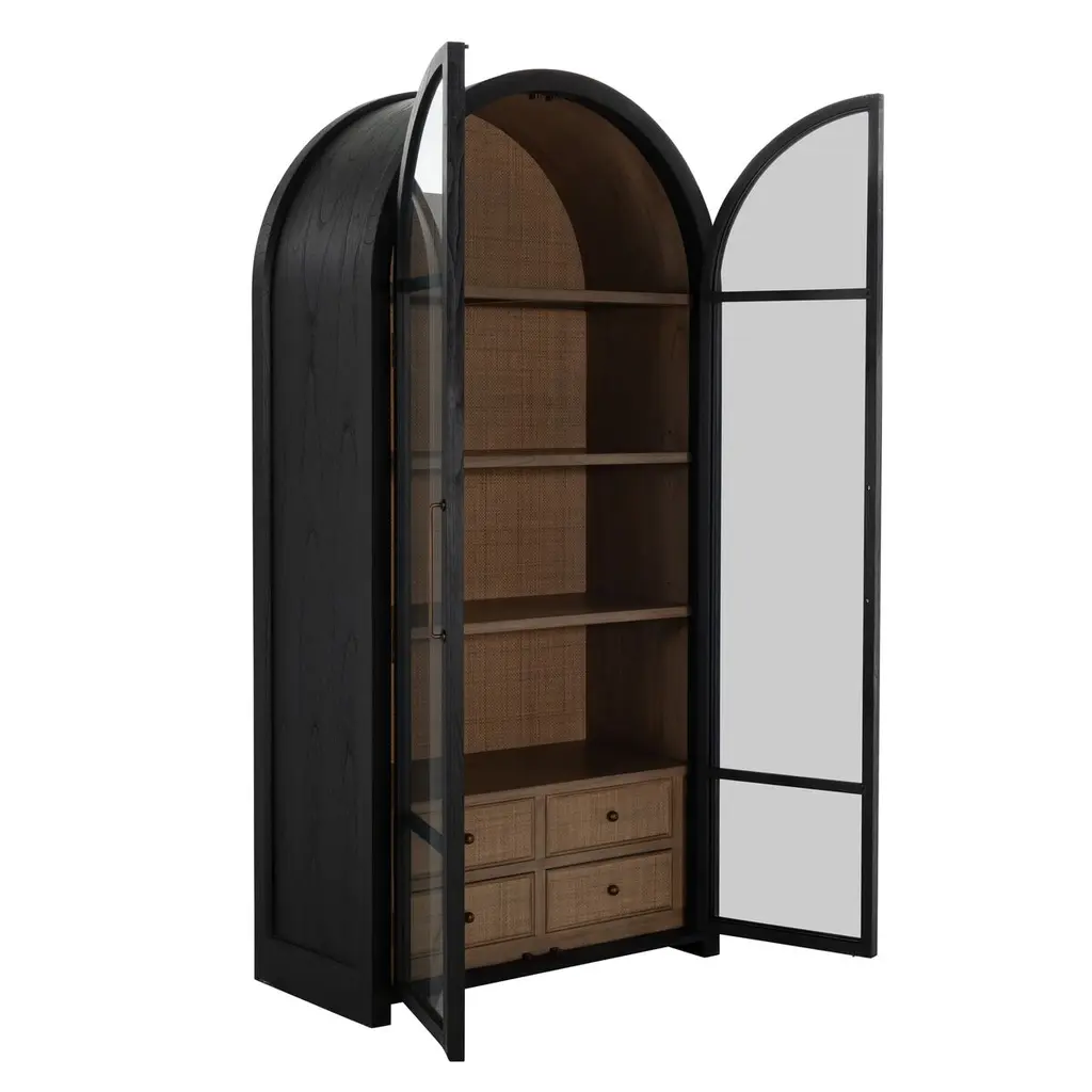The Elsa Cabinet combines the romantic allure of classic design with the functionality of modern furniture. Its contrasting tones and arched top exude a sense of European elegance and versatility in styling, while the woven texture on the backside of the cabinet and on the drawers adds depth and interest, creating a tactile experience. Its aesthetic is striking and inviting, making it a delightful addition to any room looking to balance beauty and practicality. The Elsa Cabinet is perfect for showcasing fine china, storing a collection of books, or organizing linens essentials.