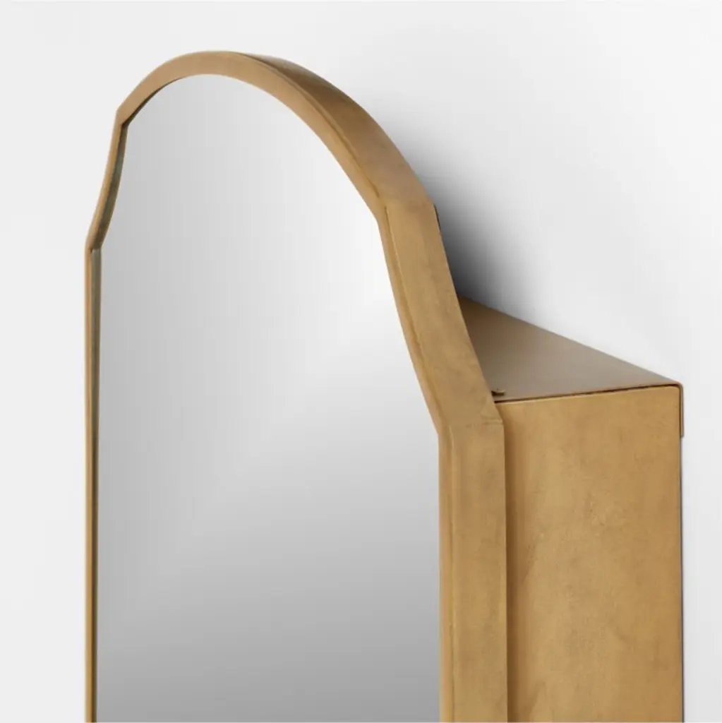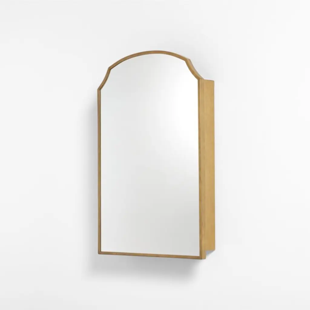 Straight from the Middle Ages to your modern home, our Emmy medicine cabinet reimagines the classic Tudor arch. Also called a four-centered arch, this elegant shape adds subtle architectural interest to the mirrored cabinet's clean-lined frame of brass-finished iron. Three interior glass shelves offer plenty of space for essentials, and the door closes magnetically. We especially love the look of this medicine cabinet in an en suite bathroom with a coordinating Emmy wall or floor mirror in the adjoining bedroom.
