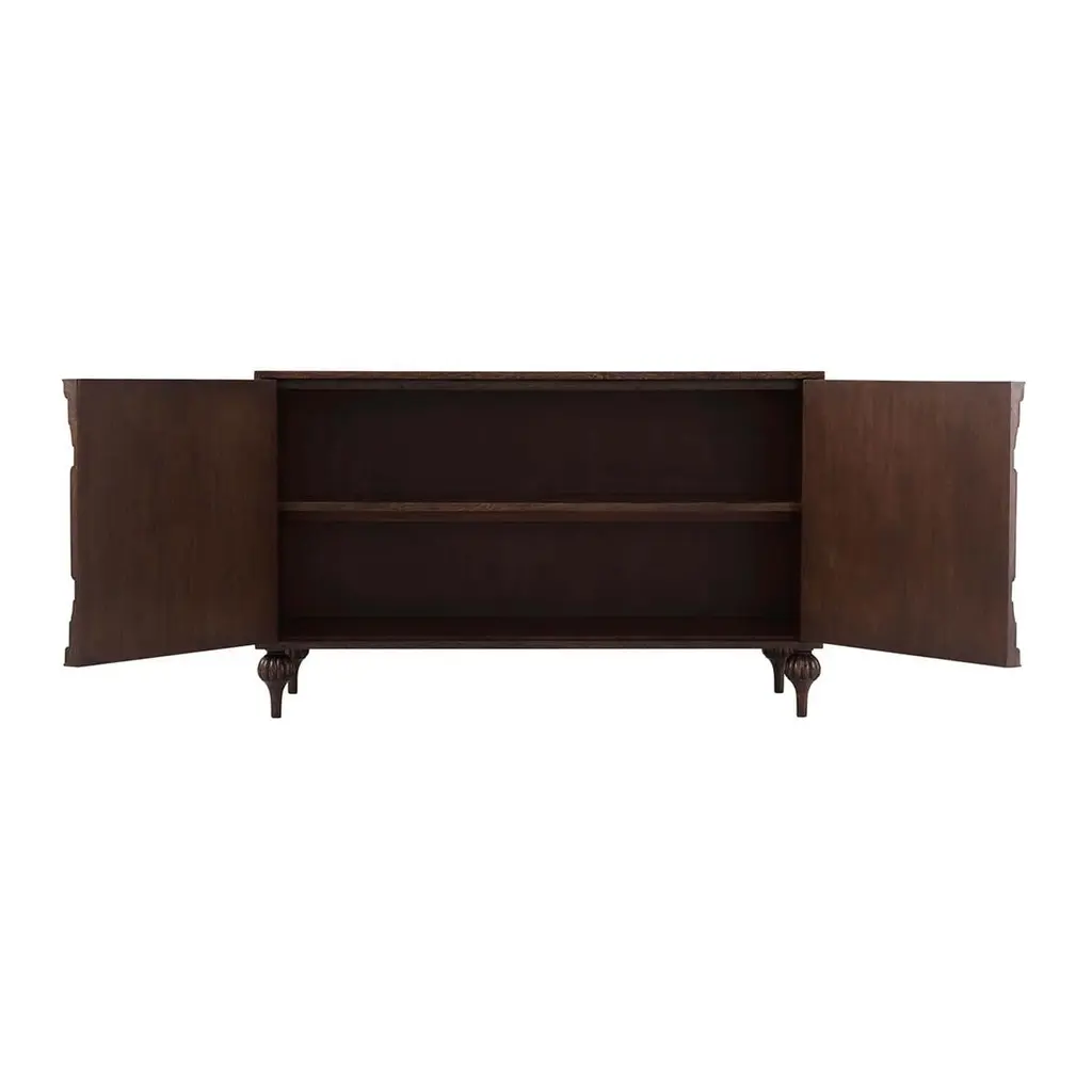 An English country oak cabinet, a solid oak and reclaimed oak veneered cabinet, with rectangular planked top and sides, two multiple step paneled doors with an outer border of egg & dart carving and further bands of acanthus and bell-flower carving; each door centered by a bronzed ring pull, on unusual lobed bun feet raised. The interior with one adjustable shelf. Dimensions: 52" W x 22" D x 32" H.